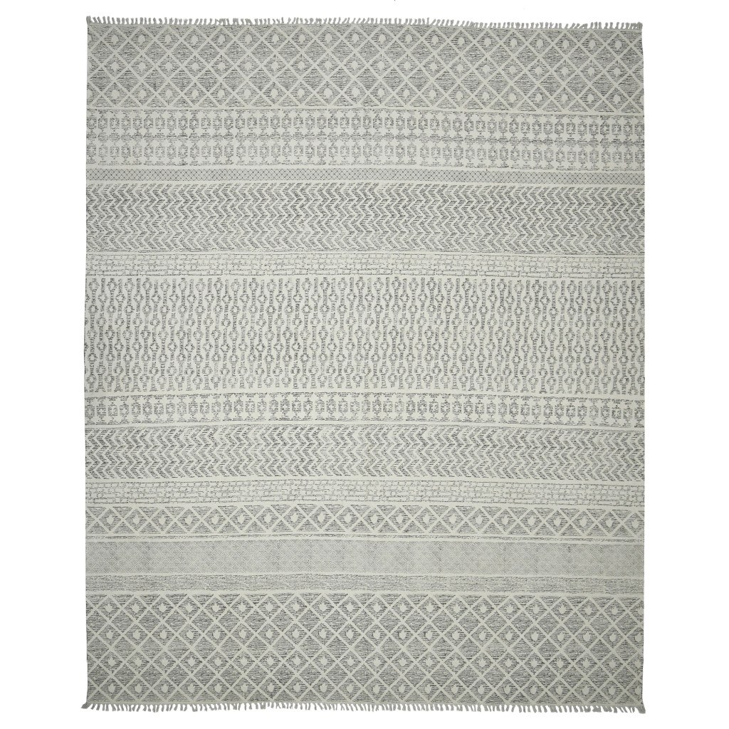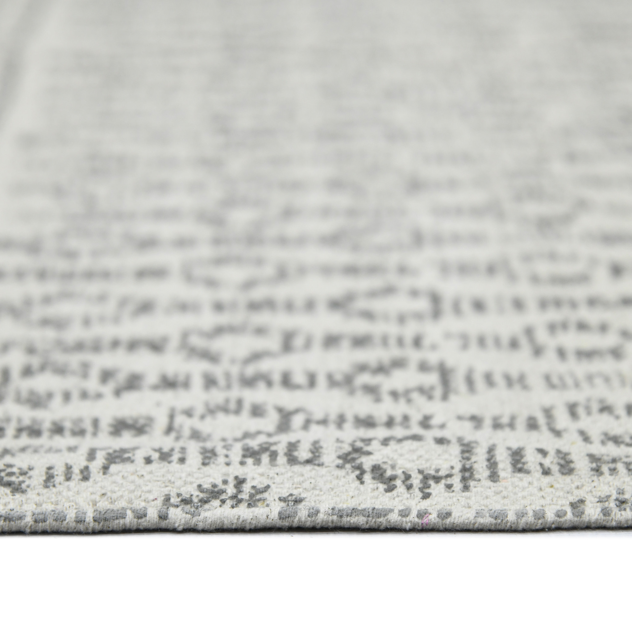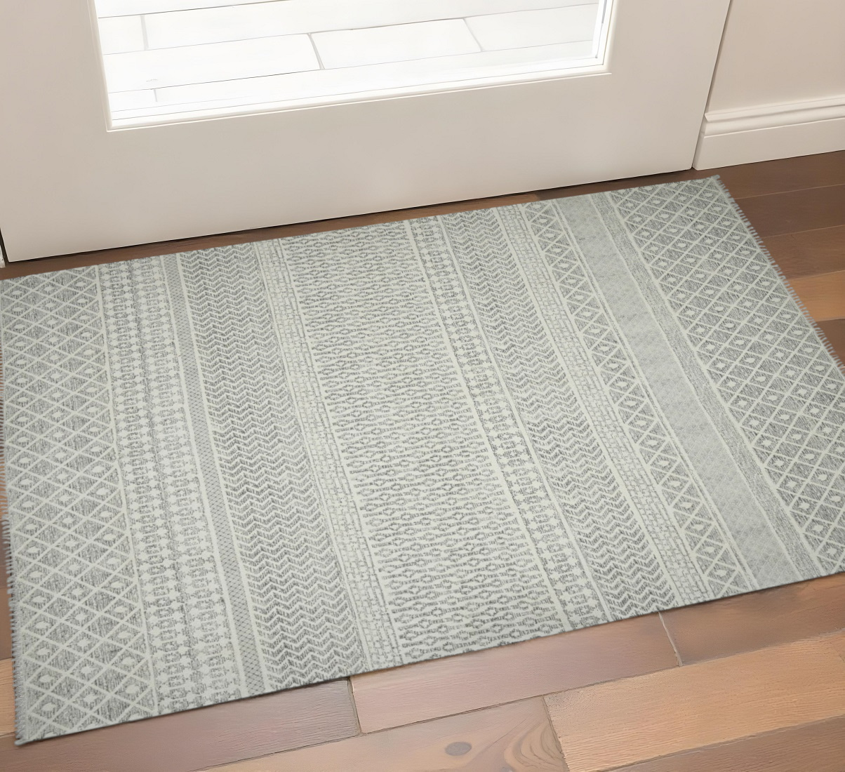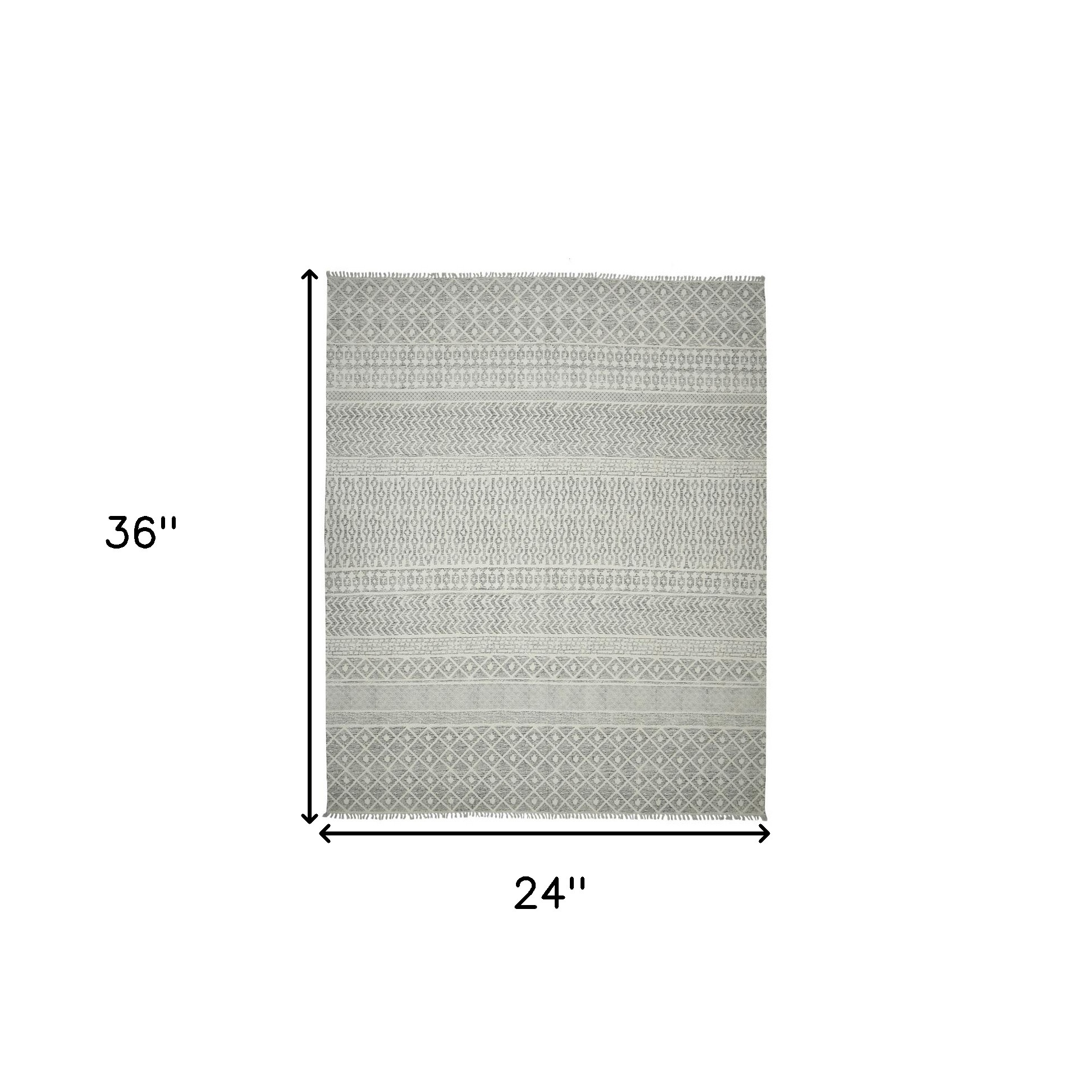 Add great coloration and comfortable texture to your space with this 2-foot x 3-foot gray and ivory geometric flatweave handmade distressed area rug with fringe. Rugs are a great way to showcase your style, hide imperfections, warm your home and reduce noise. Tassel ends bring a timeless and fashionable look to your interior. This smaller sized, contemporary styled rug is just what you need for your walkway, bedside, in front of door, cabinet, refrigerator, or chair. 24.00-inch h x 36.00-inch w x 0.20-inch d.