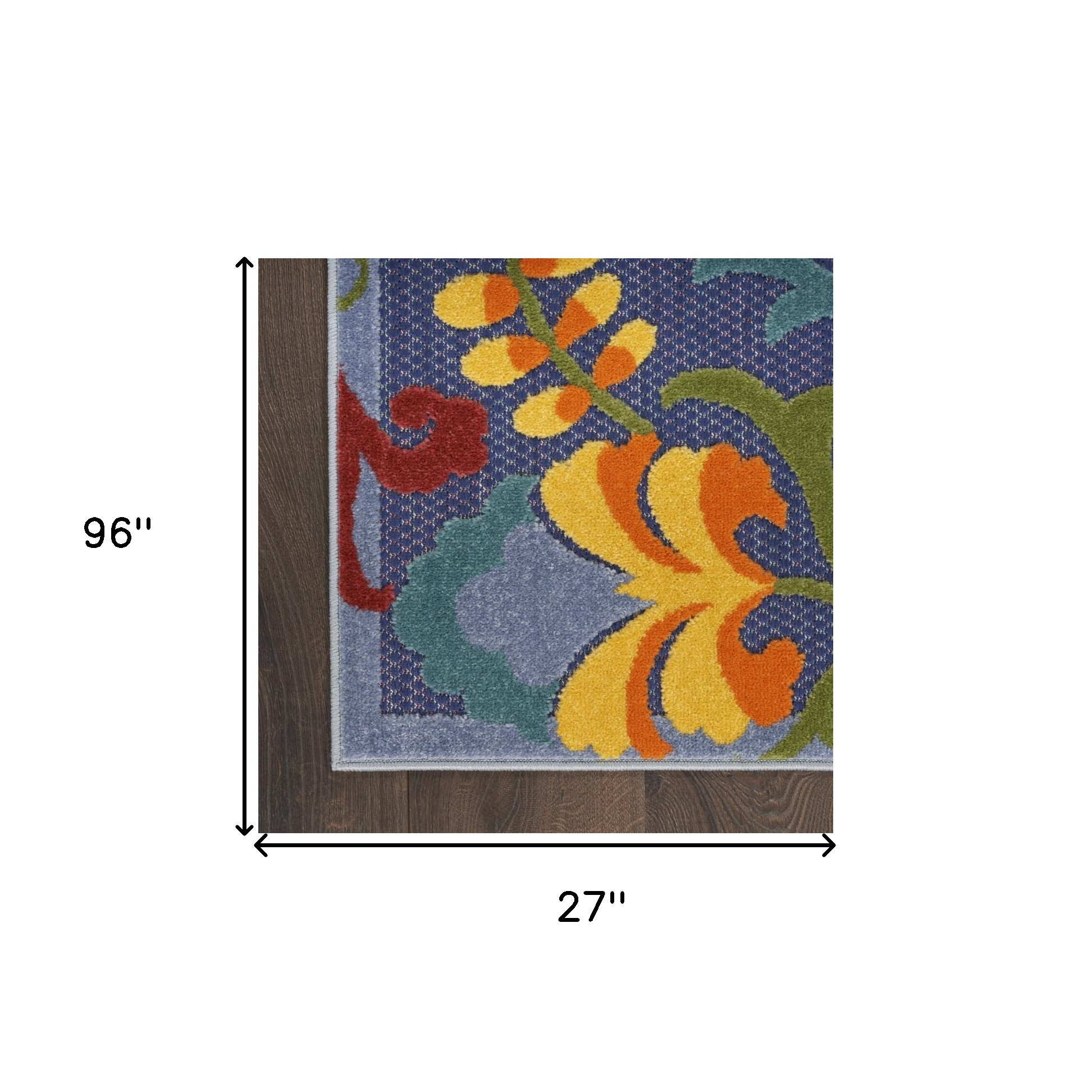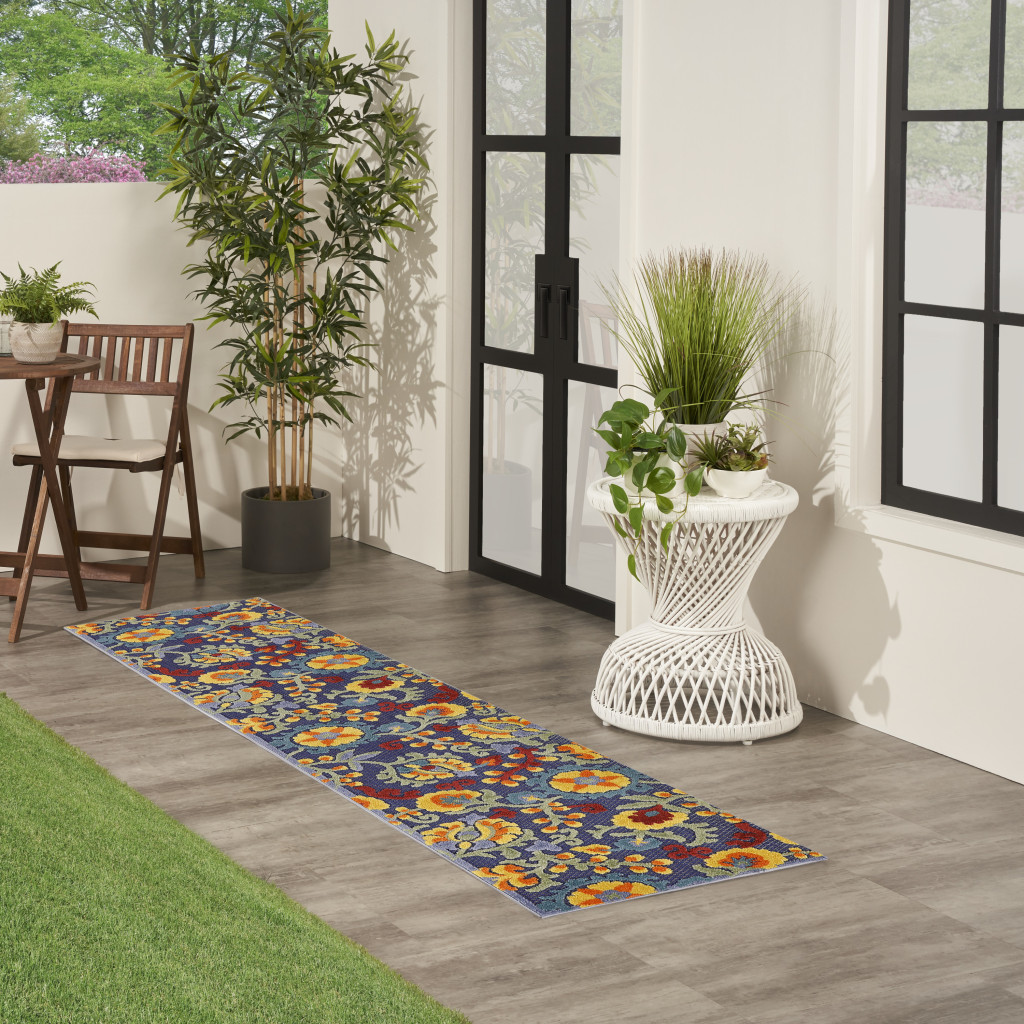 Set an inviting tone in your space with this 8-foot runner blue and ivory floral indoor outdoor runner rug. This runner shaped rug features a floral design in blue and ivory to give it visual interest. A classic shape marries with good looking design for your space area rugs help to give warmth and sense of home to your space. 27-inch H x 96-inch W x 0.25-inch D