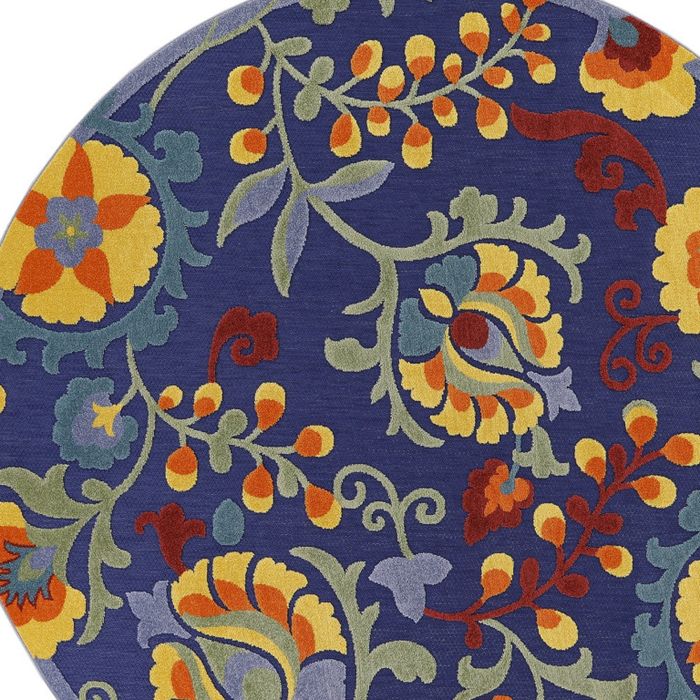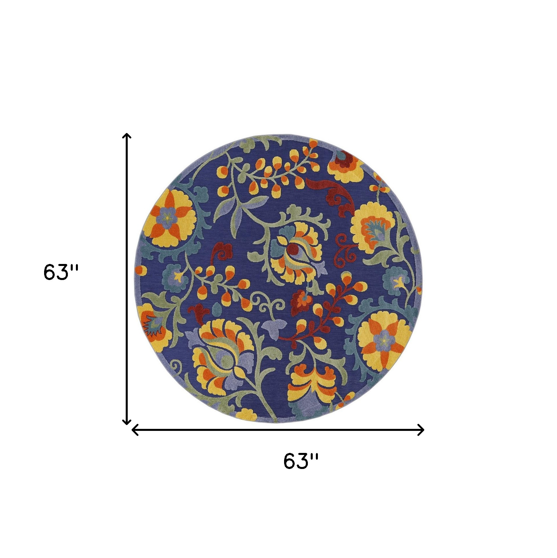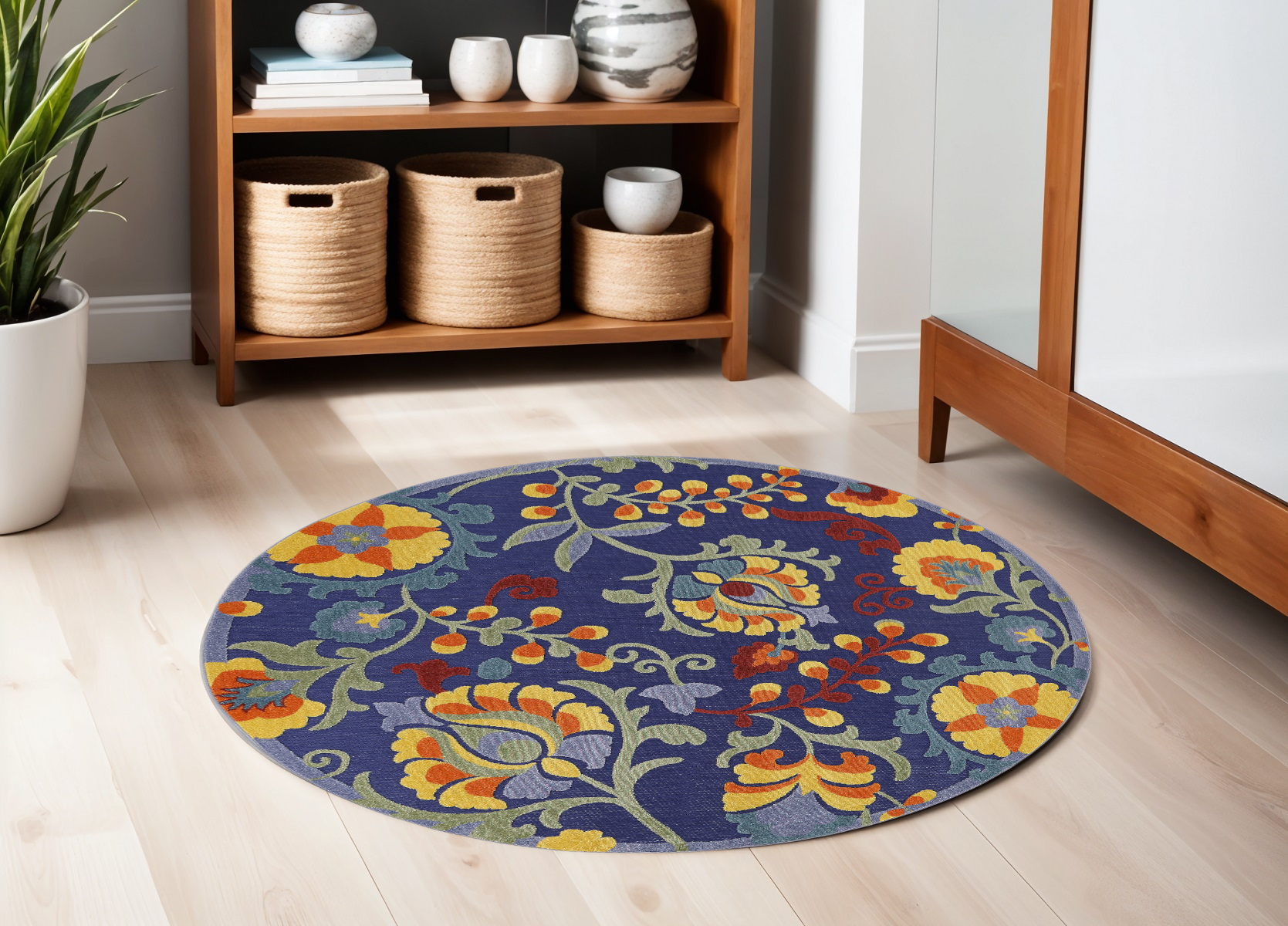 Set an inviting tone in your space with this 5-foot round blue and ivory round floral indoor outdoor area rug. This geometric round shaped rug features a floral pattern in blue and ivory that combines a good looking print with a unique and updated shape. The mix of shape, color, and design gives this rug refreshing visual interest. Area rugs help to give warmth and sense of home to your space. 63-inch H x 63-inch W x 0.25-inch D