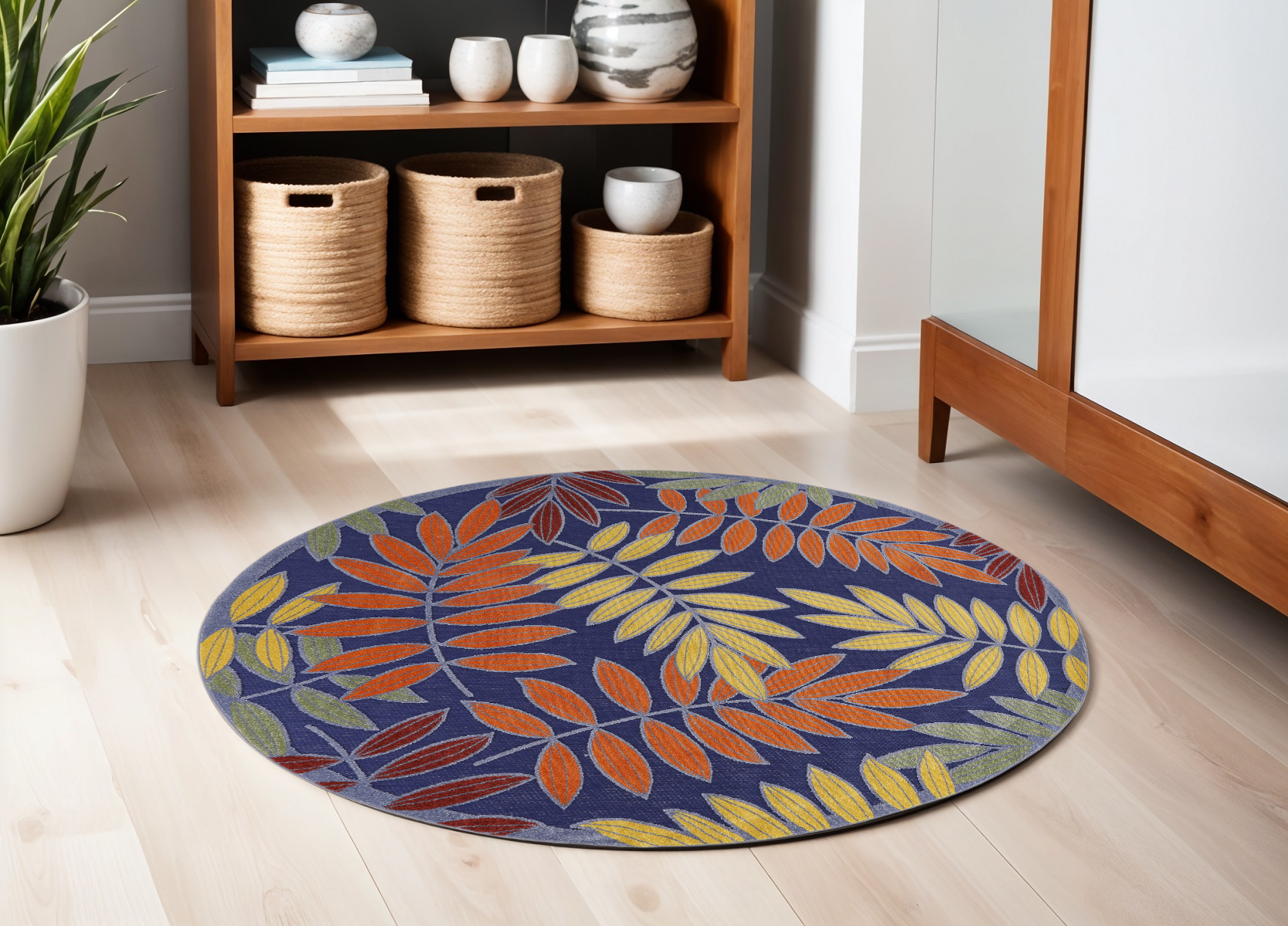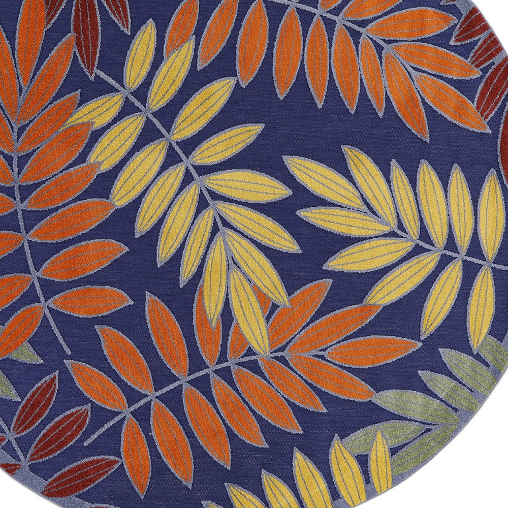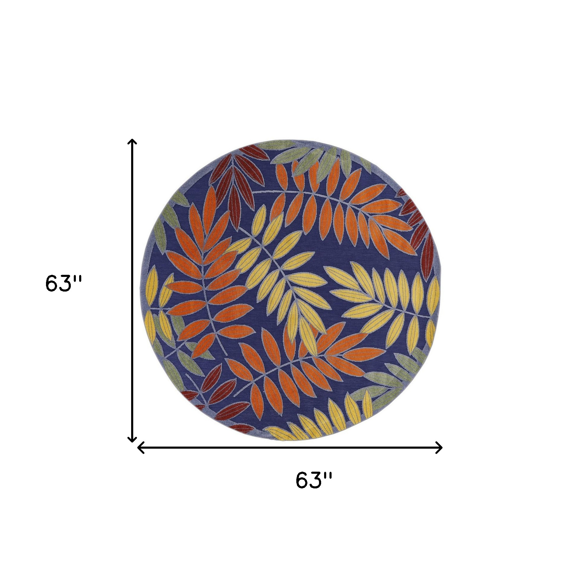 This 5-foot round blue and orange round floral indoor outdoor area rug, is a great way to add warmth to a room. This geometric round shaped rug features a floral pattern in blue and orange that combines a good looking print with a unique and updated shape. The mix of shape, color, and design gives this rug refreshing visual interest. Area rugs help to give warmth and sense of home to your space. 63-inch H x 63-inch W x 0.25-inch D