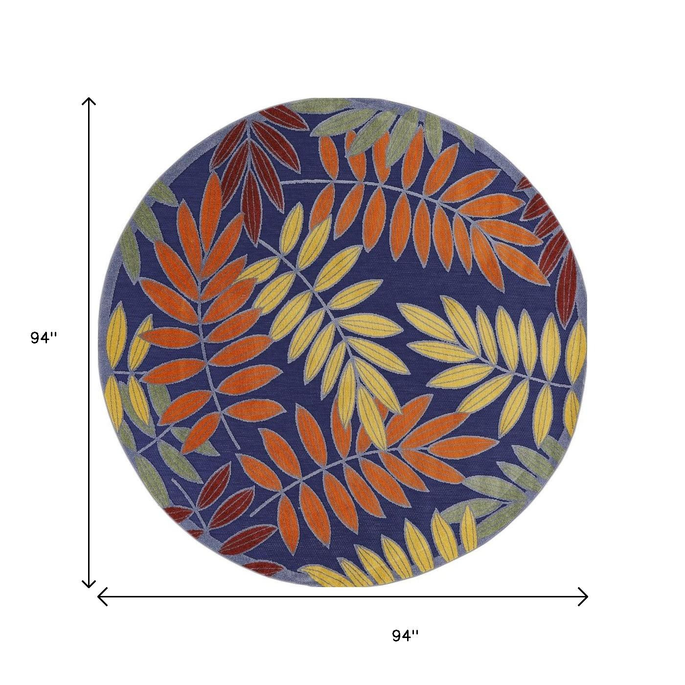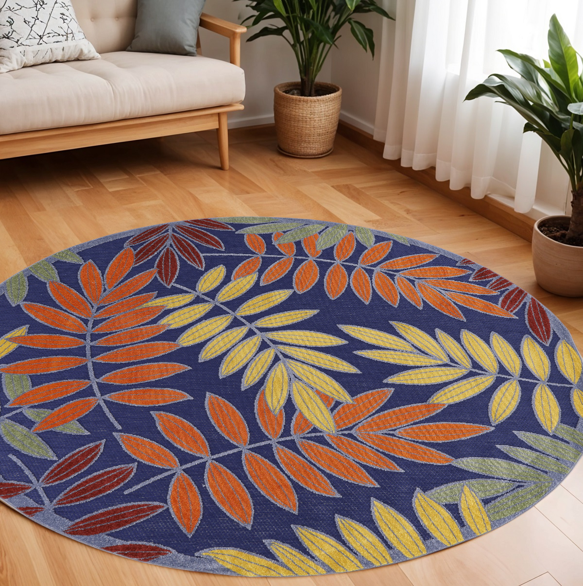 Add some artistry to your room with this 8-foot round blue and orange round floral indoor outdoor area rug. This geometric round shaped rug features a floral pattern in blue and orange that combines a good looking print with a unique and updated shape. The mix of shape, color, and design gives this rug refreshing visual interest. Place this area rug against a hardwood or tile floor and it will enliven your living space with style and sophistication. 94-inch H x 94-inch W x 0.25-inch D
