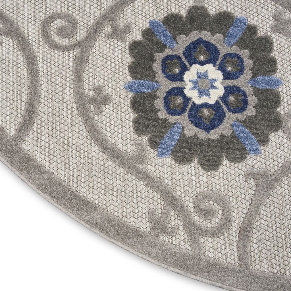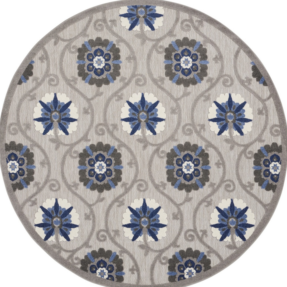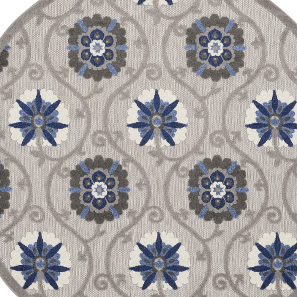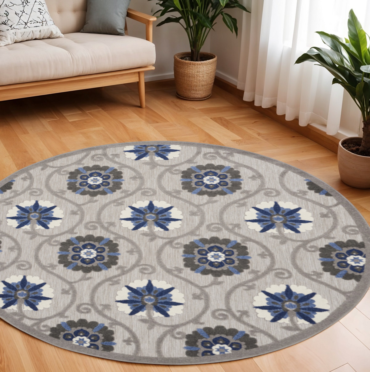 floral indoor outdoor area rug, indoor outdoor area rug, outdoor area rug, blue gray round floral indoor, gray round floral indoor outdoor |
