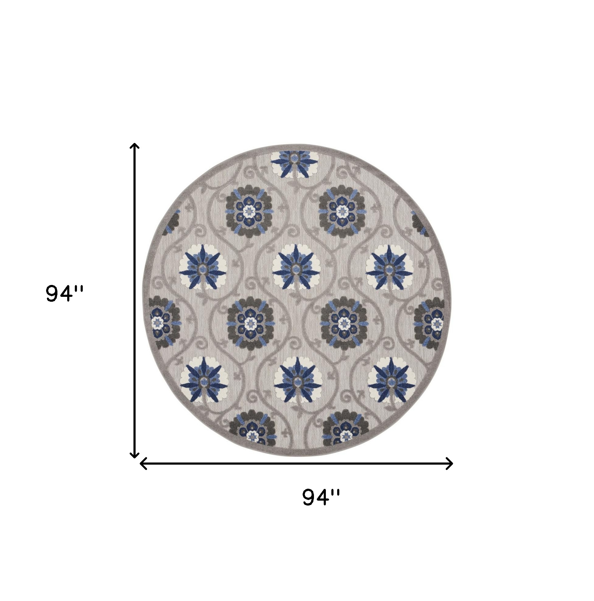 This 8-foot round blue and gray round floral indoor outdoor area rug, is a great way to add warmth to a room. This geometric round shaped rug features a floral pattern in blue and gray that combines a good looking print with a unique and updated shape. The mix of shape, color, and design gives this rug refreshing visual interest. Area rugs help to give warmth and sense of home to your space. 94-inch H x 94-inch W x 0.25-inch D