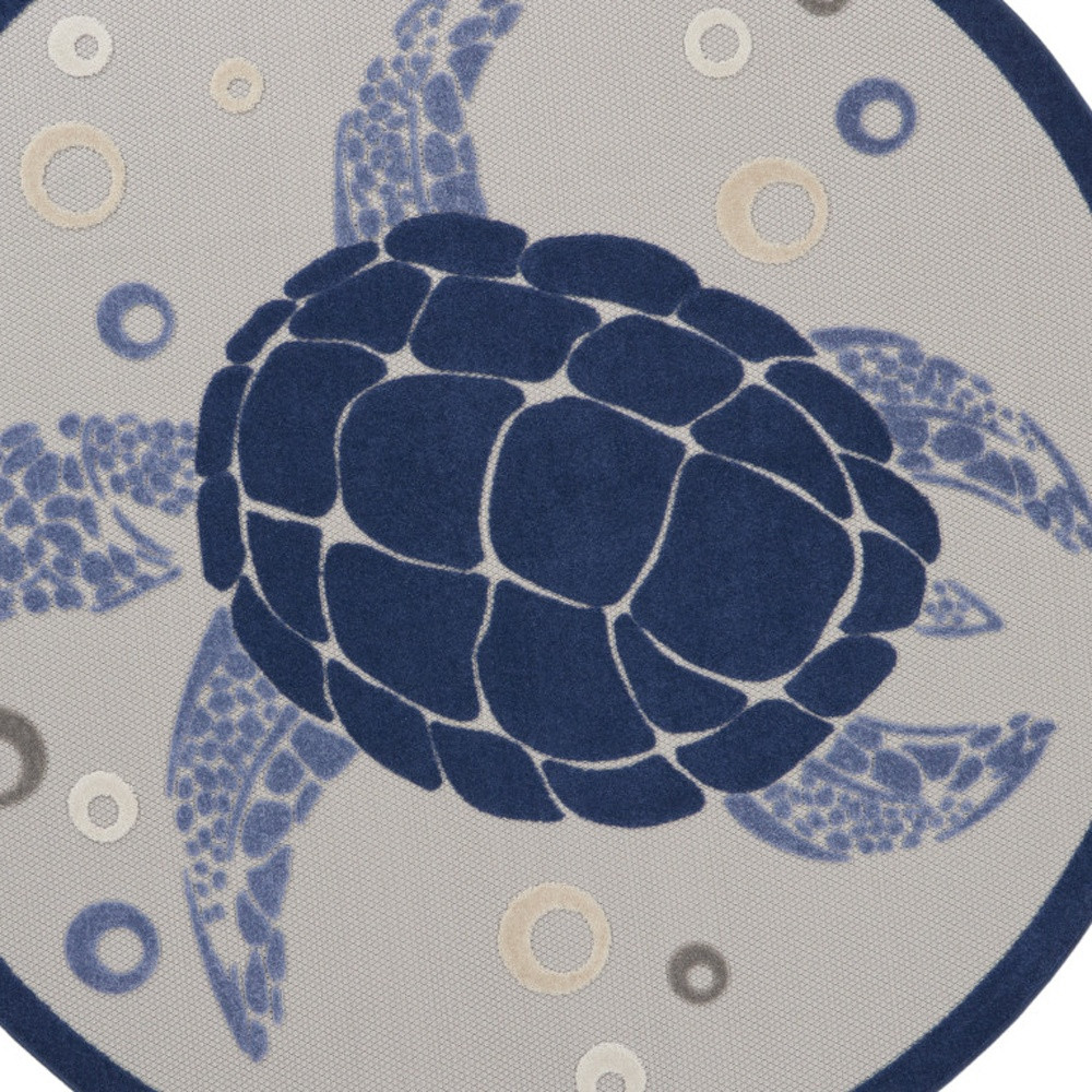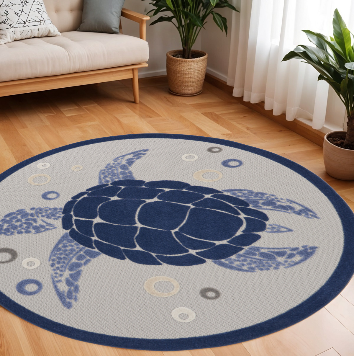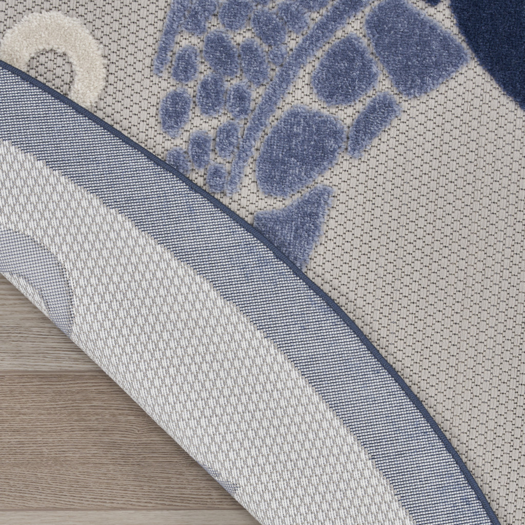 Set an inviting tone in your space with this 8-foot round blue and gray round animal print indoor outdoor area rug. This geometric round shaped rug features a animal print pattern in blue and gray that combines a good looking print with a unique and updated shape. The mix of shape, color, and design gives this rug refreshing visual interest. Area rugs help to give warmth and sense of home to your space. 94-inch H x 94-inch W x 0.25-inch D