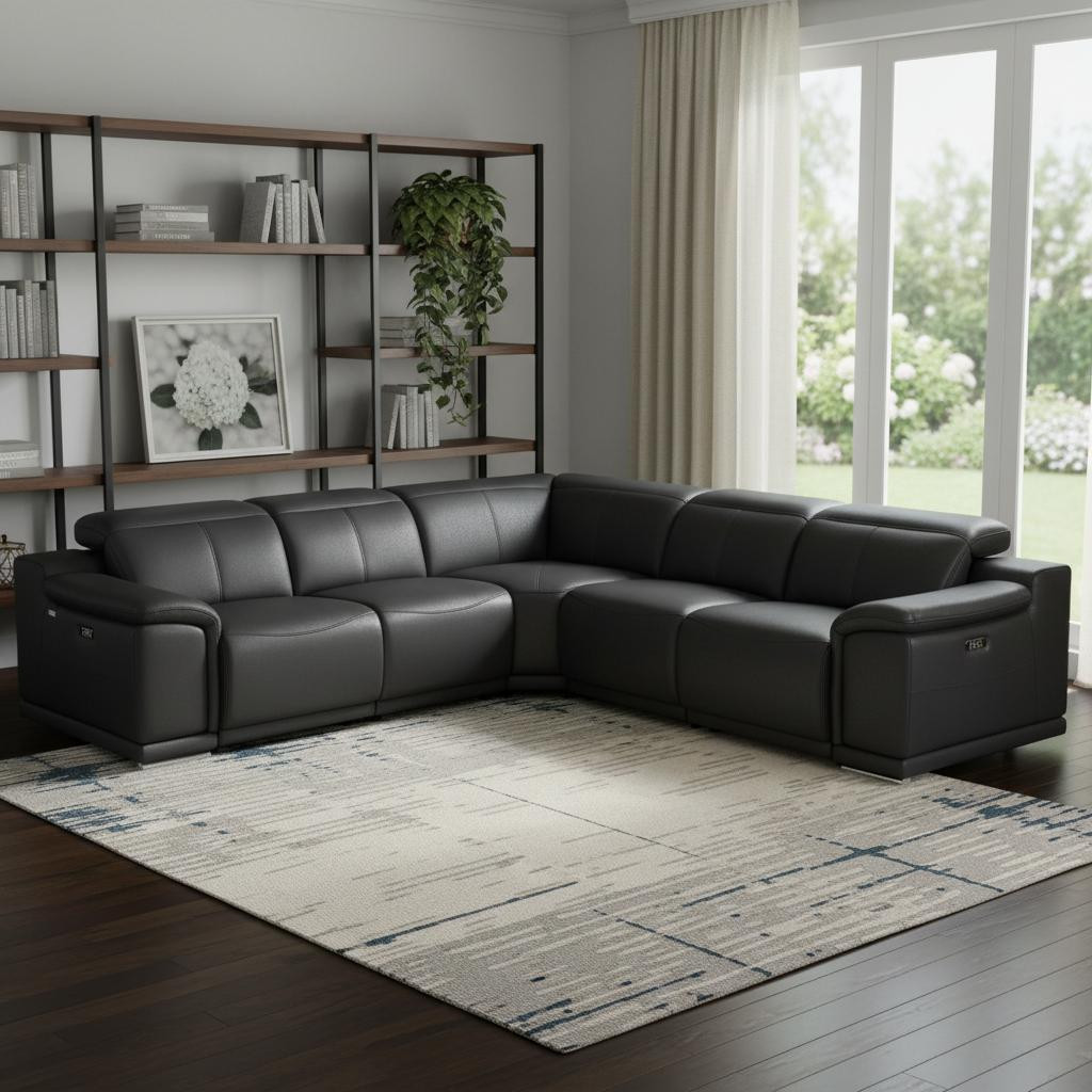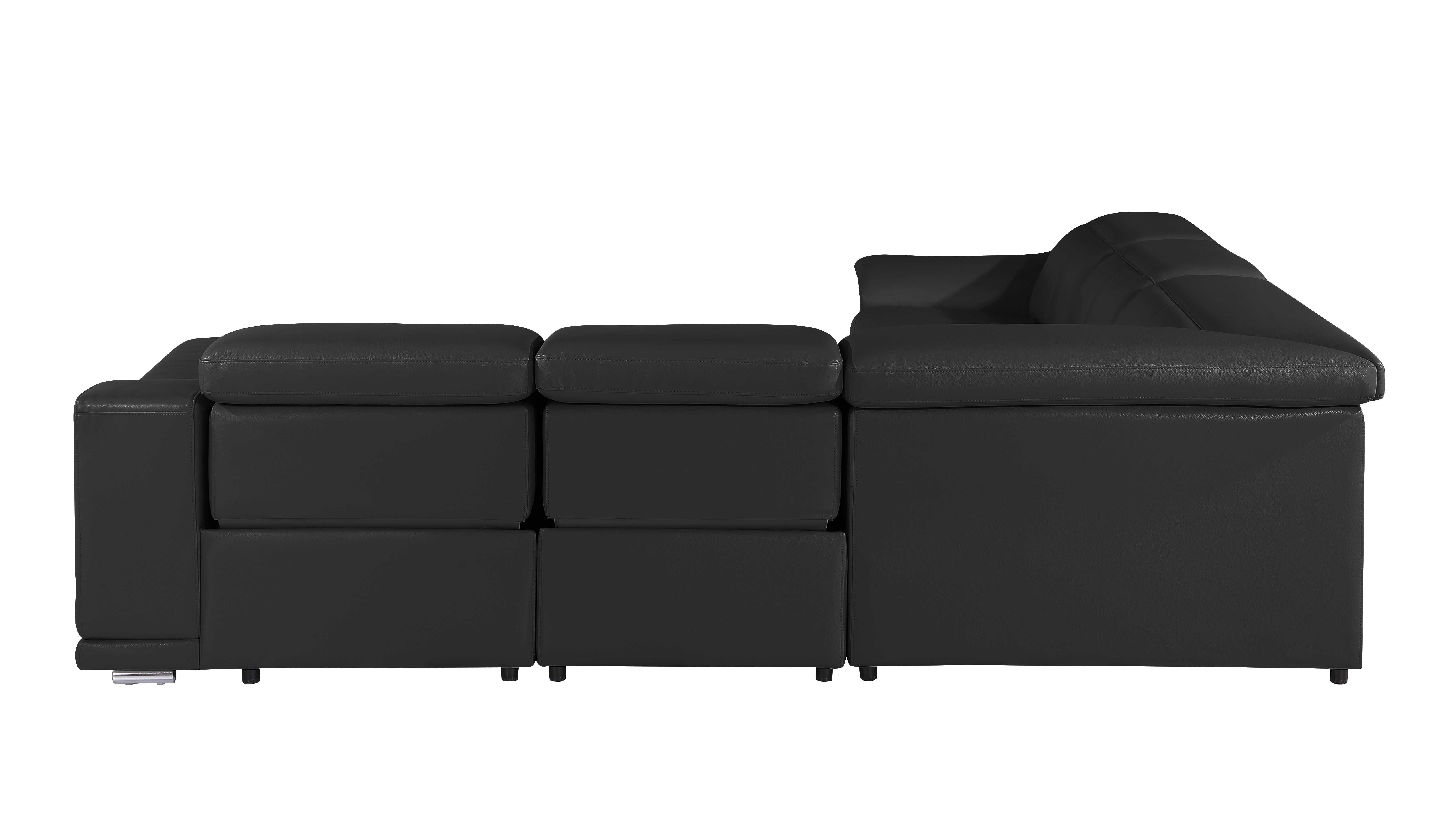 Made of the highest quality, supple leather, this black italian leather modular l shaped five piece corner sectional will be the star of your space. The high-grade premium leather used makes your lounging luxuriously comfortable and adds an elegant appeal to your space. Solid colors give you lots of decorative options and are easy to work into your decor scheme. Flared arms offer a comfy place to rest. Power - push button recline allows you to truly rest, lounge and even sleep comfortably. Silver metal legs effortlessly elevate the room and add a touch of contemporary design. A great showpiece for your room, this sectional is a must have. 35.00-inch h x 110.00-inch w x 110.00-inch d.