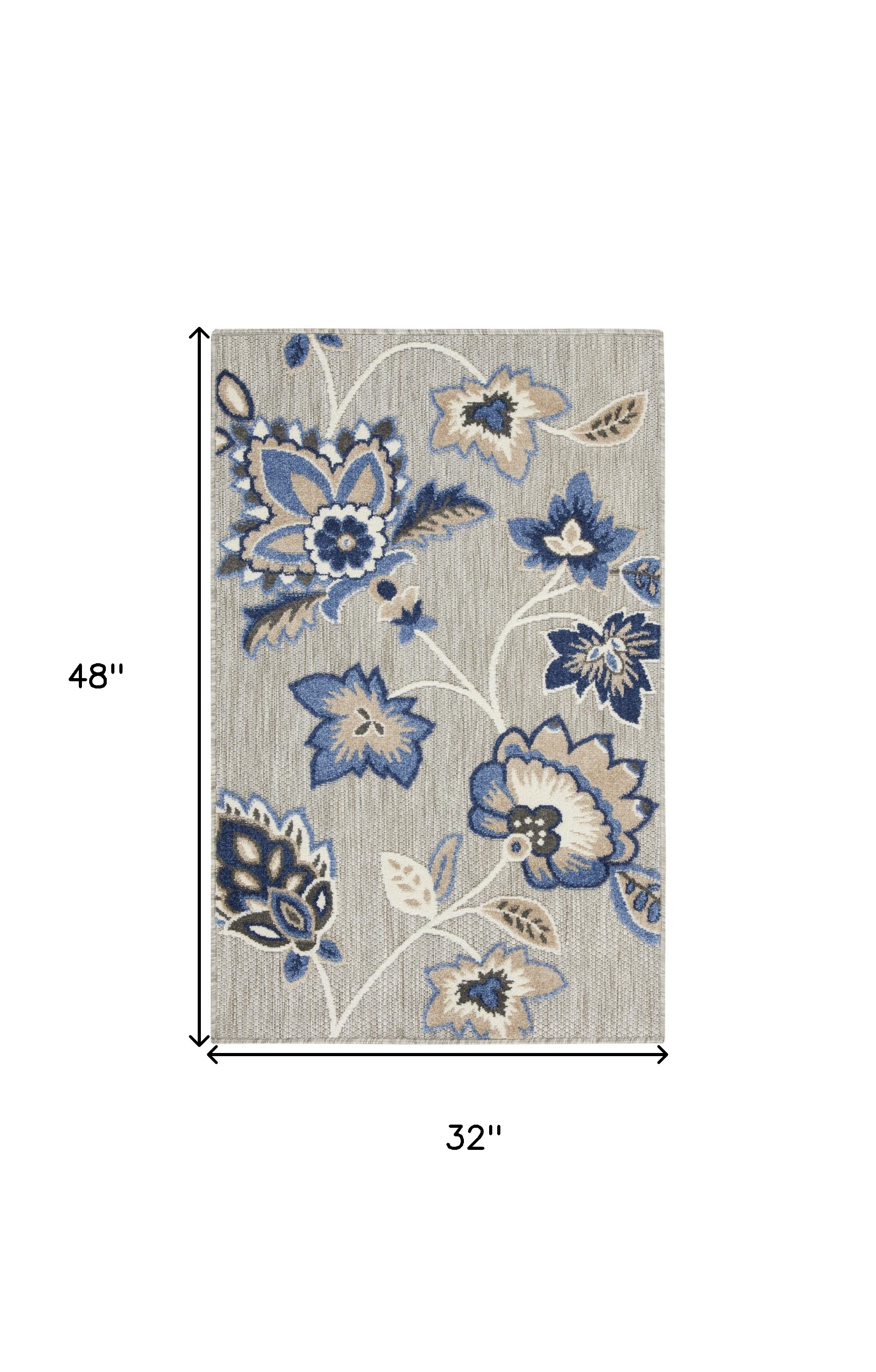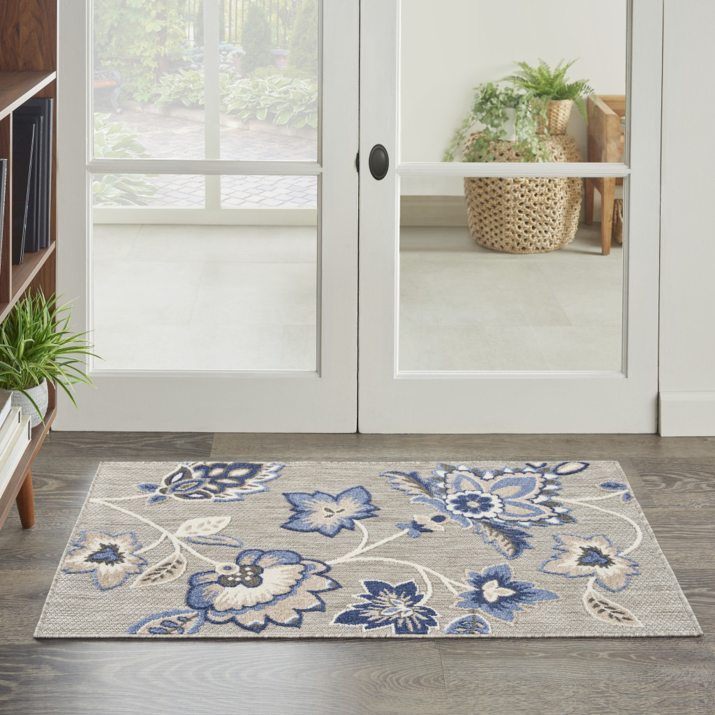 Add great coloration and comfortable texture to your space with this 3-foot x 4-foot blue and gray floral indoor outdoor area rug. This rectangle shaped rug features a floral design in blue and gray to give it visual interest. A classic shape marries with good looking design for your space place this area rug against a hardwood or tile floor and it will enliven your living space with style and sophistication. 32-inch H x 48-inch W x 0.25-inch D