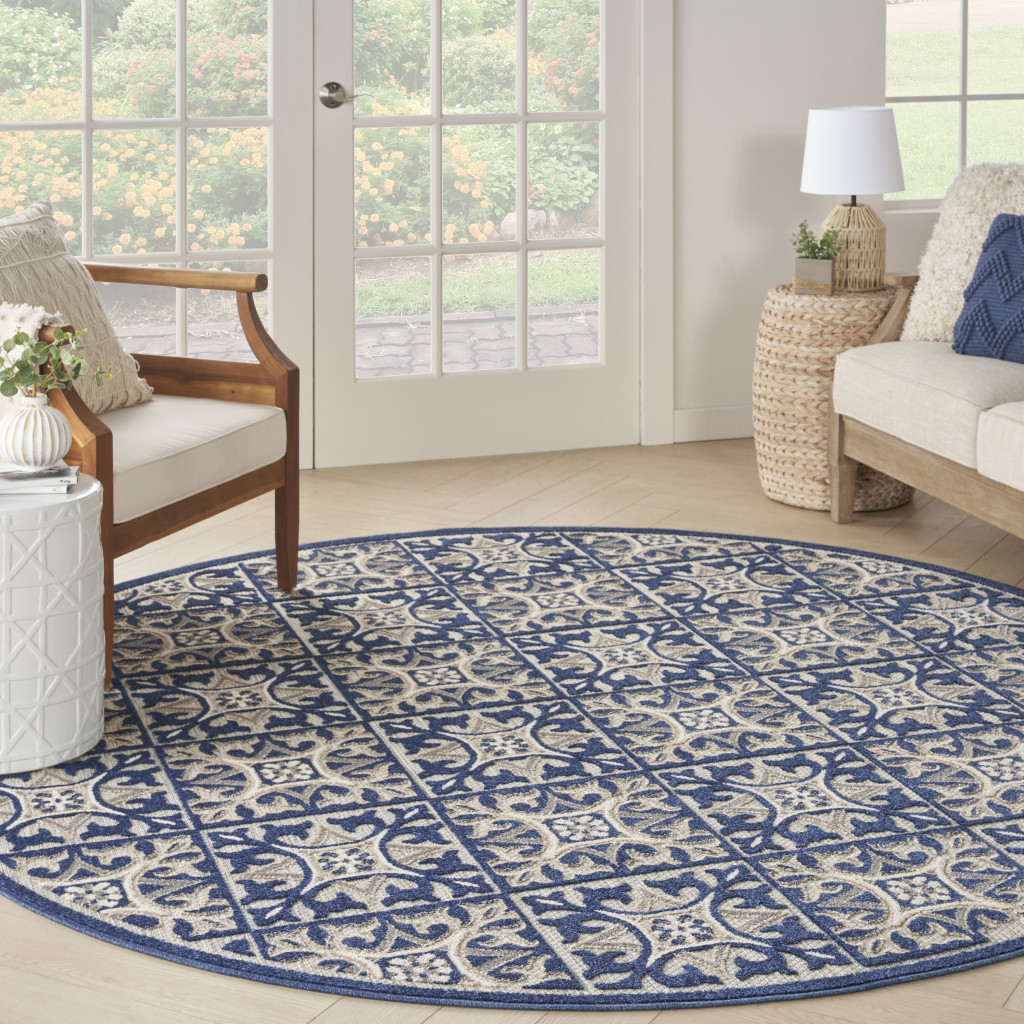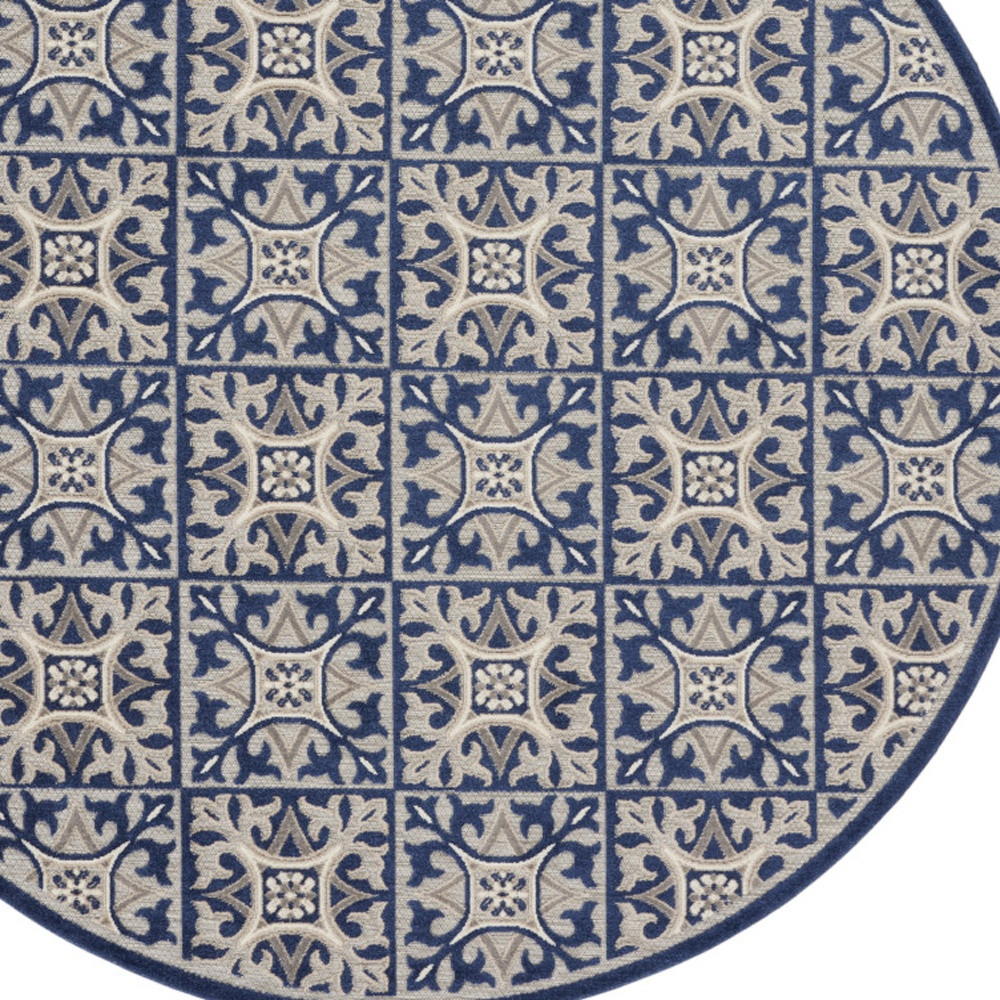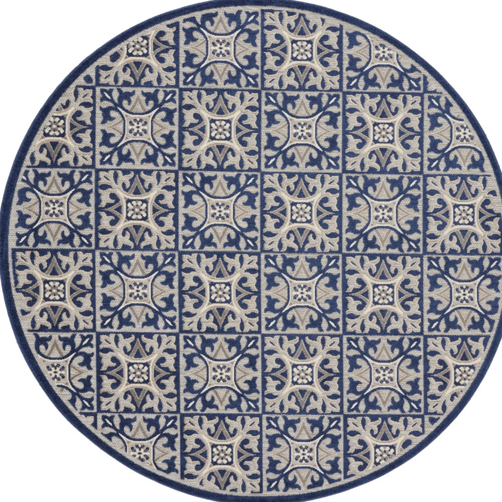 Set an inviting tone in your space with this 8-foot round blue and beige round geometric indoor outdoor area rug. This geometric round shaped rug features a geometric pattern in blue and beige that combines a good looking print with a unique and updated shape. The mix of shape, color, and design gives this rug refreshing visual interest. Area rugs help to give warmth and sense of home to your space. 94-inch H x 94-inch W x 0.25-inch D
