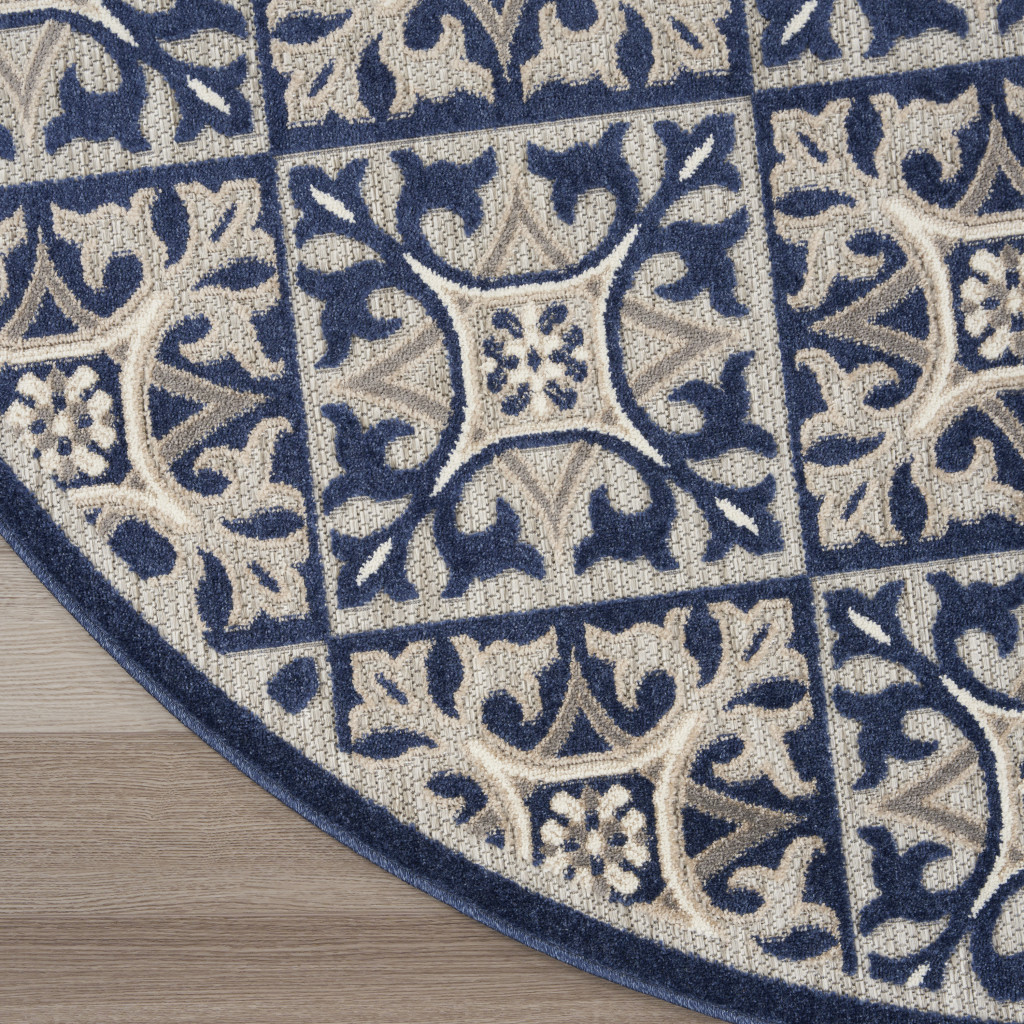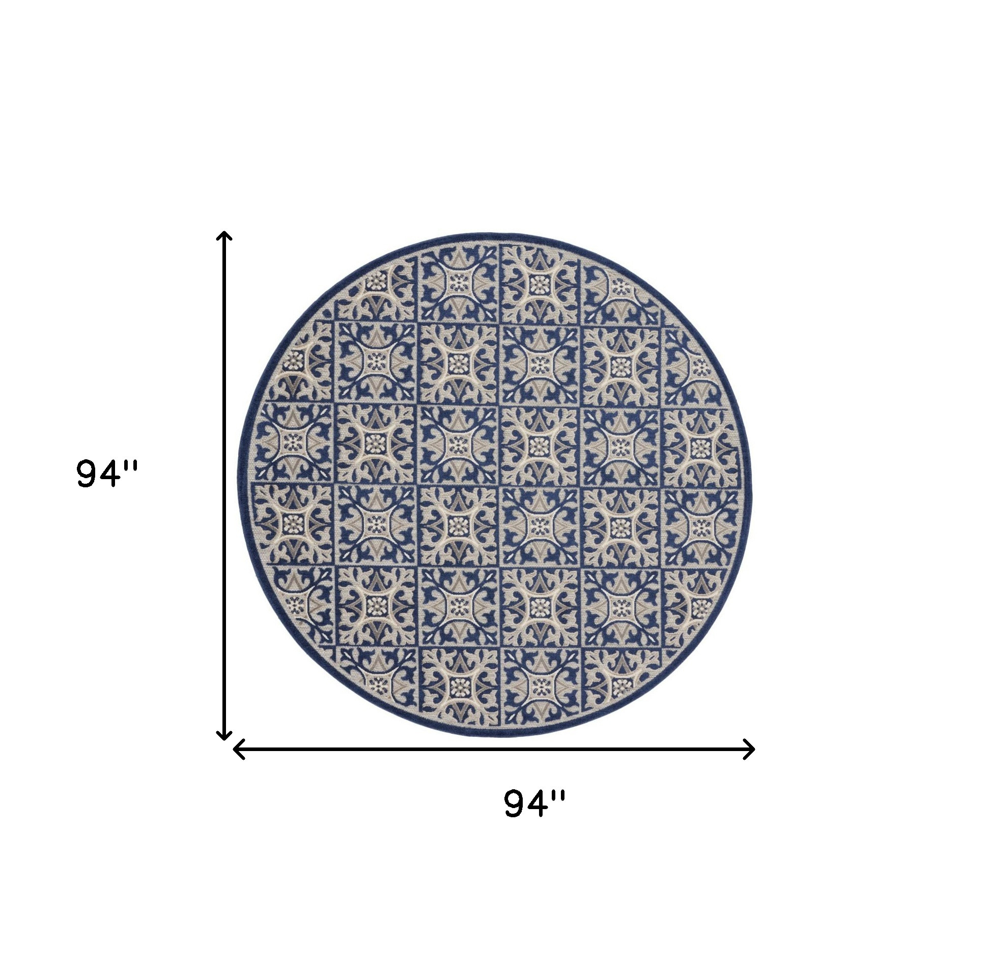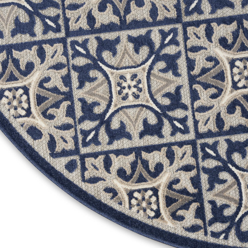Set an inviting tone in your space with this 8-foot round blue and beige round geometric indoor outdoor area rug. This geometric round shaped rug features a geometric pattern in blue and beige that combines a good looking print with a unique and updated shape. The mix of shape, color, and design gives this rug refreshing visual interest. Area rugs help to give warmth and sense of home to your space. 94-inch H x 94-inch W x 0.25-inch D