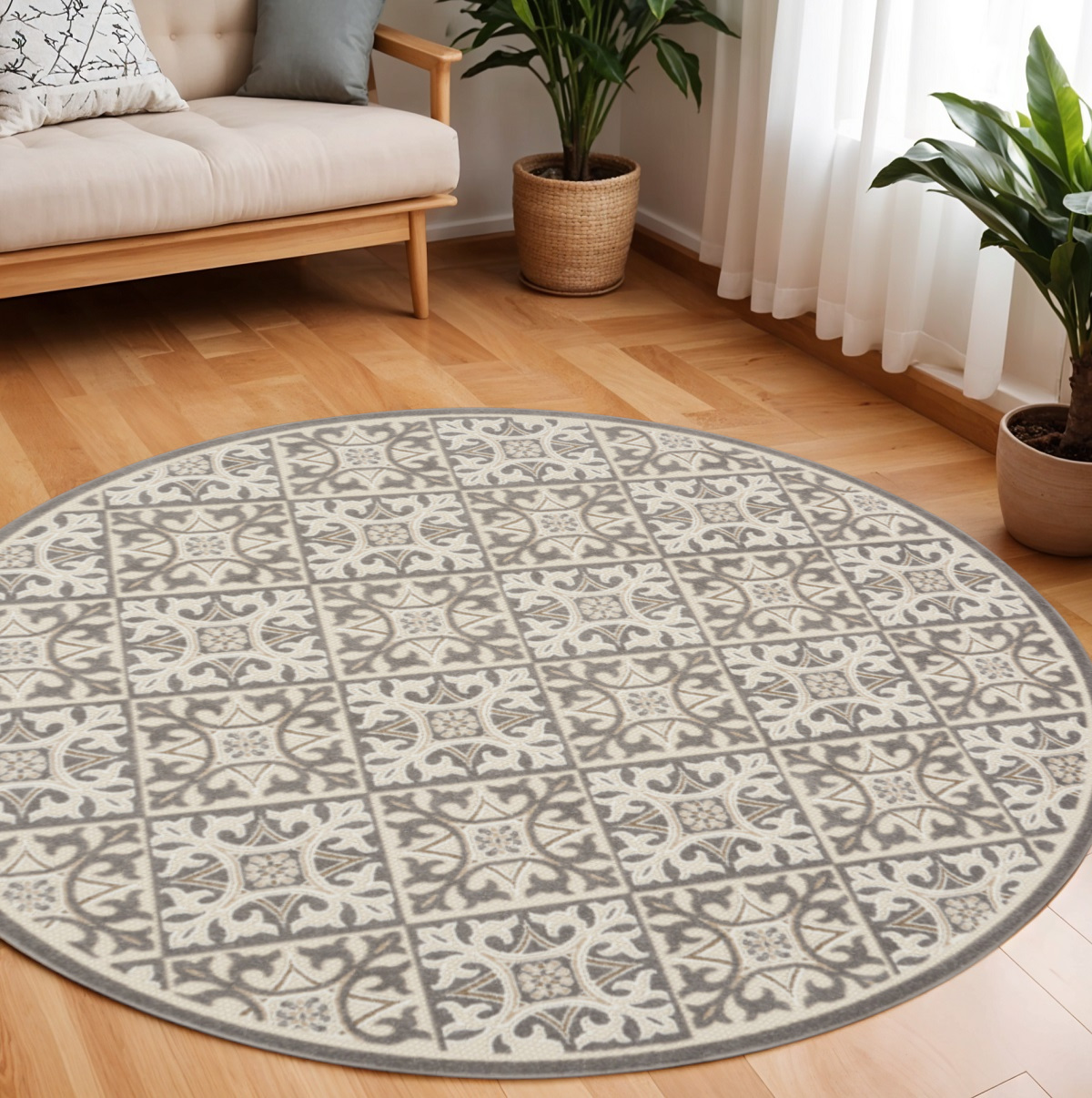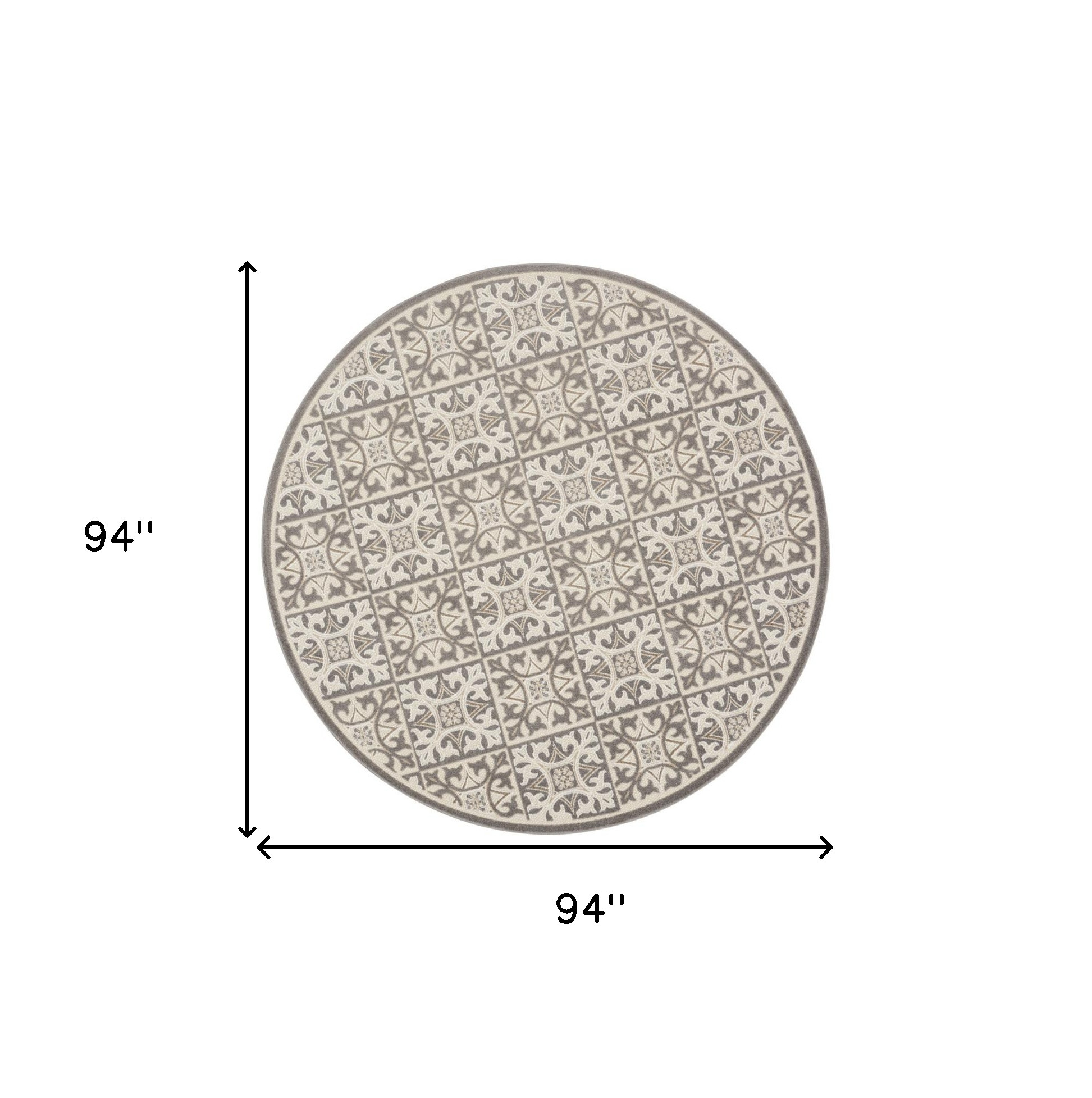 Add some artistry to your room with this 8-foot round ivory and gray round geometric indoor outdoor area rug. This geometric round shaped rug features a geometric pattern in ivory and gray that combines a good looking print with a unique and updated shape. The mix of shape, color, and design gives this rug refreshing visual interest. Area rugs help to give warmth and sense of home to your space. 94-inch H x 94-inch W x 0.25-inch D