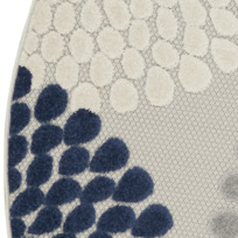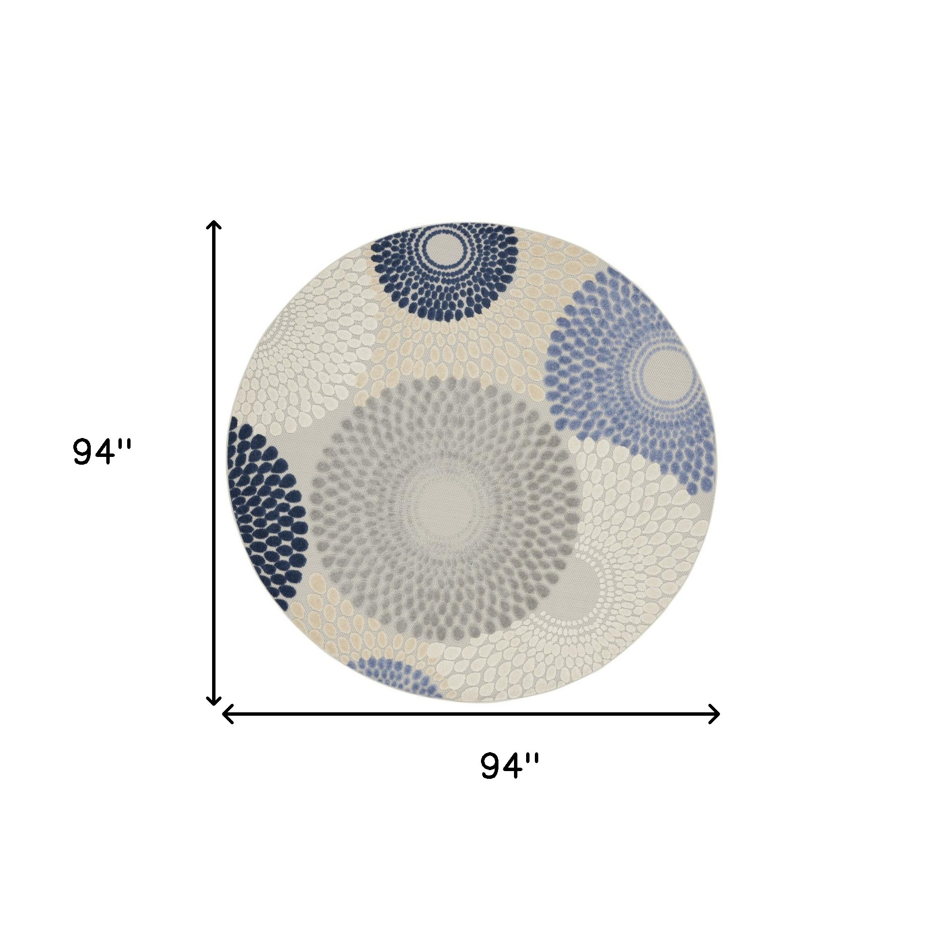 Add great coloration and comfortable texture to your space with this 8-foot round ivory blue and gray round geometric indoor outdoor area rug. This geometric round shaped rug features a geometric pattern in ivory blue and gray that combines a good looking print with a unique and updated shape. The mix of shape, color, and design gives this rug refreshing visual interest. Area rugs help to give warmth and sense of home to your space. 94-inch H x 94-inch W x 0.25-inch D