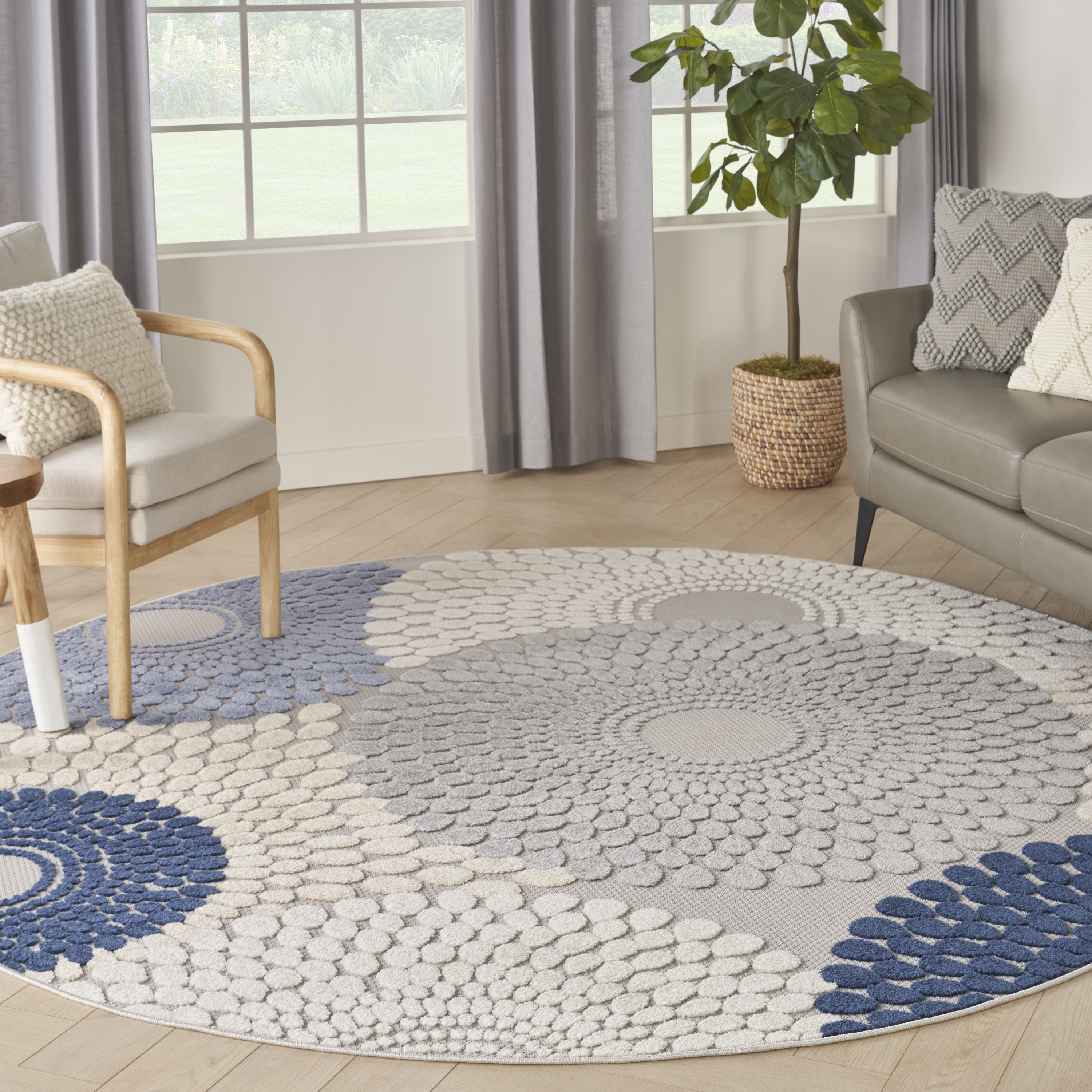 indoor outdoor area rug, geometric indoor outdoor area rug, outdoor area rug, ivory blue gray round geometric, blue gray round geometric indoor |