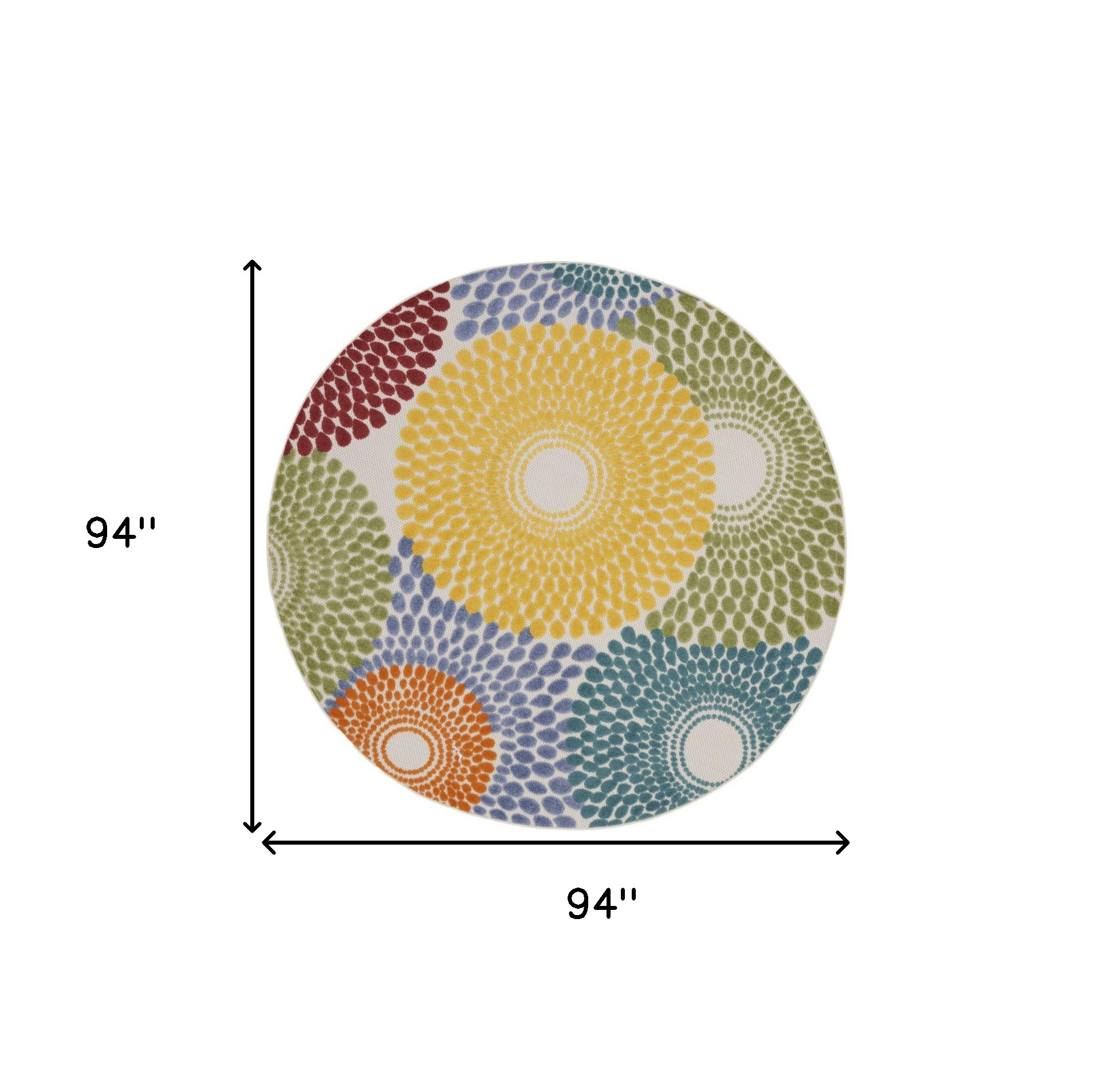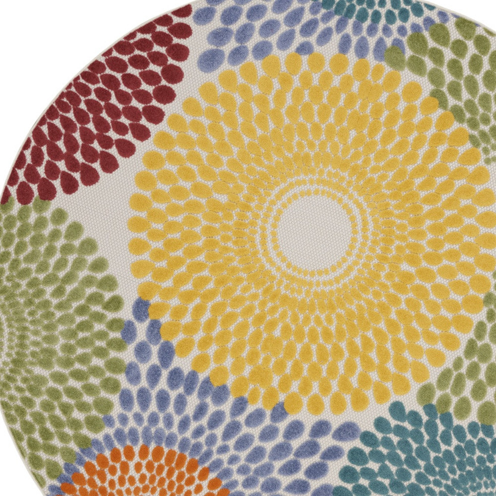 Set an inviting tone in your space with this 8-foot round blue and green round geometric indoor outdoor area rug. This geometric round shaped rug features a geometric pattern in blue and green that combines a good looking print with a unique and updated shape. The mix of shape, color, and design gives this rug refreshing visual interest. Area rugs help to give warmth and sense of home to your space. 94-inch H x 94-inch W x 0.25-inch D
