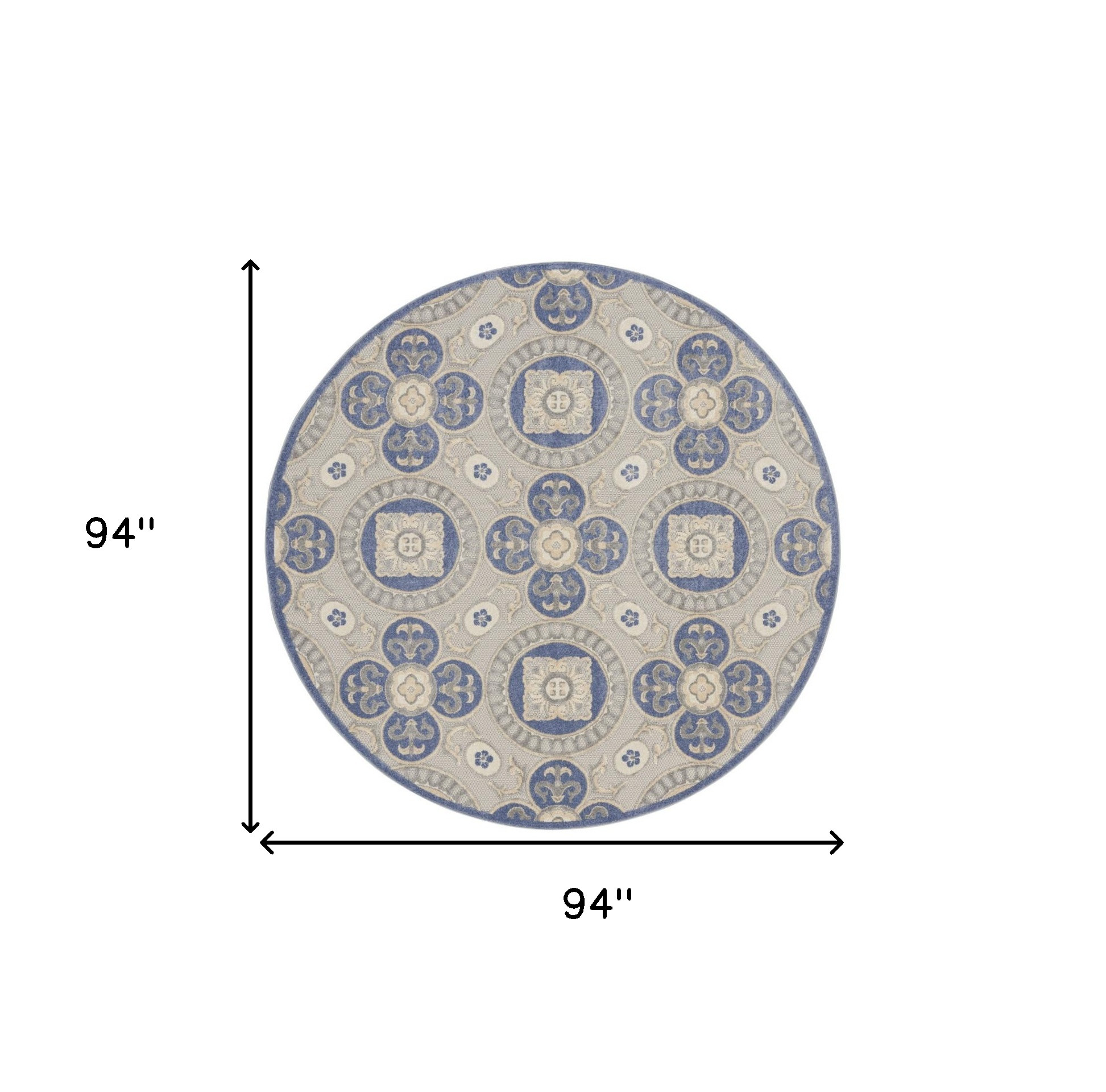 Add great coloration and comfortable texture to your space with this 8-foot round blue and gray round geometric indoor outdoor area rug. This geometric round shaped rug features a geometric pattern in blue and gray that combines a good looking print with a unique and updated shape. The mix of shape, color, and design gives this rug refreshing visual interest. Place this area rug against a hardwood or tile floor and it will enliven your living space with style and sophistication. 94-inch H x 94-inch W x 0.25-inch D