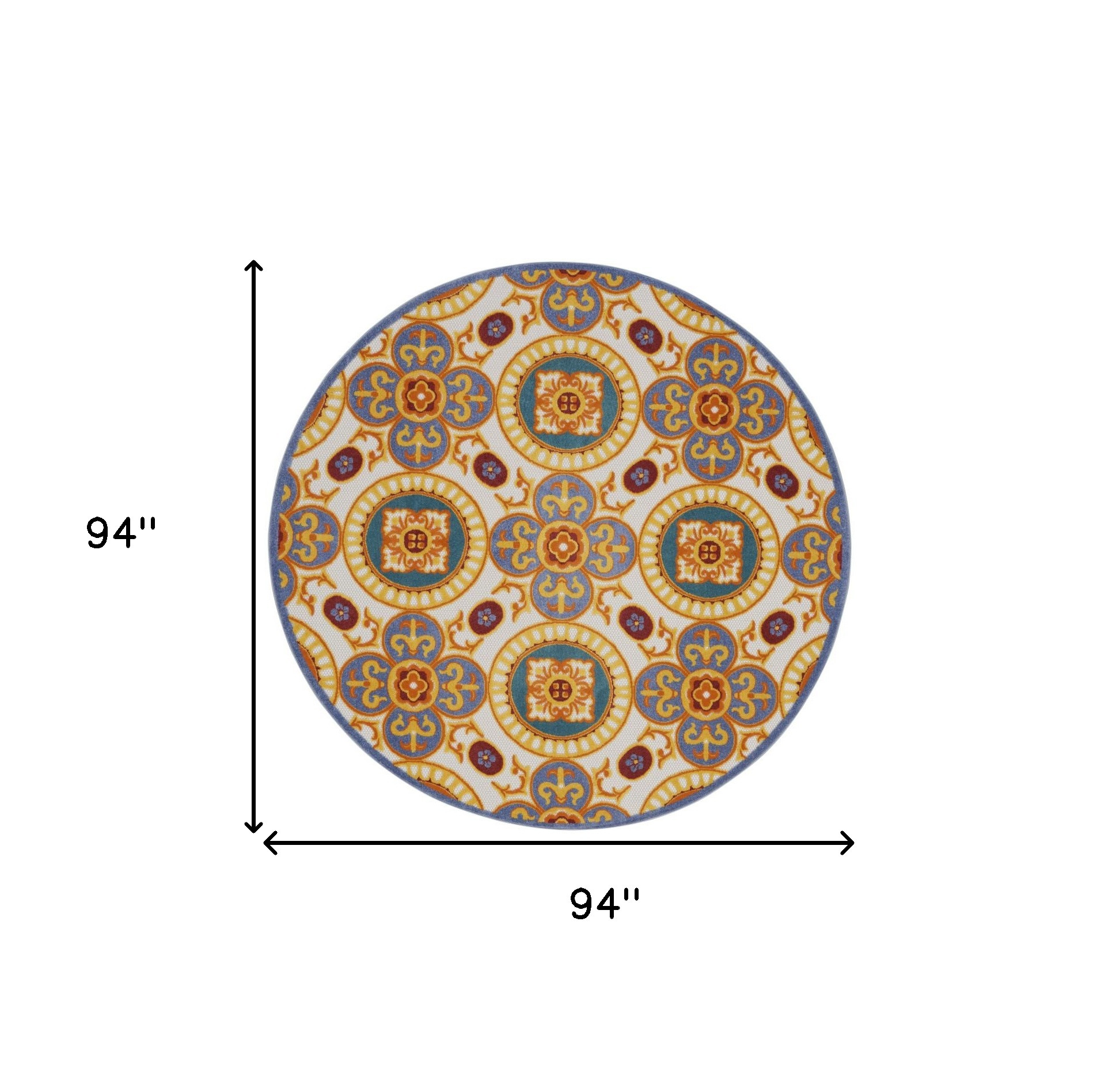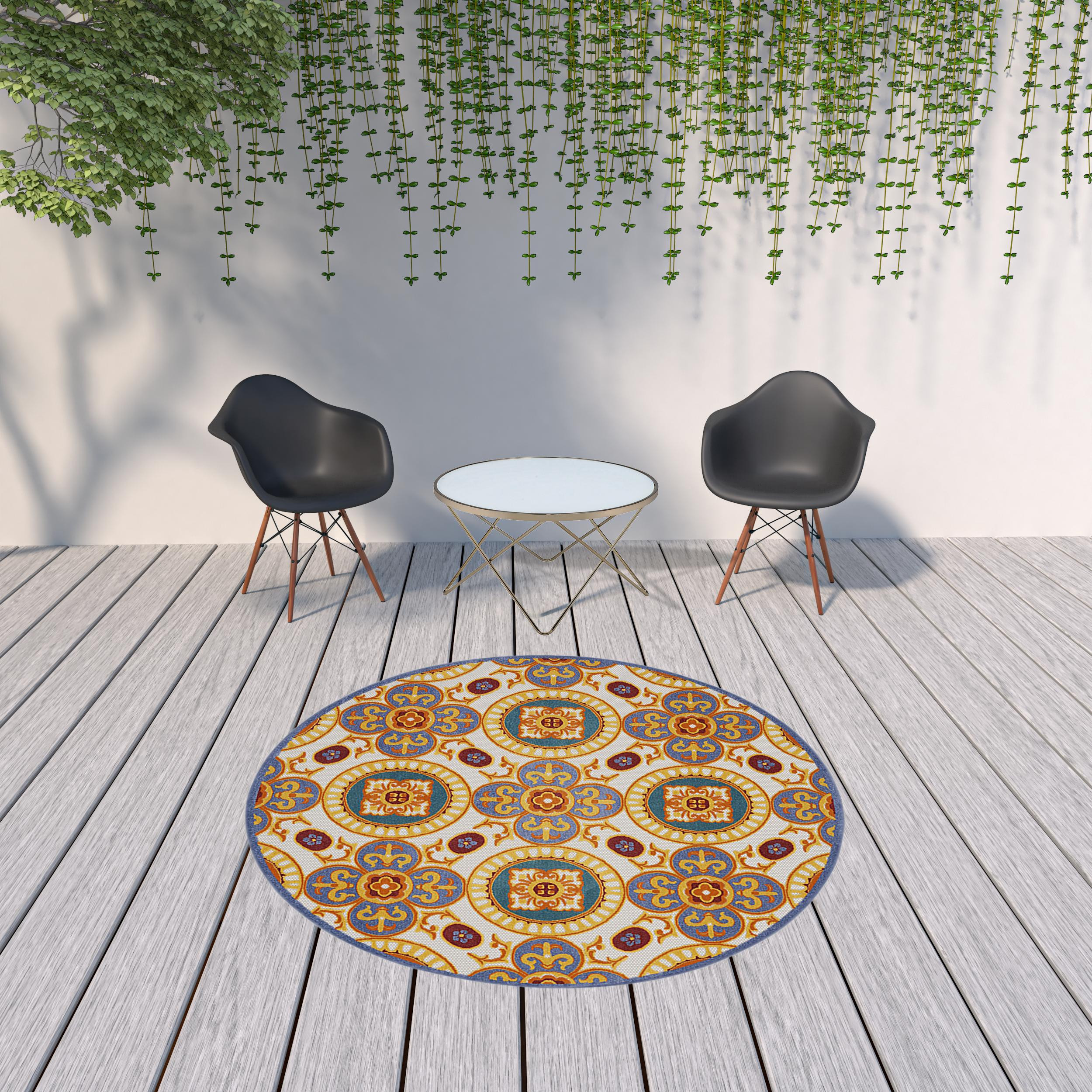 Add some artistry to your room with this 8-foot round ivory blue and orange round geometric indoor outdoor area rug. This geometric round shaped rug features a geometric pattern in ivory blue and orange that combines a good looking print with a unique and updated shape. The mix of shape, color, and design gives this rug refreshing visual interest. Place this area rug against a hardwood or tile floor and it will enliven your living space with style and sophistication. 94-inch H x 94-inch W x 0.25-inch D