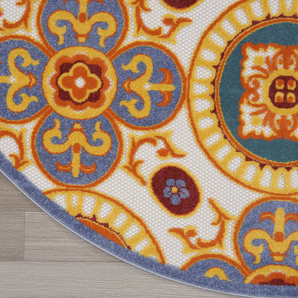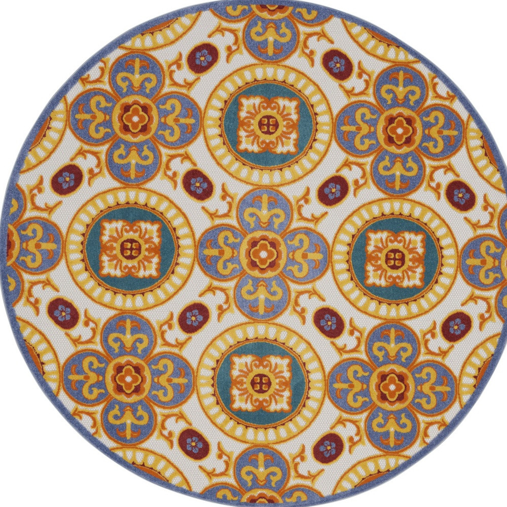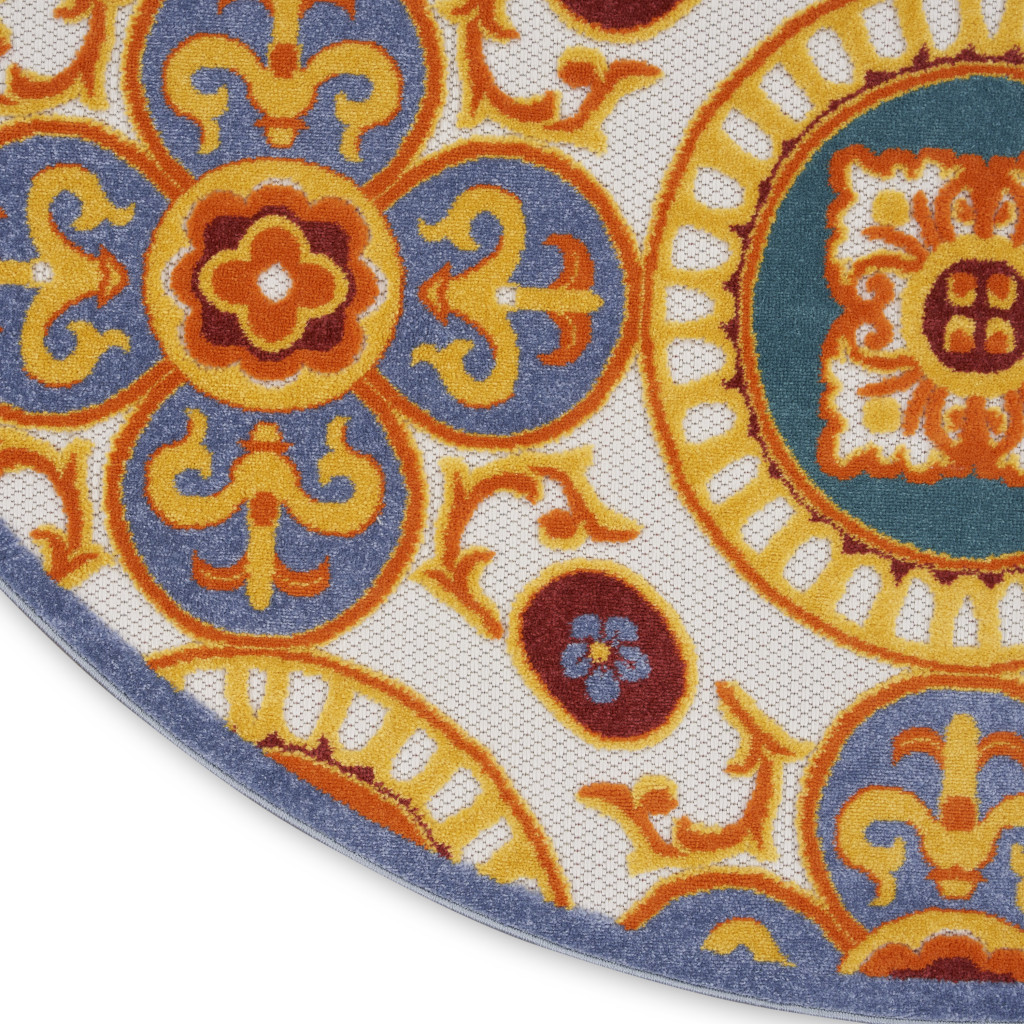 geometric indoor outdoor area rug, indoor outdoor area rug, outdoor area rug, ivory blue orange round geometric, blue orange round geometric indoor |
