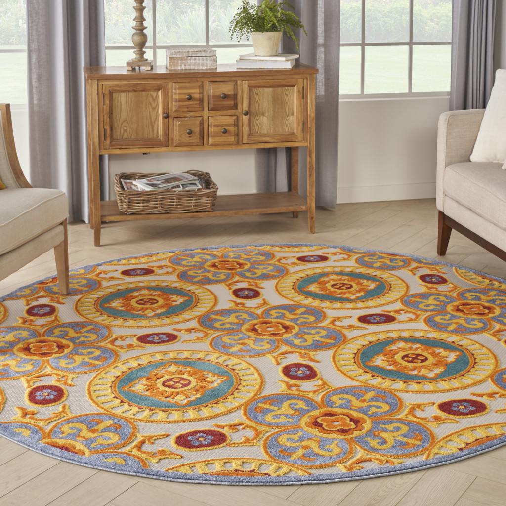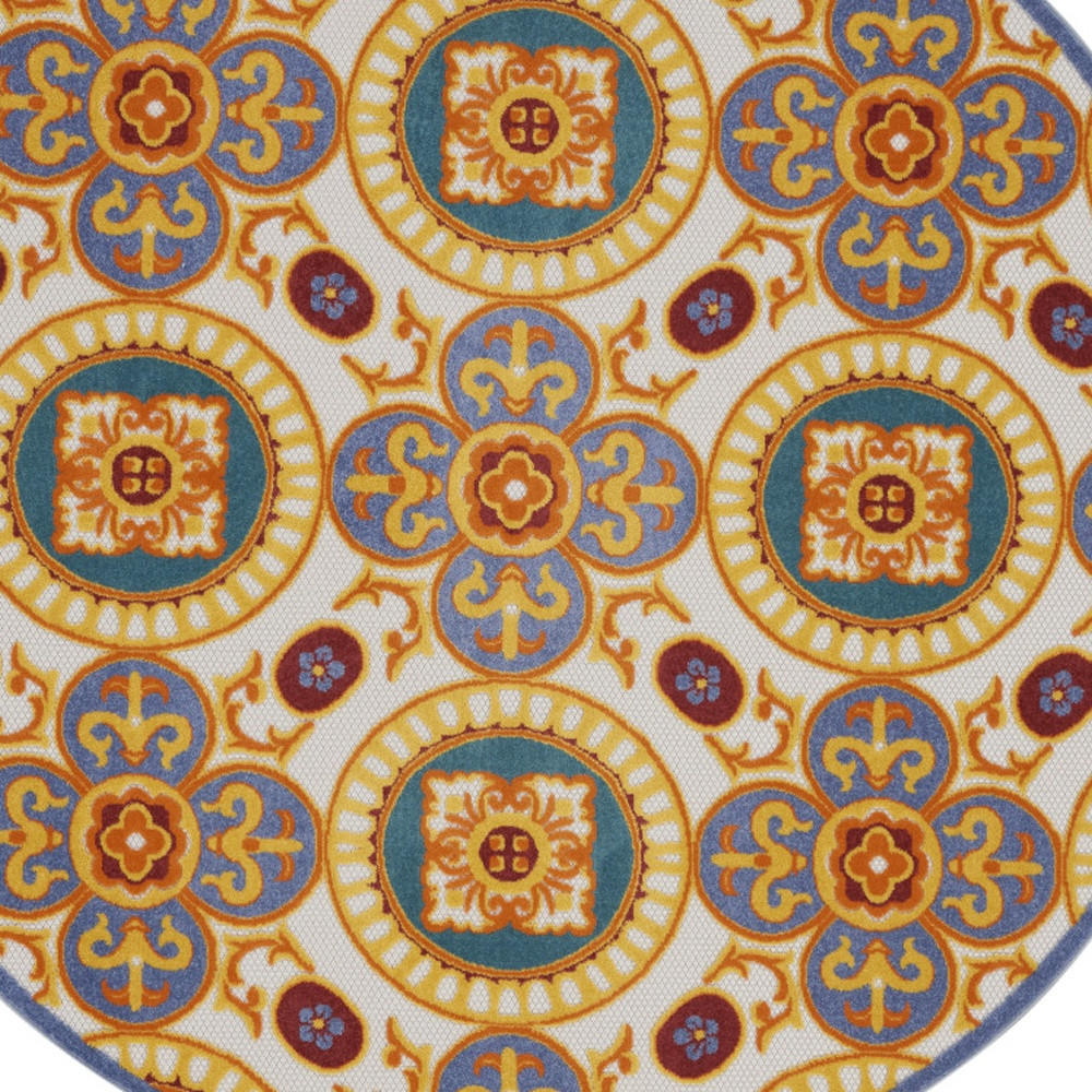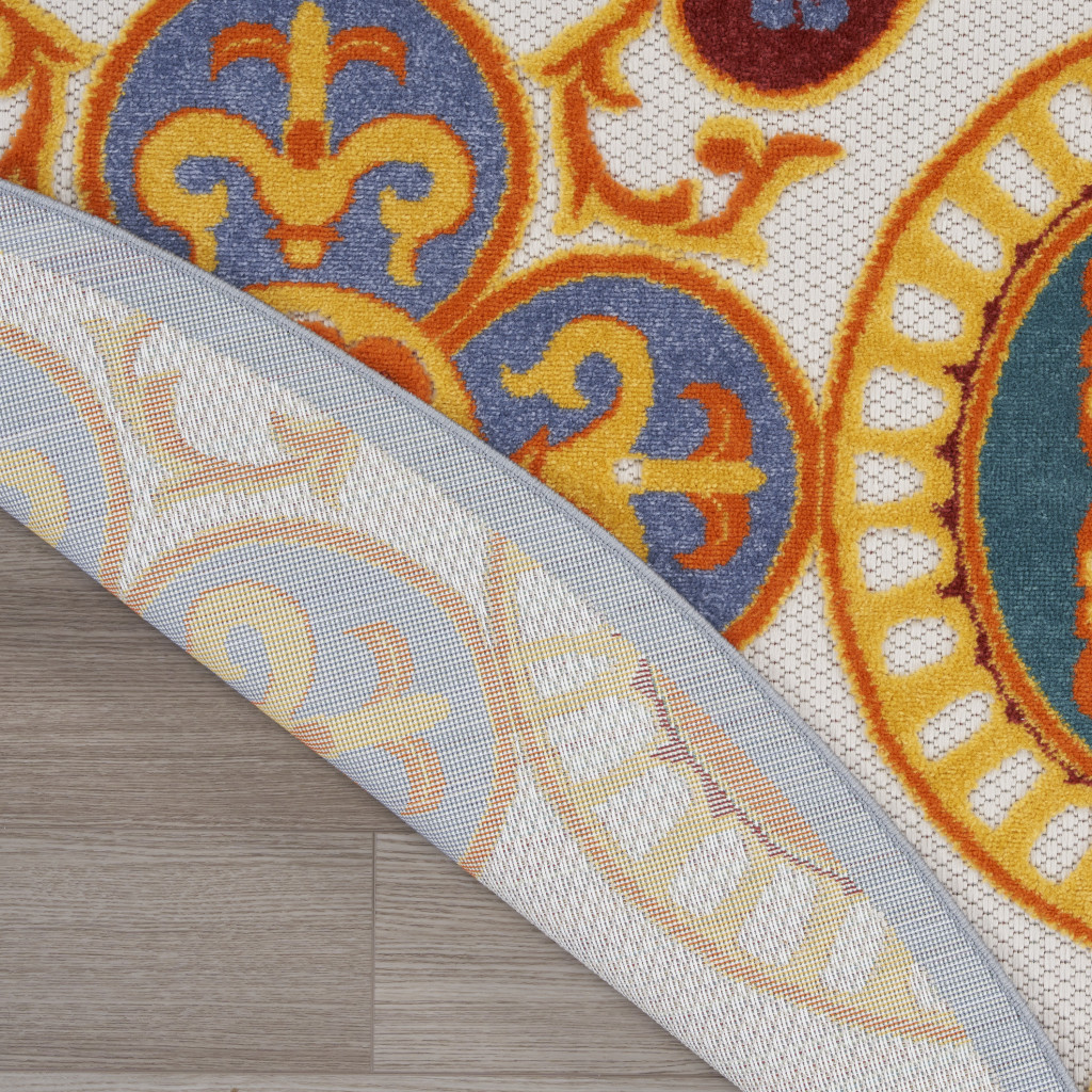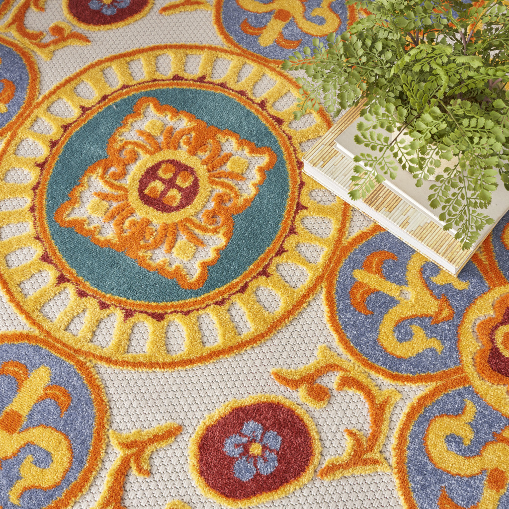 geometric indoor outdoor area rug, indoor outdoor area rug, outdoor area rug, ivory blue orange round geometric, blue orange round geometric indoor |