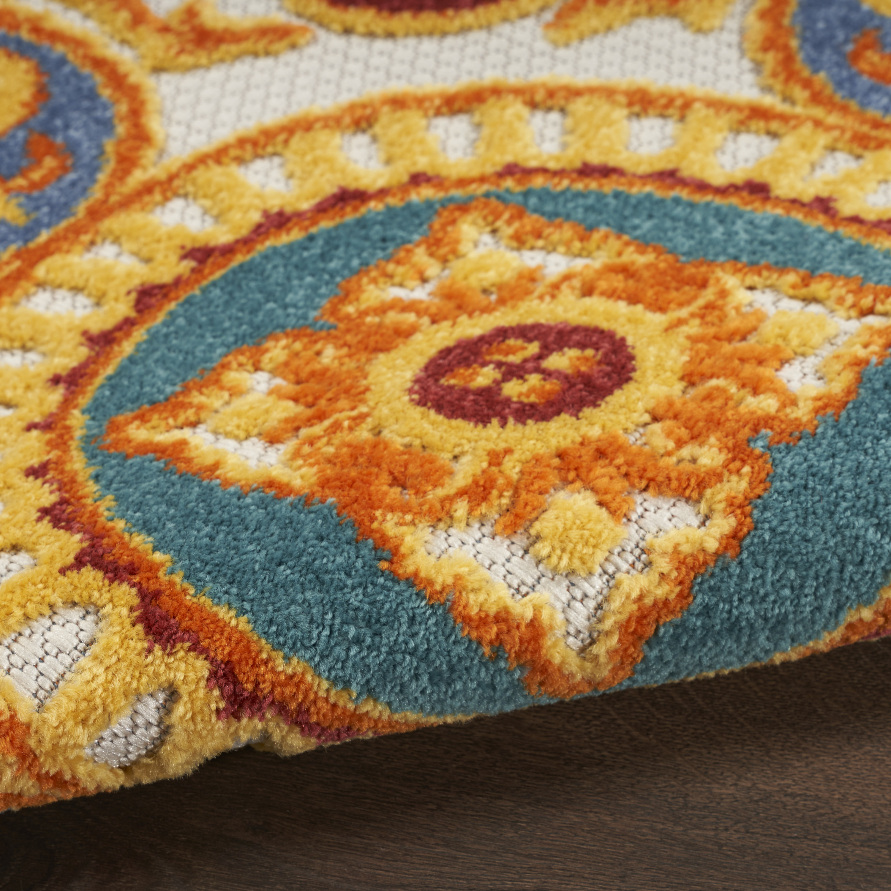 Add some artistry to your room with this 4-foot x 6-foot ivory blue and orange geometric indoor outdoor area rug. This rectangle shaped rug features a geometric design in ivory blue and orange to give it visual interest. A classic shape marries with good looking design for your space place this area rug against a hardwood or tile floor and it will enliven your living space with style and sophistication. 42-inch H x 66-inch W x 0.25-inch D