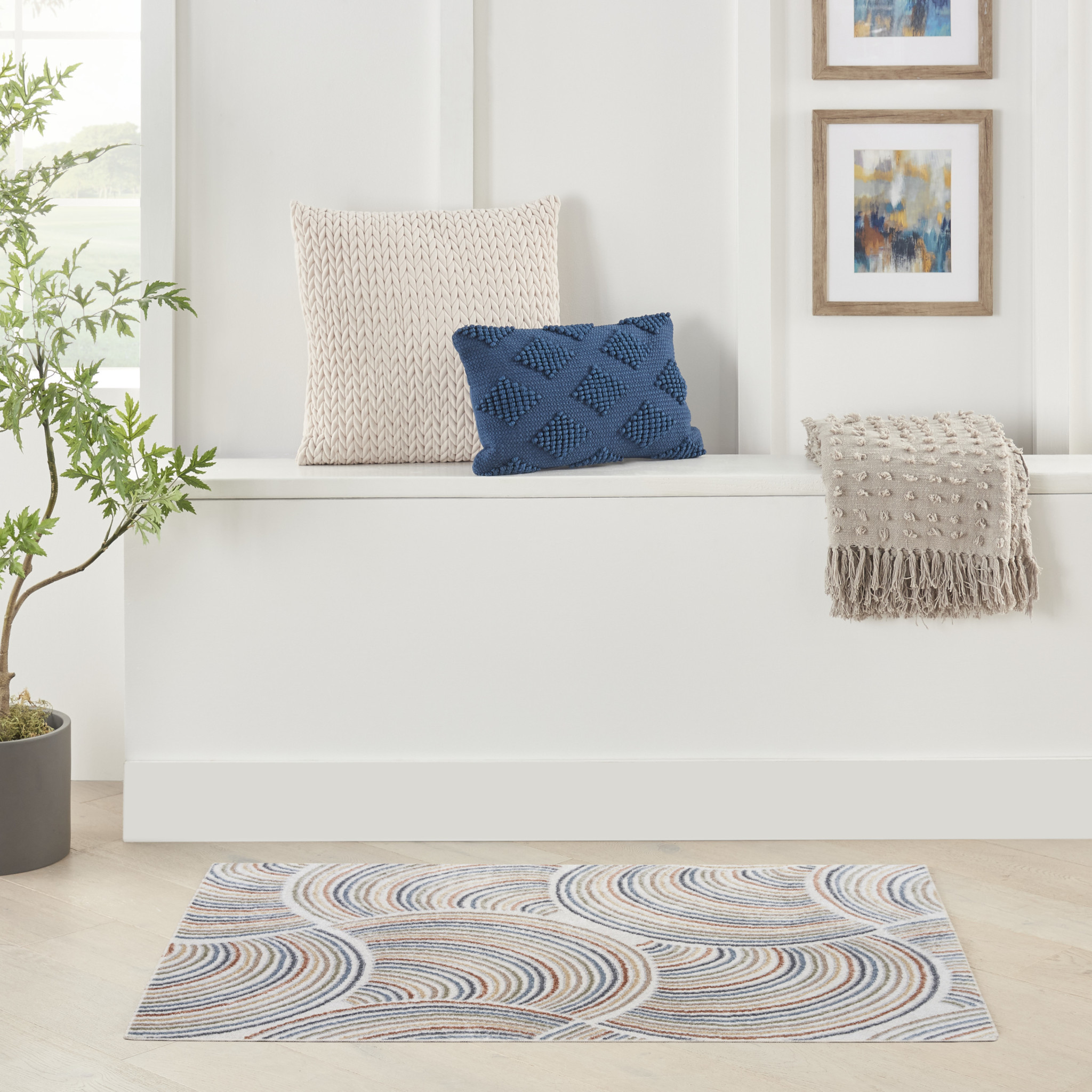 Set an inviting tone in your space with this 3-foot x 5-foot blue and ivory abstract power loom washable area rug. This rectangle shaped rug features a abstract design in blue and ivory to give it visual interest. A classic shape marries with good looking design for your space place this area rug against a hardwood or tile floor and it will enliven your living space with style and sophistication. 39-inch H x 60-inch W x 0.25-inch D