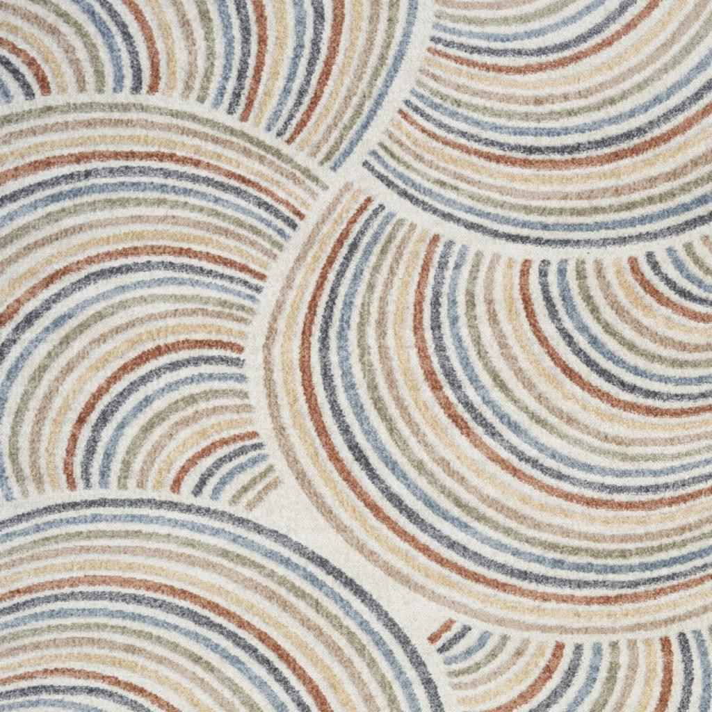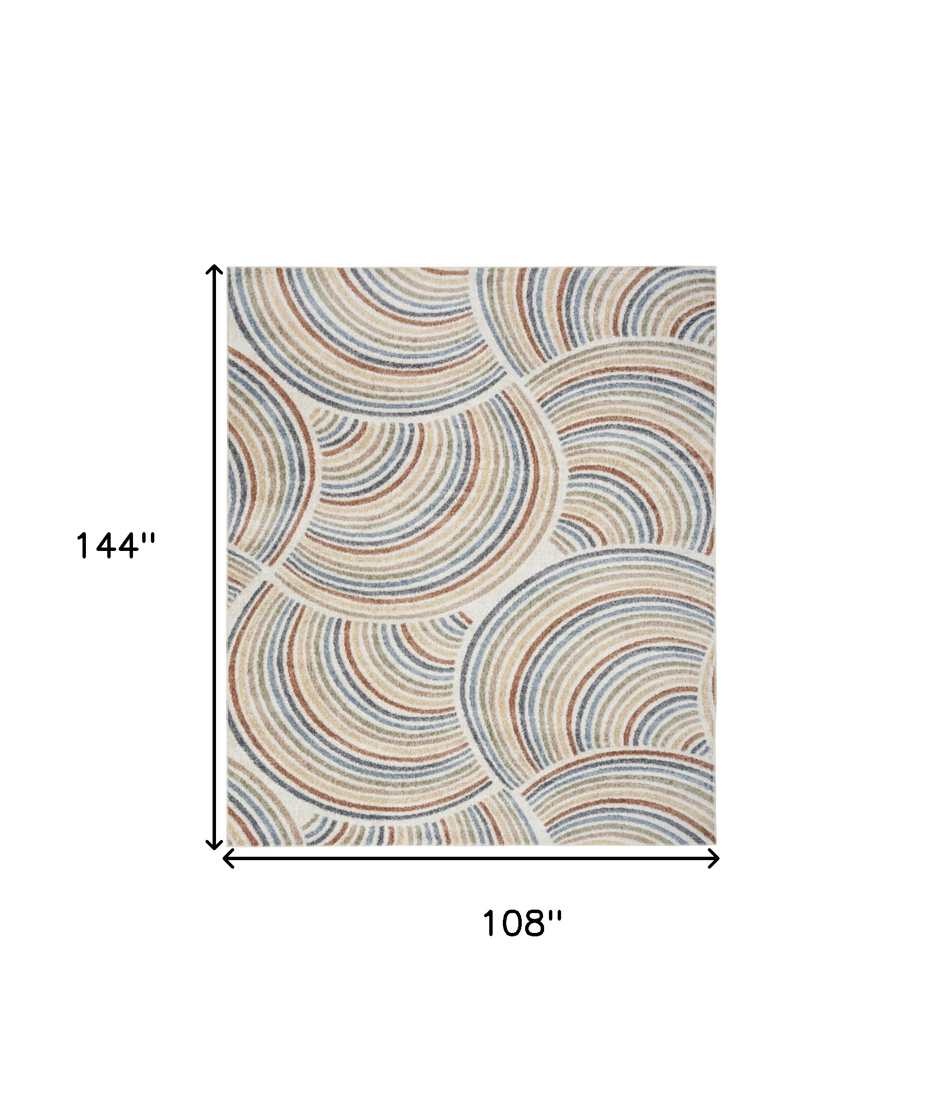 Add great coloration and comfortable texture to your space with this 9-foot x 12-foot ivory blue and brown geometric washable area rug. Ideal for spaces with kids and pets, this rug is stain resistant to help repel dirt and spilled liquids. Built to last, this rug crafted from polyester fibers is known for its durability and long lasting appeal. Rugs are a great way to showcase your style, hide imperfections, warm your home and reduce noise. This larger sized, mid-century styled rug is ready to create a focal point or statement piece in your room. 108.00-inch h x 144.00-inch w x 0.25-inch d.