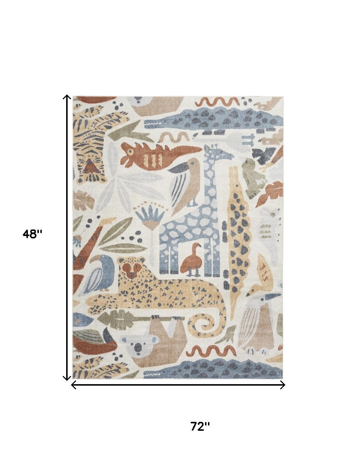Add great coloration and comfortable texture to your space with this 4-foot x 6-foot ivory blue and beige animal print area rug. Built to last, this rug crafted from polyester fibers is known for its durability and long lasting appeal. Rugs are a great way to showcase your style, hide imperfections, warm your home and reduce noise. This smaller sized, contemporary styled rug is just what you need for your walkway, bedside, in front of door, cabinet, refrigerator, or chair. 48-inch h x 72-inch w x 0.25-inch d.