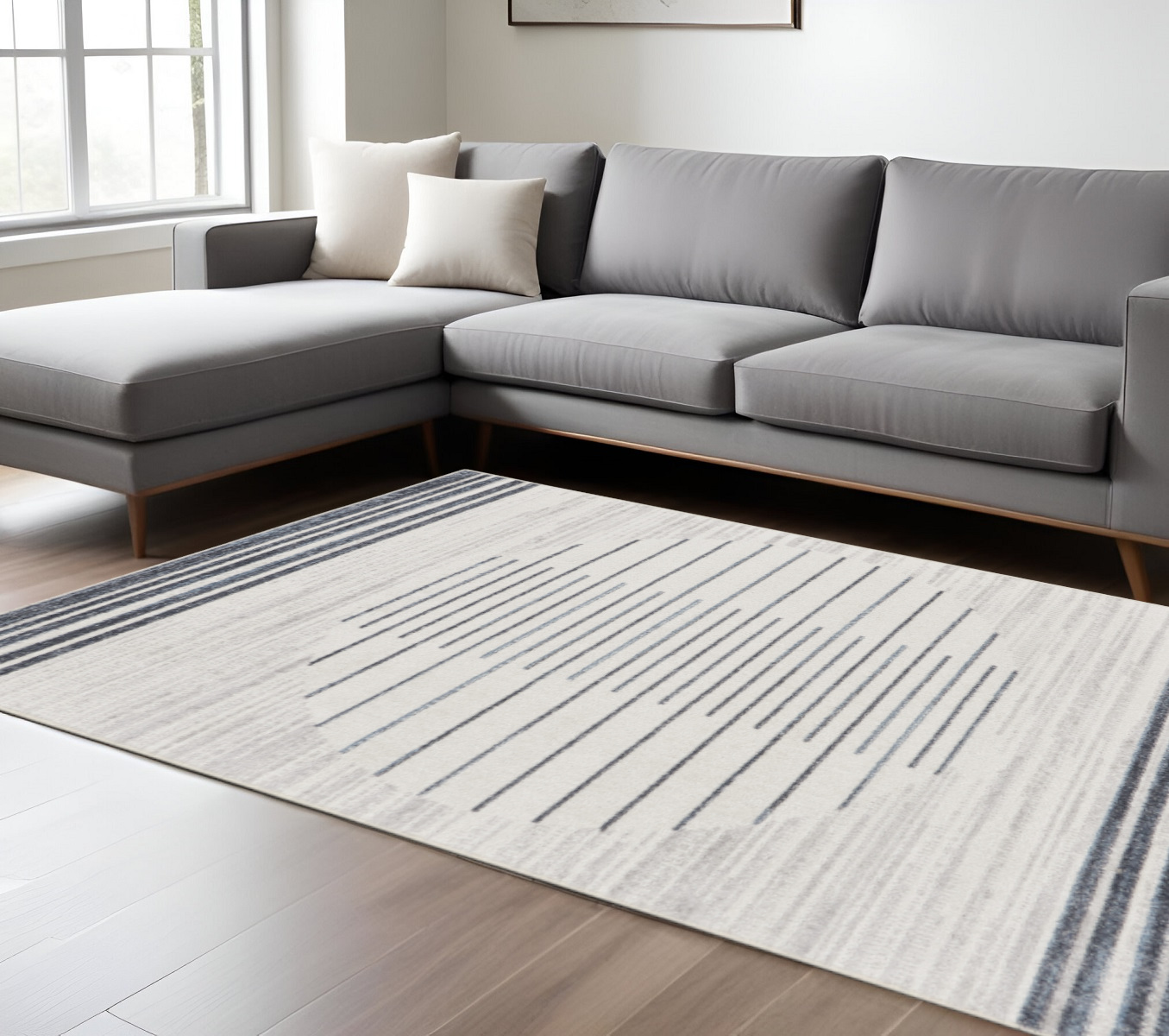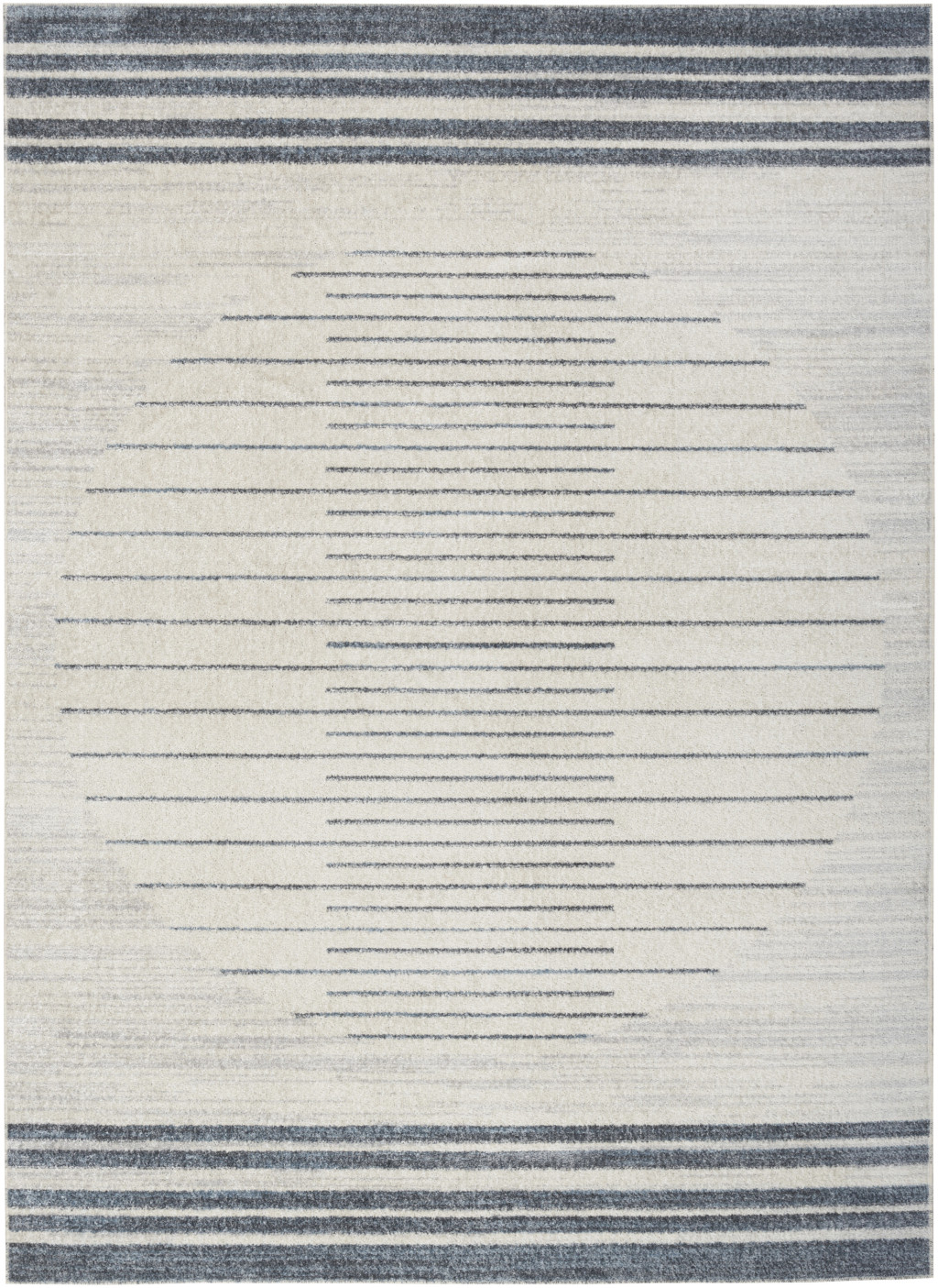 This 7-foot x 9-foot blue and ivory geometric washable area rug, is a great way to add warmth to a room. Built to last, this rug crafted from polyester fibers is known for its durability and long lasting appeal. Rugs are a great way to showcase your style, hide imperfections, warm your home and reduce noise. This larger sized, modern styled rug is ready to create a focal point or statement piece in your room. 79-inch h x 108-inch w x 0.25-inch d.