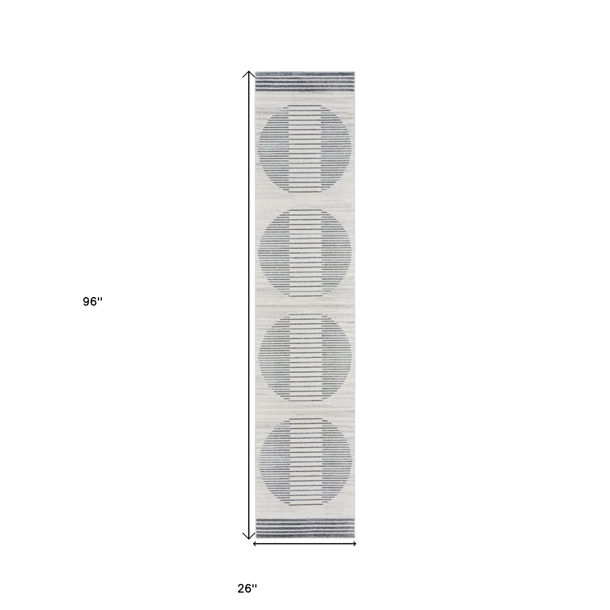 Add some artistry to your room with this 8-foot blue and ivory geometric washable runner rug. Built to last, this rug crafted from polyester fibers is known for its durability and long lasting appeal. Rugs are a great way to showcase your style, hide imperfections, warm your home and reduce noise. This modern style runner makes a great accent for the hallway, in front of cabinets, in the laundry room, or any other space you need a narrow and long rug. 26.00-inch h x 96.00-inch w x 0.25-inch d.