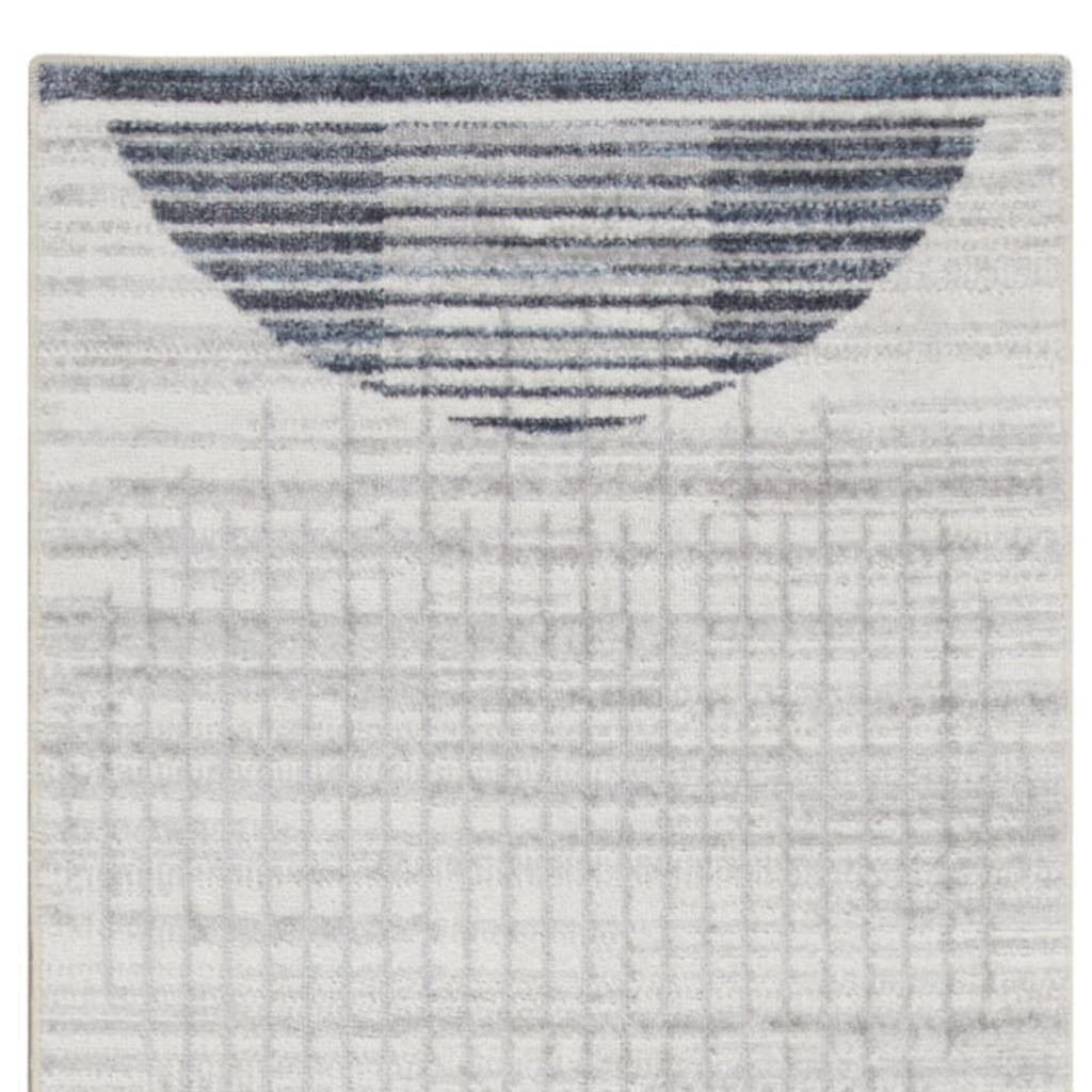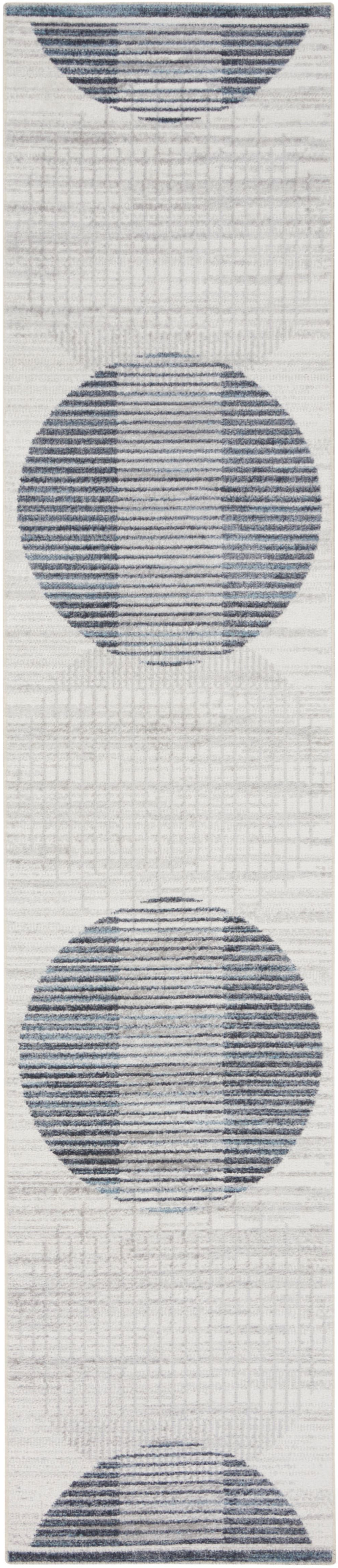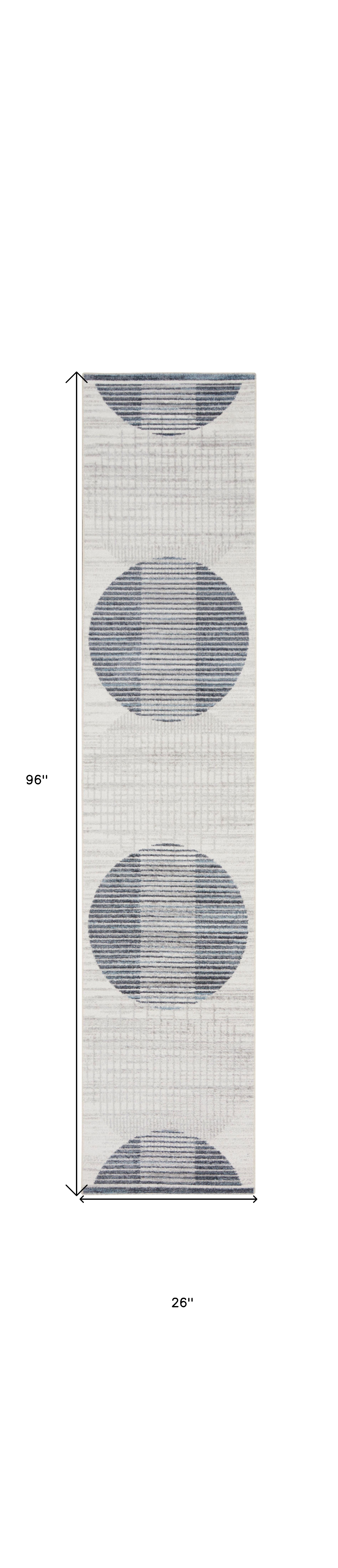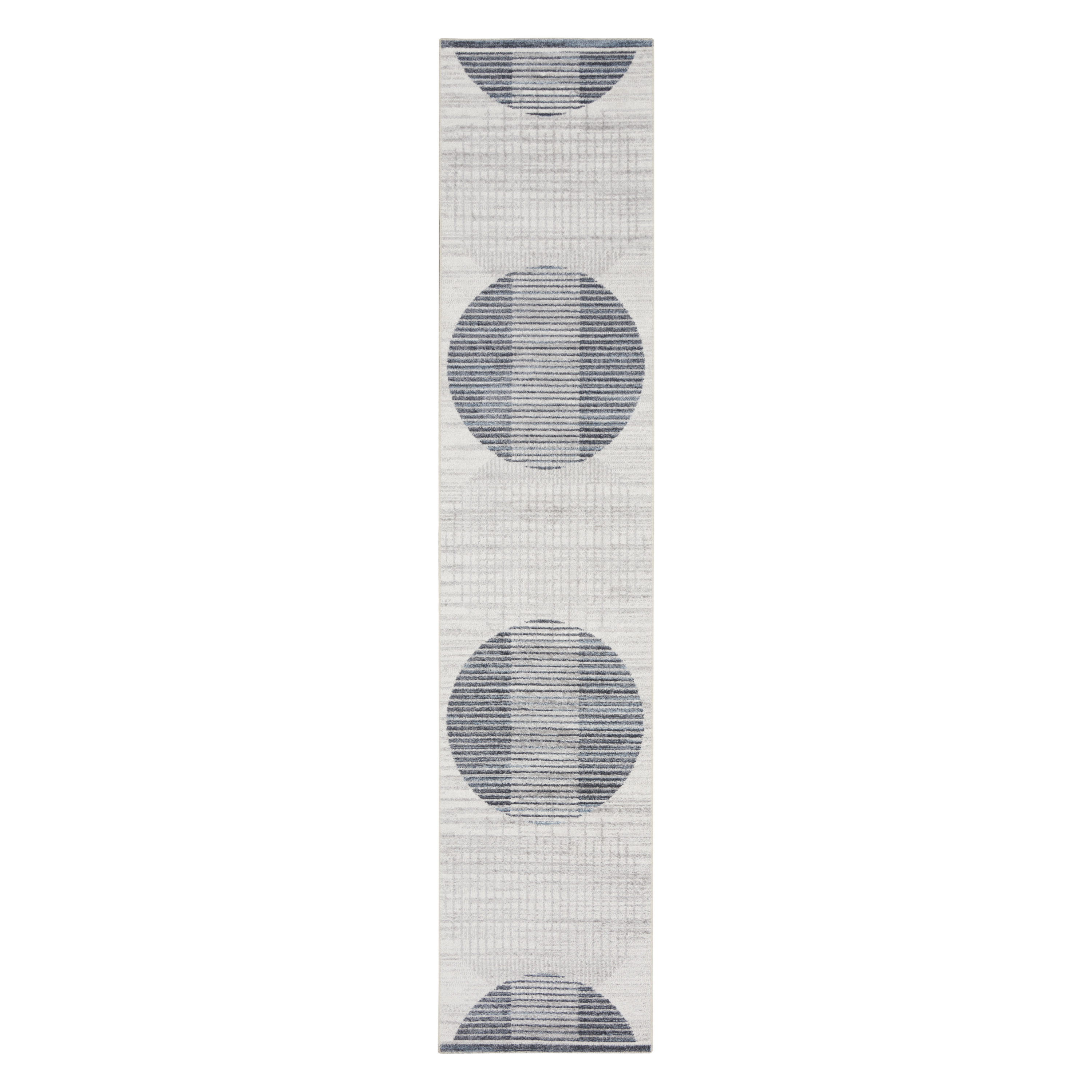 Add great coloration and comfortable texture to your space with this 8-foot ivory and blue geometric washable runner rug. Ideal for spaces with kids and pets, this rug is stain resistant to help repel dirt and spilled liquids. Built to last, this rug crafted from polyester fibers is known for its durability and long lasting appeal. Rugs are a great way to showcase your style, hide imperfections, warm your home and reduce noise. This mid-century style runner makes a great accent for the hallway, in front of cabinets, in the laundry room, or any other space you need a narrow and long rug. 26.00-inch h x 96.00-inch w x 0.25-inch d.