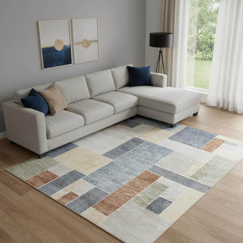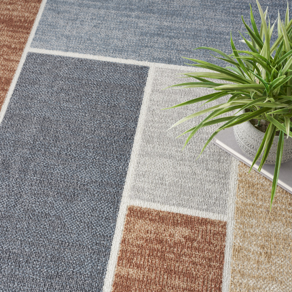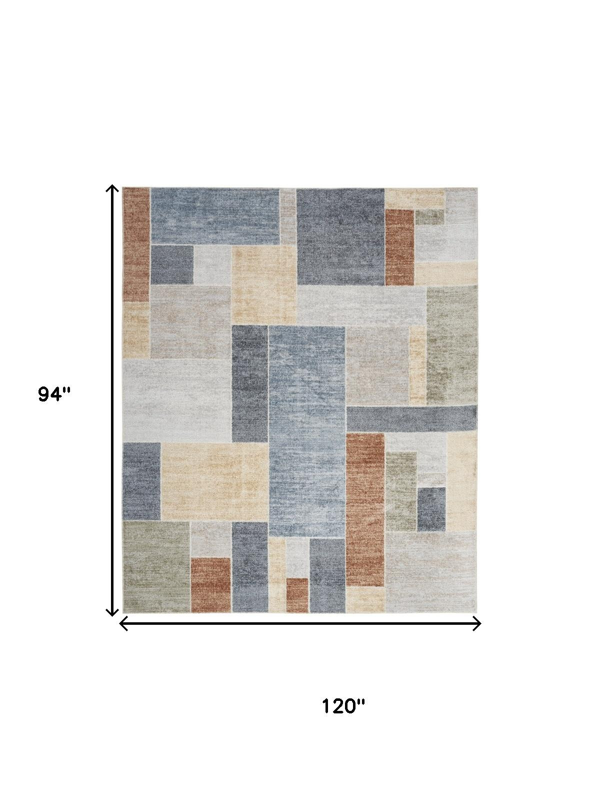 Set an inviting tone in your space with this 8-foot x 10-foot blue brown and tan geometric washable area rug. Ideal for spaces with kids and pets, this rug is stain resistant to help repel dirt and spilled liquids. Built to last, this rug crafted from polyester fibers is known for its durability and long lasting appeal. Rugs are a great way to showcase your style, hide imperfections, warm your home and reduce noise. This larger sized, contemporary styled rug is ready to create a focal point or statement piece in your room. 94-inch h x 120-inch w x 0.25-inch d.