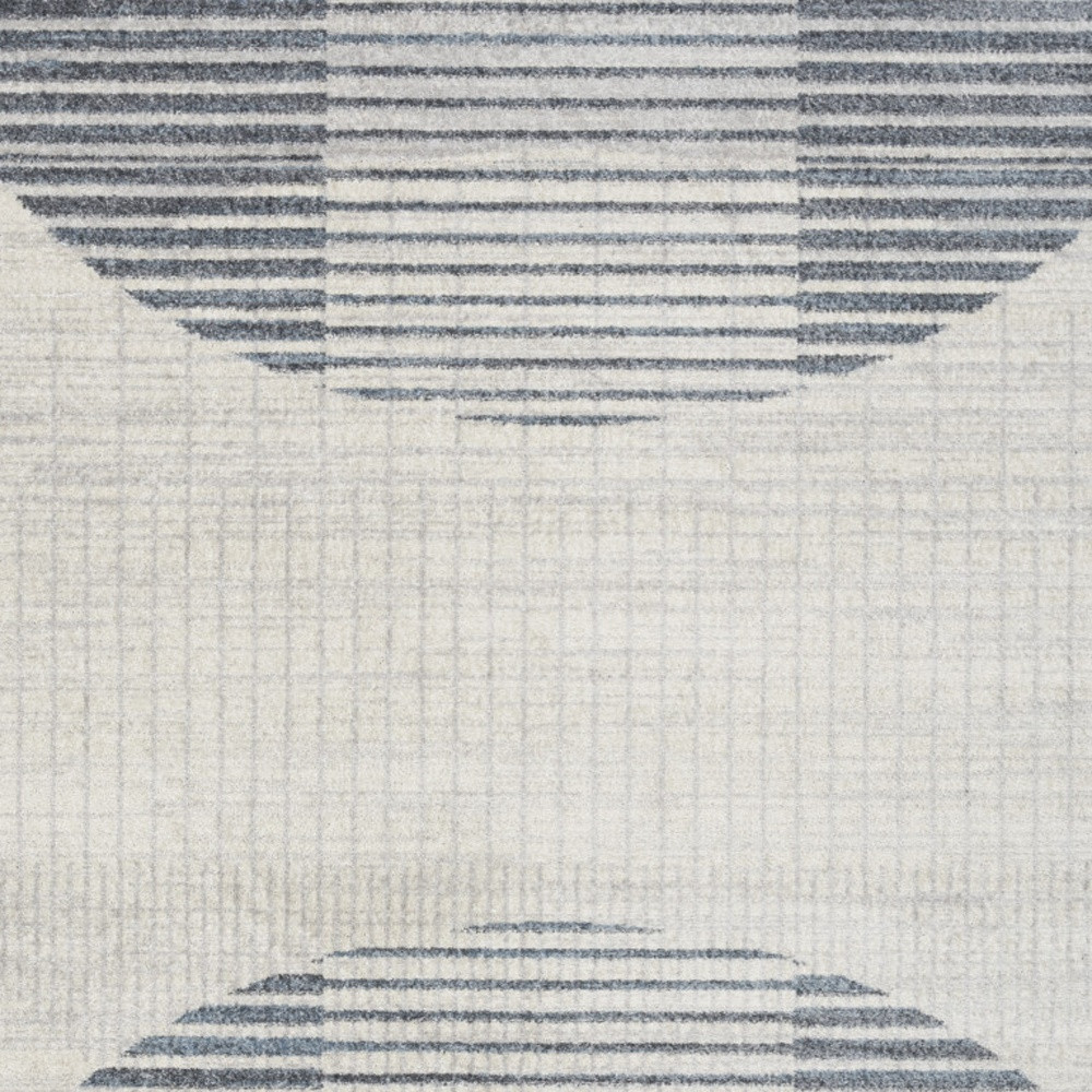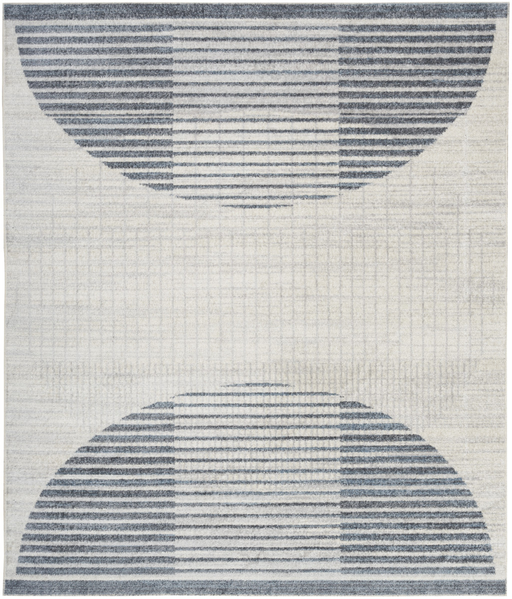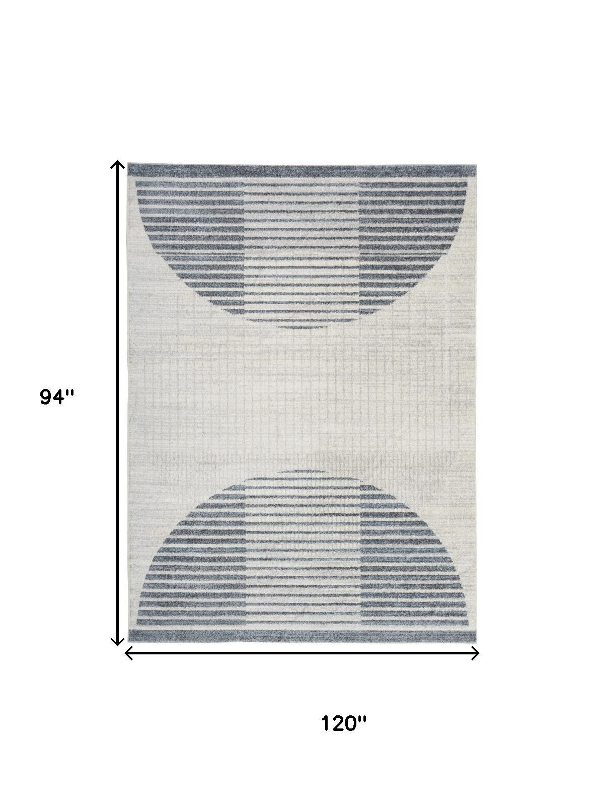 Set an inviting tone in your space with this 8-foot x 10-foot ivory and blue geometric washable area rug. Ideal for spaces with kids and pets, this rug is stain resistant to help repel dirt and spilled liquids. Built to last, this rug crafted from polyester fibers is known for its durability and long lasting appeal. Rugs are a great way to showcase your style, hide imperfections, warm your home and reduce noise. This larger sized, modern styled rug is ready to create a focal point or statement piece in your room. 94-inch h x 120-inch w x 0.25-inch d.