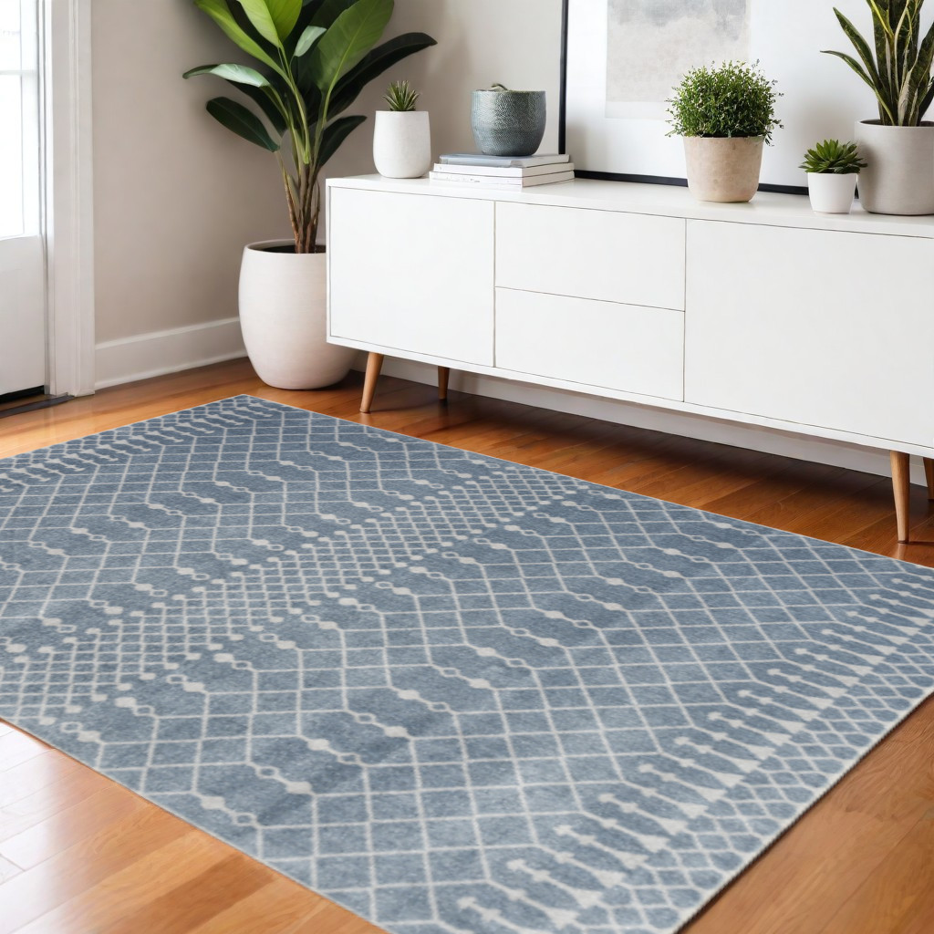 Add some artistry to your room with this 4-foot x 6-foot blue and ivory moroccan washable area rug. Ideal for spaces with kids and pets, this rug is stain resistant to help repel dirt and spilled liquids. Built to last, this rug crafted from polyester fibers is known for its durability and long lasting appeal. Rugs are a great way to showcase your style, hide imperfections, warm your home and reduce noise. This smaller sized, bohemian styled rug is just what you need for your walkway, bedside, in front of door, cabinet, refrigerator, or chair. 48-inch h x 72-inch w x 0.25-inch d.