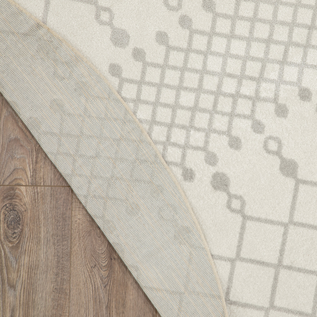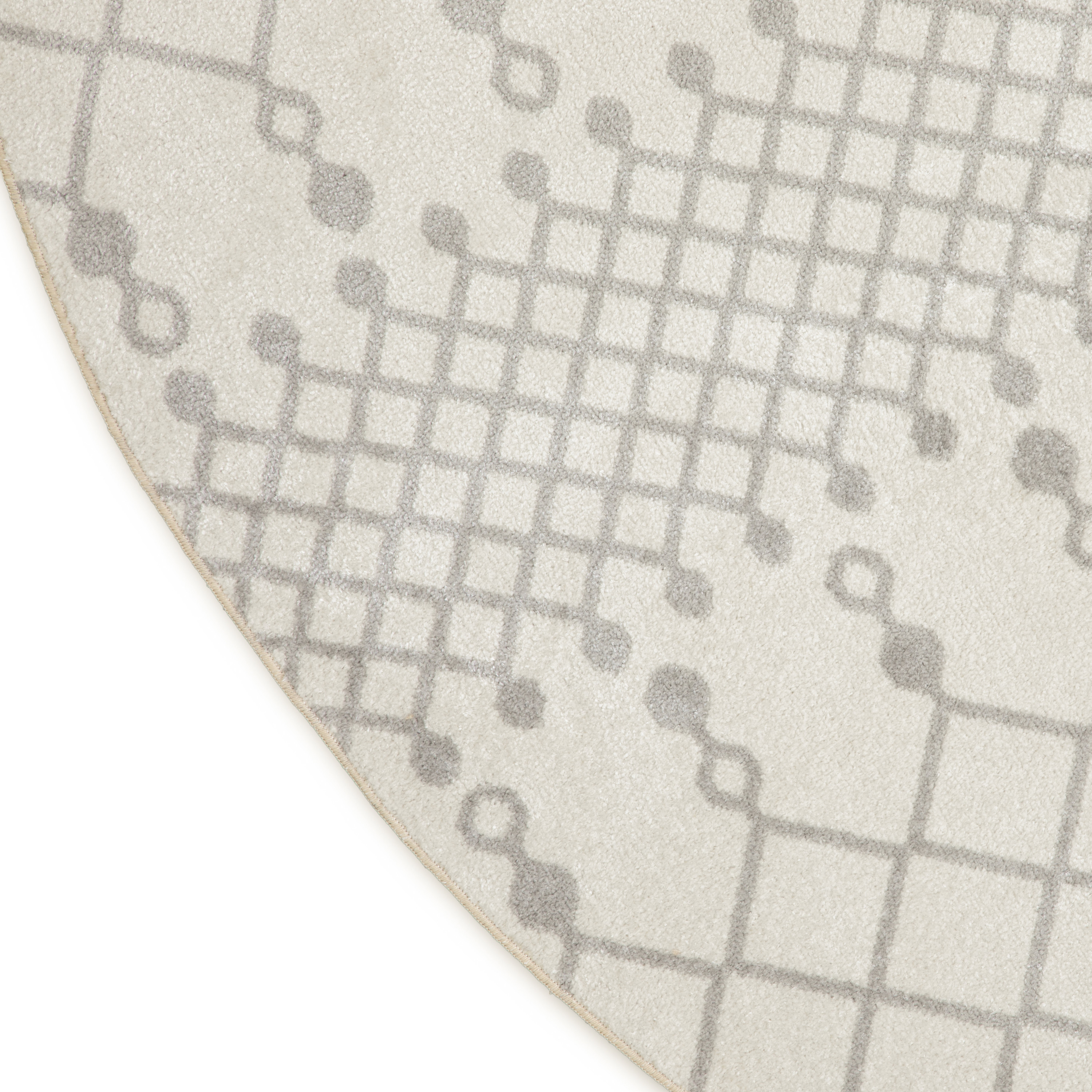 Add some artistry to your room with this 8-foot gray and ivory moroccan washable round rug. Ideal for spaces with kids and pets, this rug is stain resistant to help repel dirt and spilled liquids. Built to last, this rug crafted from polyester fibers is known for its durability and long lasting appeal. Rugs are a great way to showcase your style, hide imperfections, warm your home and reduce noise. This geometric round shaped rug features a moroccan pattern in gray and ivory that combines a good looking print with a unique and updated shape. The mix of shape, color, and design gives this rug refreshing visual interest. This larger sized, bohemian styled rug is ready to create a focal point or statement piece in your room. 94-inch h x 94-inch w x 0.25-inch d.