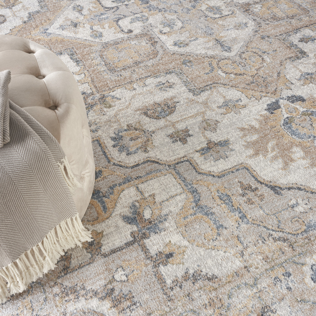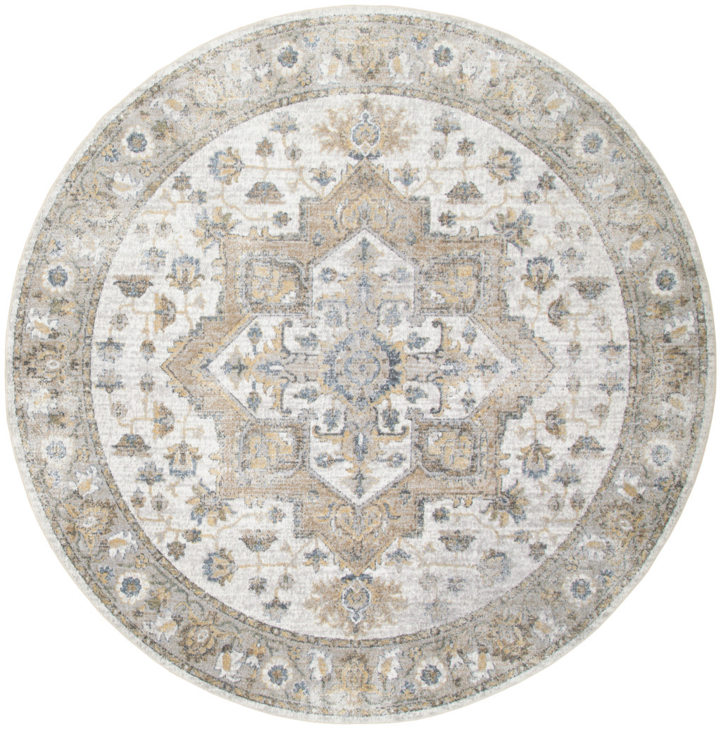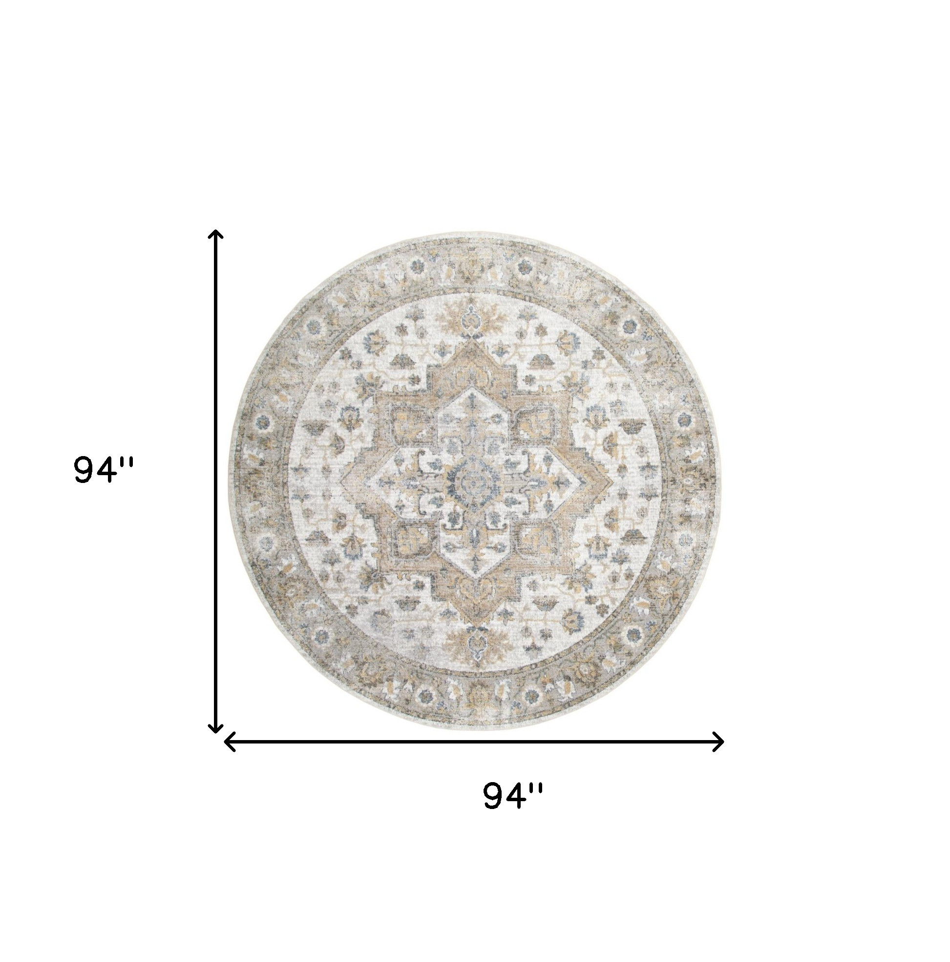 Add some artistry to your room with this 8-foot gray ivory and blue floral medallion distressed washable round rug. Ideal for spaces with kids and pets, this rug is stain resistant to help repel dirt and spilled liquids. Built to last, this rug crafted from polyester fibers is known for its durability and long lasting appeal. Rugs are a great way to showcase your style, hide imperfections, warm your home and reduce noise. This geometric round shaped rug features a floral medallion pattern in gray, ivory, and blue that combines a good looking print with a unique and updated shape. The mix of shape, color, and design gives this rug refreshing visual interest. This larger sized, bohemian styled rug is ready to create a focal point or statement piece in your room. 94-inch h x 94-inch w x 0.25-inch d.