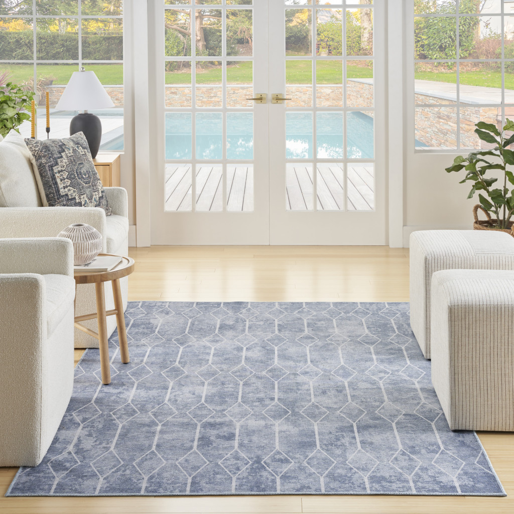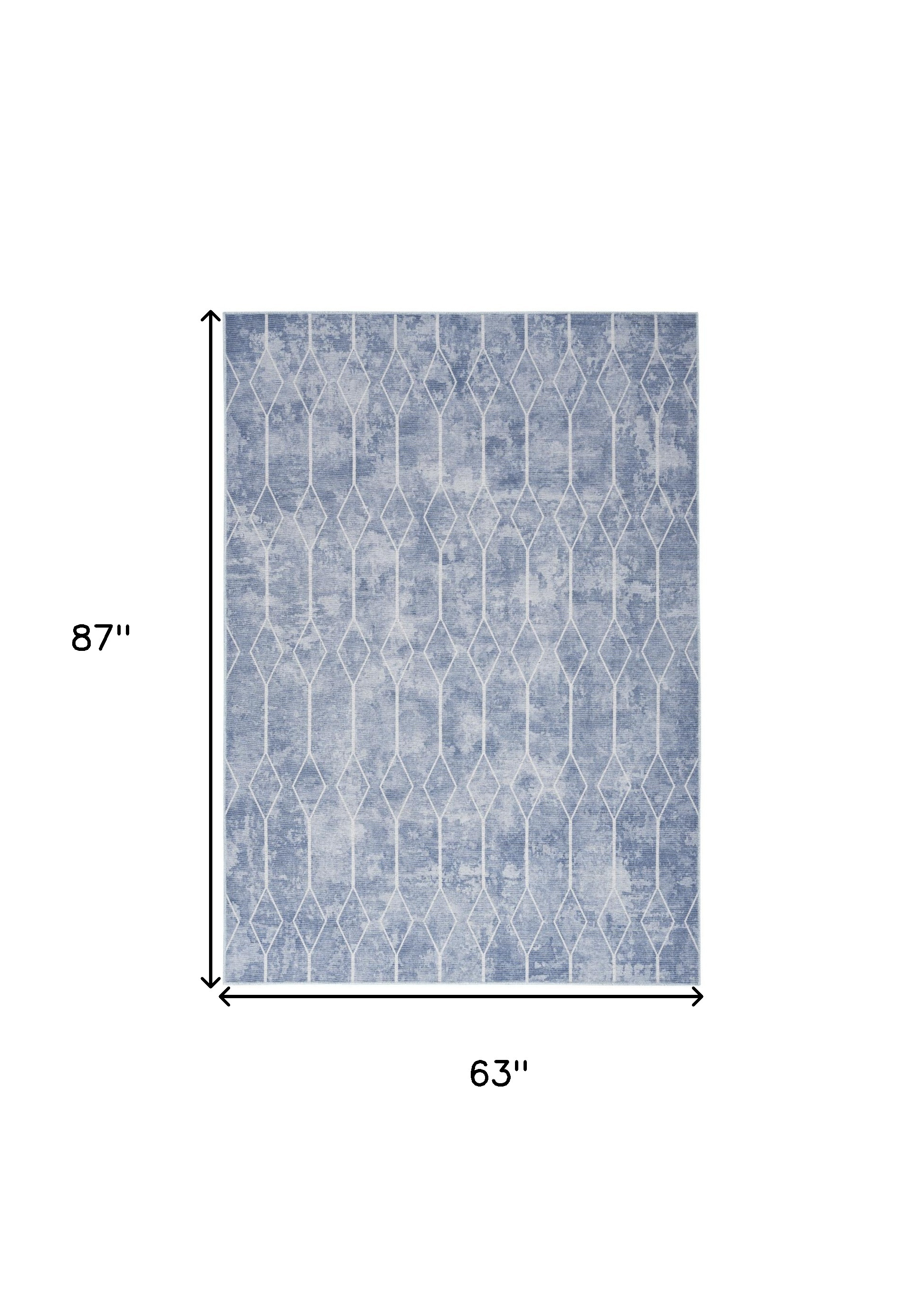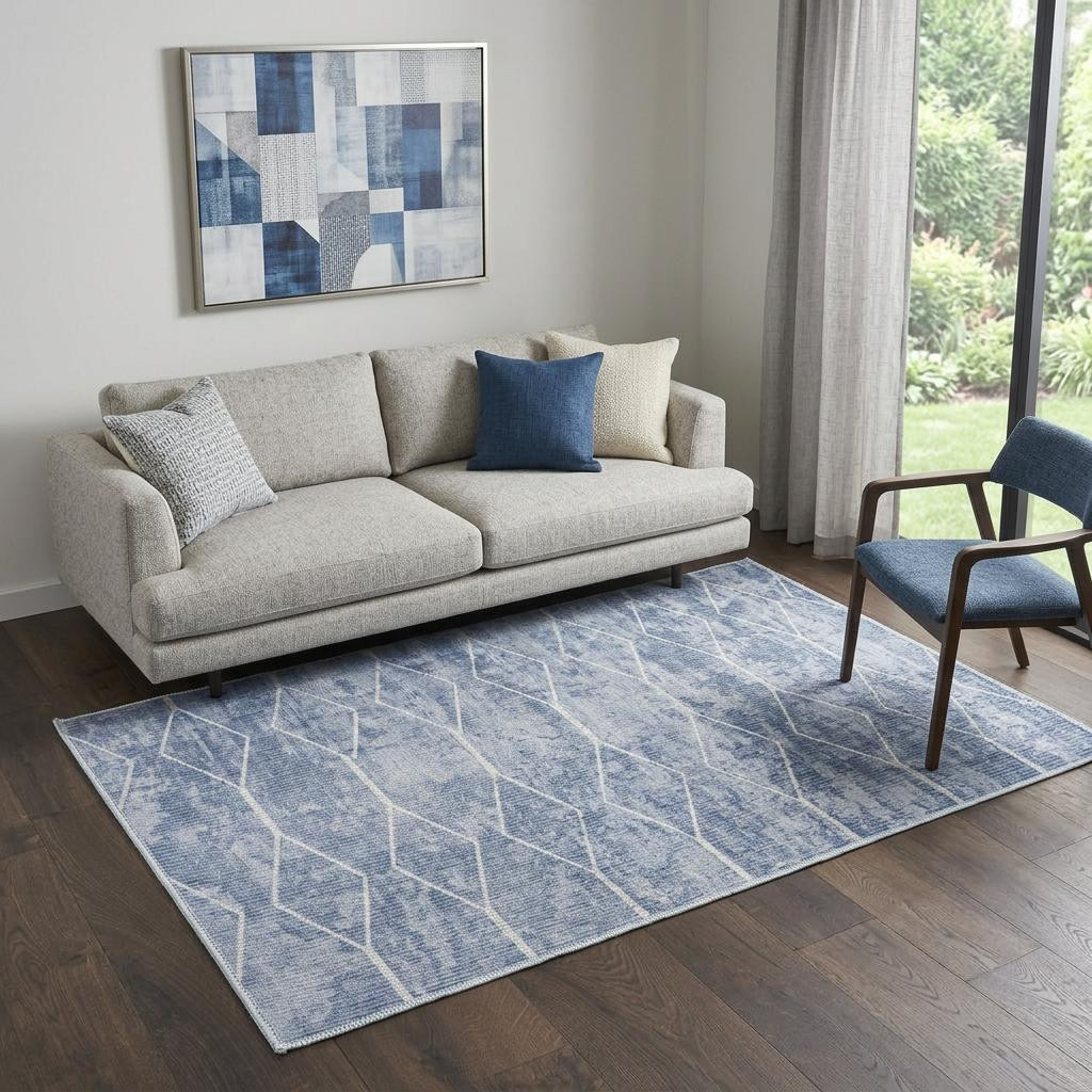 This 5-foot x 7-foot blue and off white geometric power loom washable area rug, is a great way to add warmth to a room. This rectangle shaped rug features a geometric design in blue and off white to give it visual interest. A classic shape marries with good looking design for your space Place this area rug against a hardwood or tile floor and it will enliven your living space with style and sophistication. 0.28-inch H x 63.00-inch W x 87.00-inch D