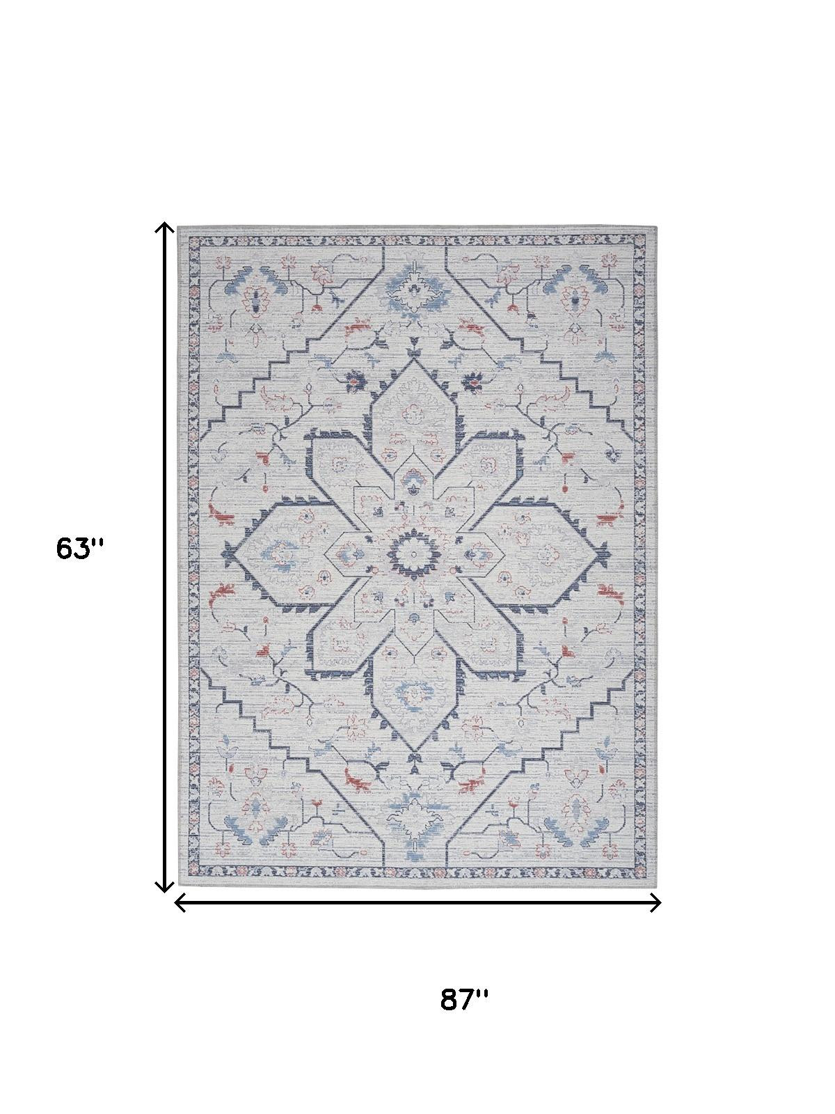 Add some artistry to your room with this 5-foot x 7-foot ivory and blue oriental power loom washable area rug. This rectangle shaped rug features a oriental design in ivory and blue to give it visual interest. A classic shape marries with good looking design for your space Area Rugs help to give warmth and sense of home to your space. 0.28-inch H x 63.00-inch W x 87.00-inch D