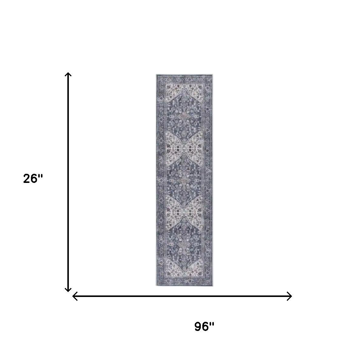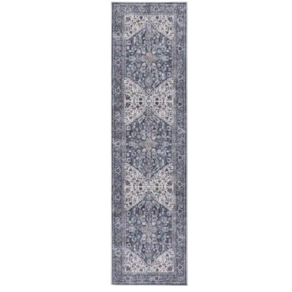Add some artistry to your room with this 8-foot blue and ivory floral power loom distressed washable runner rug. This runner shaped rug features a floral design in blue and ivory to give it visual interest. A classic shape marries with good looking design for your space Area Rugs help to give warmth and sense of home to your space. 0.28-inch H x 26.00-inch W x 96.00-inch D