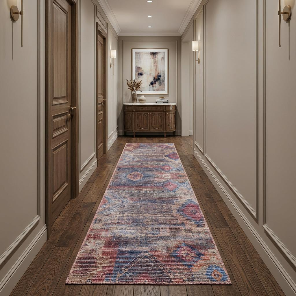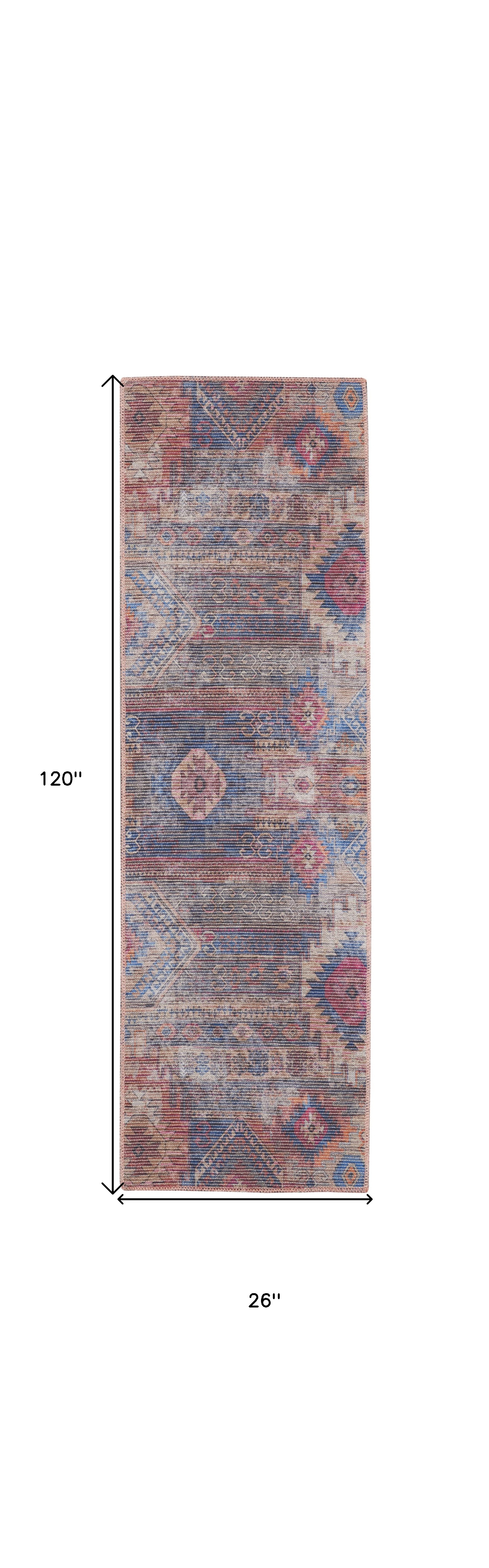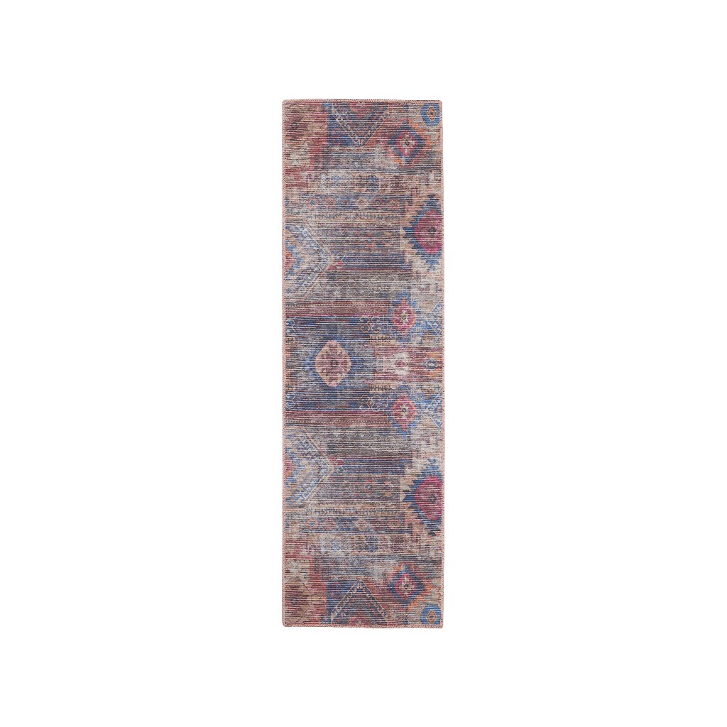 Set an inviting tone in your space with this 10-foot blue and red geometric power loom distressed washable runner rug. This runner shaped rug features a geometric design in blue and red to give it visual interest. A classic shape marries with good looking design for your space Area Rugs help to give warmth and sense of home to your space. 0.28-inch H x 26.00-inch W x 120.00-inch D