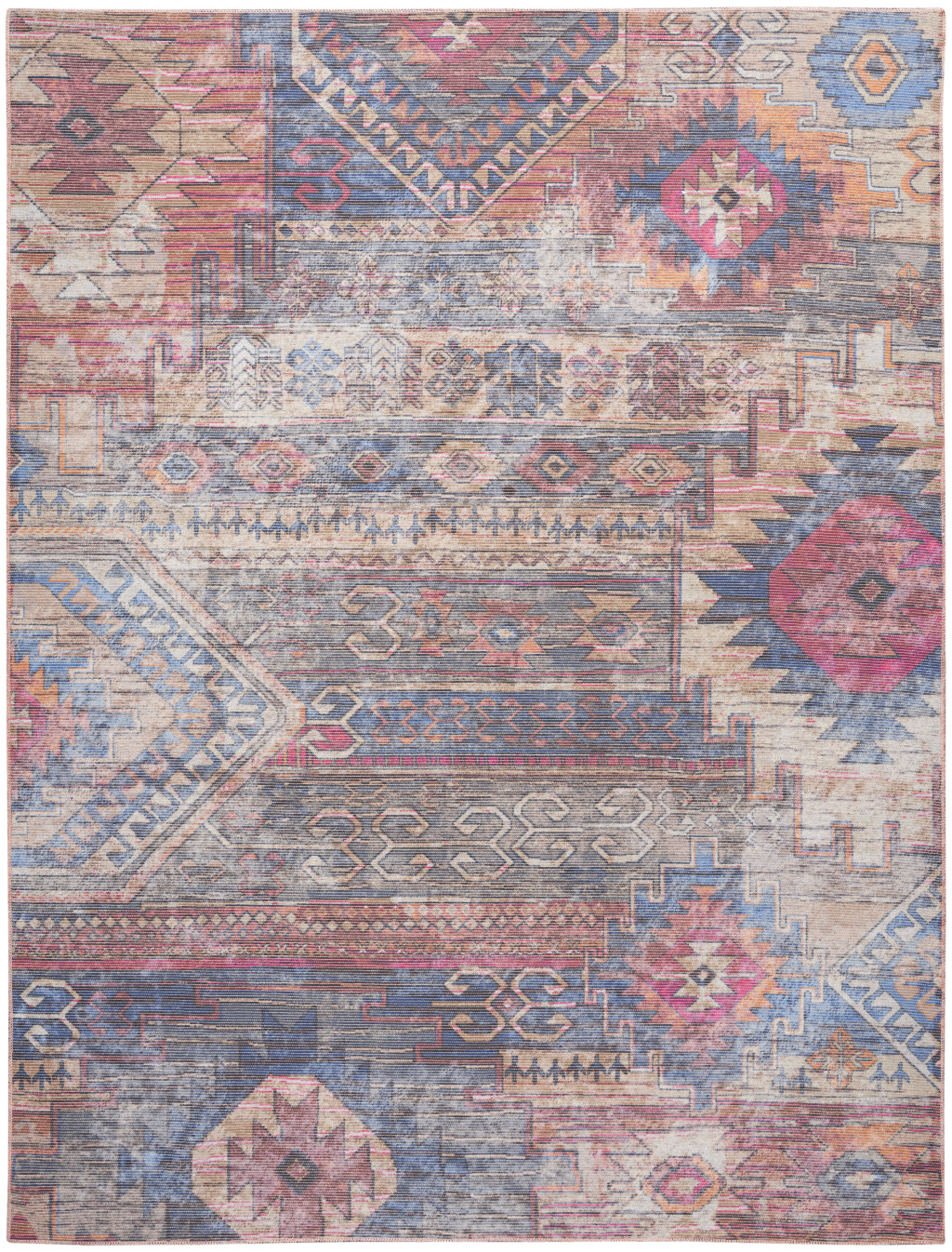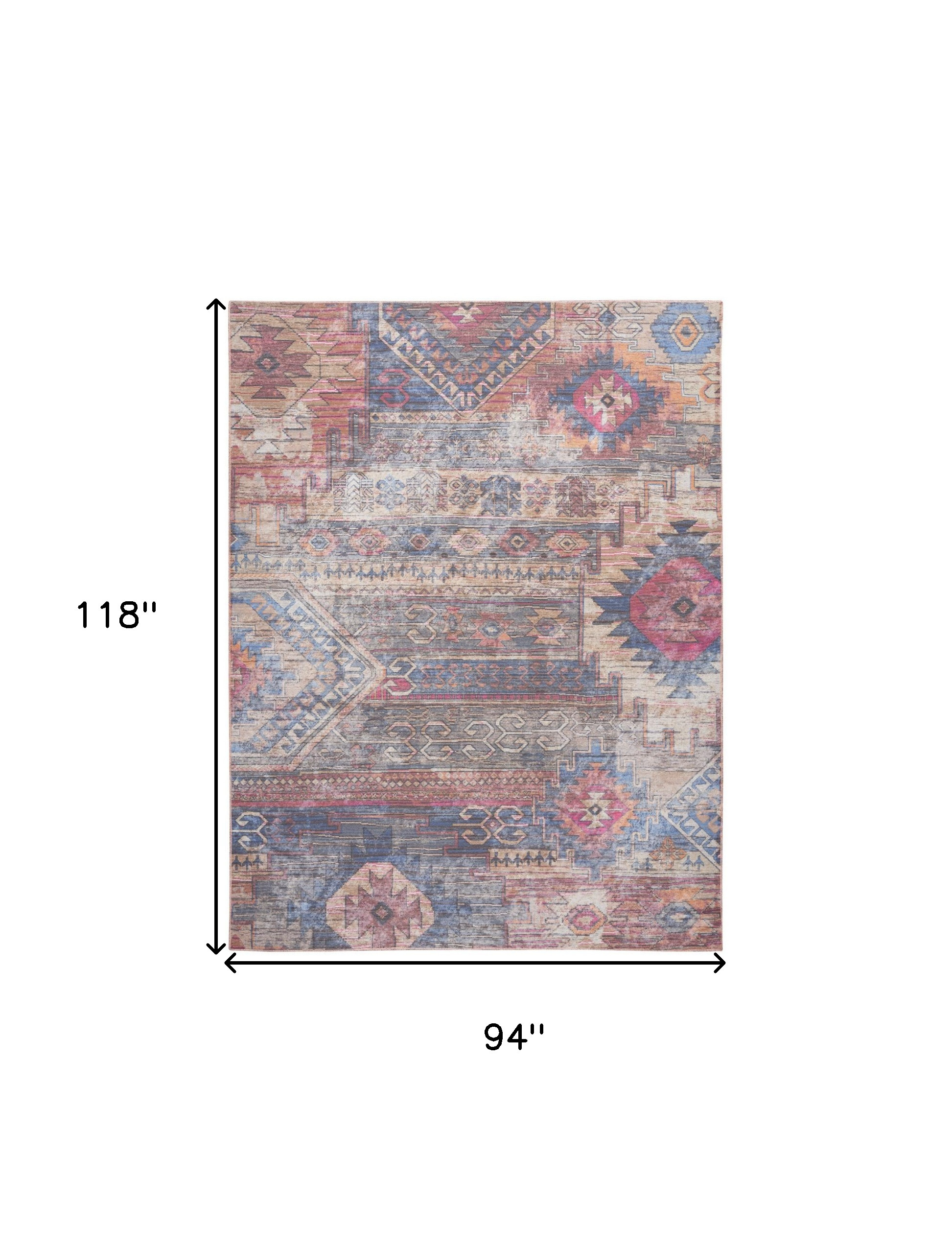 Add some artistry to your room with this 8-foot x 10-foot blue and red geometric power loom distressed washable area rug. This rectangle shaped rug features a geometric design in blue and red to give it visual interest. A classic shape marries with good looking design for your space Area Rugs help to give warmth and sense of home to your space. 0.28-inch H x 94.00-inch W x 118.00-inch D