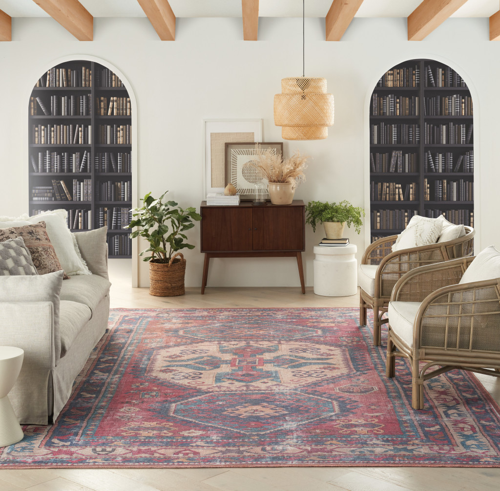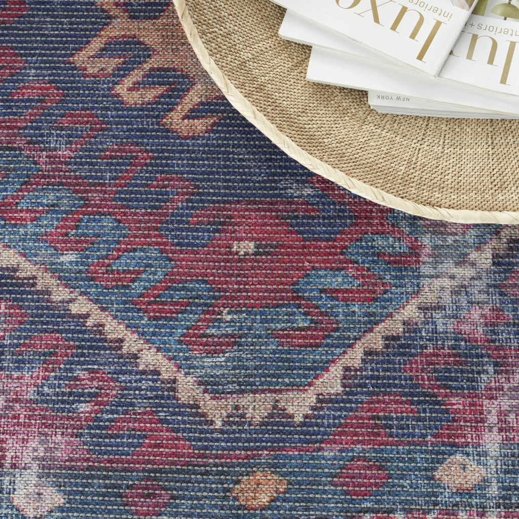 This 8-foot x 10-foot blue and red geometric power loom distressed washable area rug, is a great way to add warmth to a room. This rectangle shaped rug features a geometric design in blue and red to give it visual interest. A classic shape marries with good looking design for your space Area Rugs help to give warmth and sense of home to your space. 0.28-inch H x 94.00-inch W x 118.00-inch D