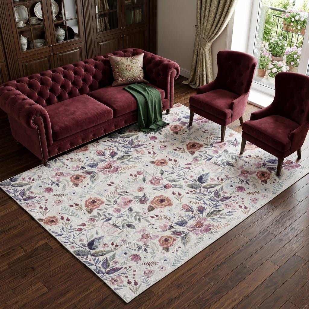 washable non skid area rug, skid area rug, non skid area rug, loom washable non skid area, ivory pink green floral power |