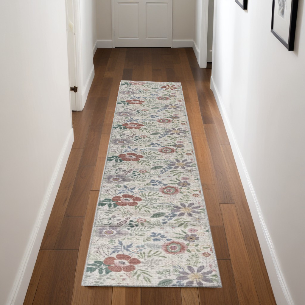 Add some artistry to your room with this 8-foot cream floral washable runner rug. Rugs are a great way to showcase your style, hide imperfections, warm your home and reduce noise. This rectangular shaped rug features a abstract design that will add a functional and decorative accent to your space. This traditional style runner makes a great accent for the hallway, in front of cabinets, in the laundry room, or any other space you need a narrow and long rug. 26-inch h x 96-inch w x 0.25-inch d.