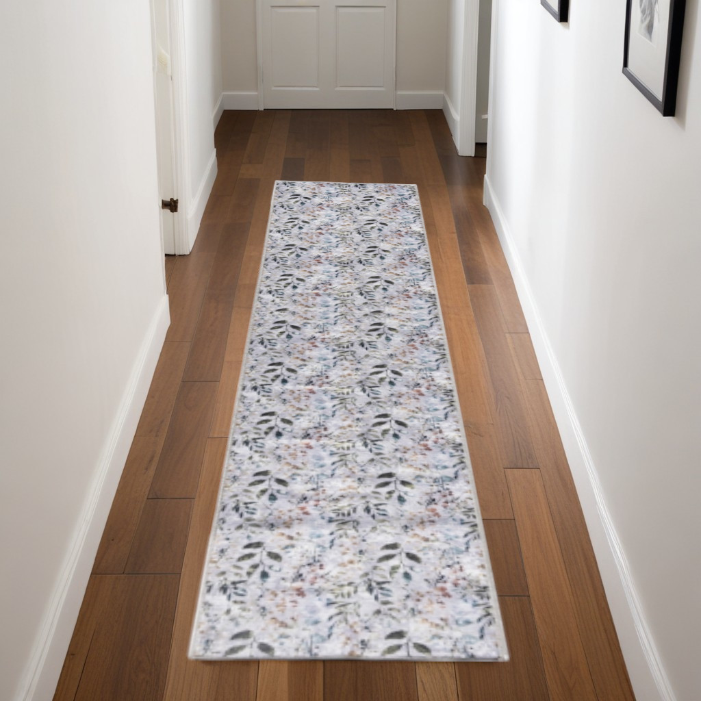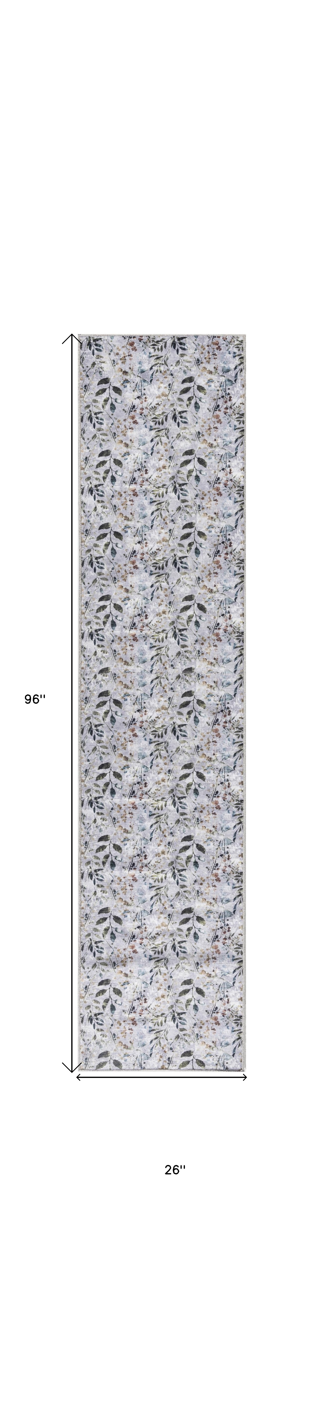 Add some artistry to your room with this 8-foot gray and blue floral washable runner rug. Rugs are a great way to showcase your style, hide imperfections, warm your home and reduce noise. This rectangular shaped rug features a abstract design that will add a functional and decorative accent to your space. This contemporary style runner makes a great accent for the hallway, in front of cabinets, in the laundry room, or any other space you need a narrow and long rug. 26-inch h x 96-inch w x 0.25-inch d.