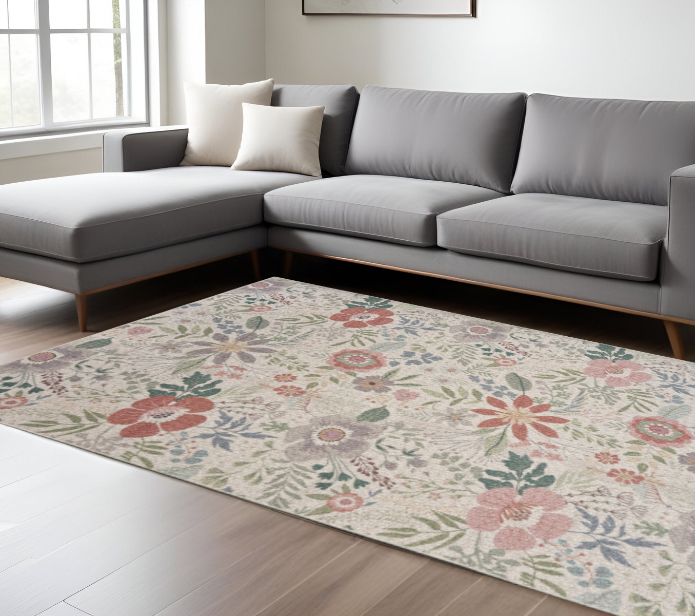 floral washable area rug, green floral washable area rug, washable area rug, pink green floral washable area, 9' X 12' cream pink |