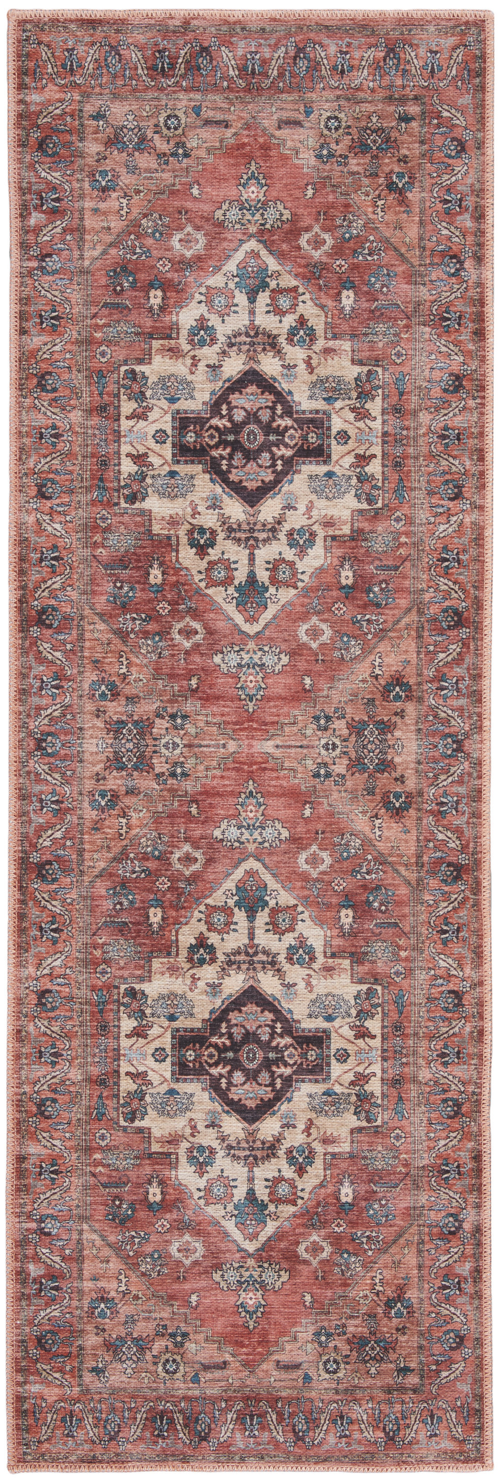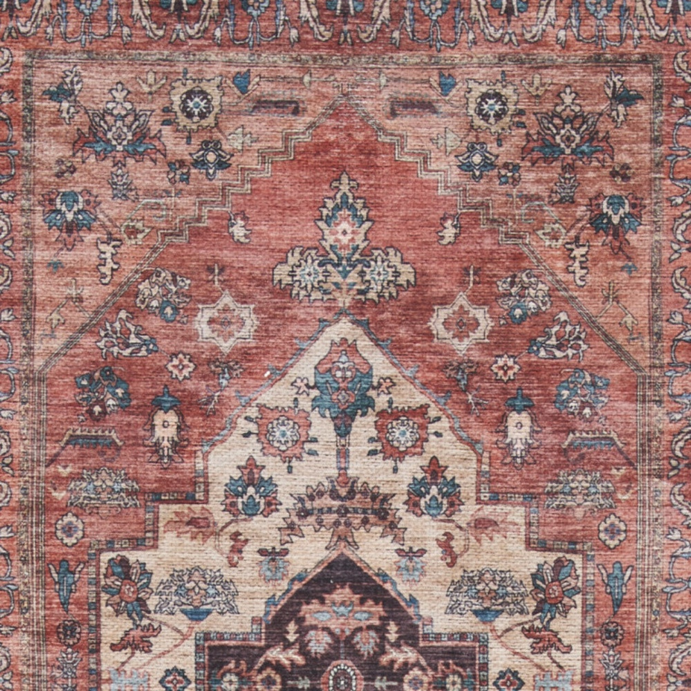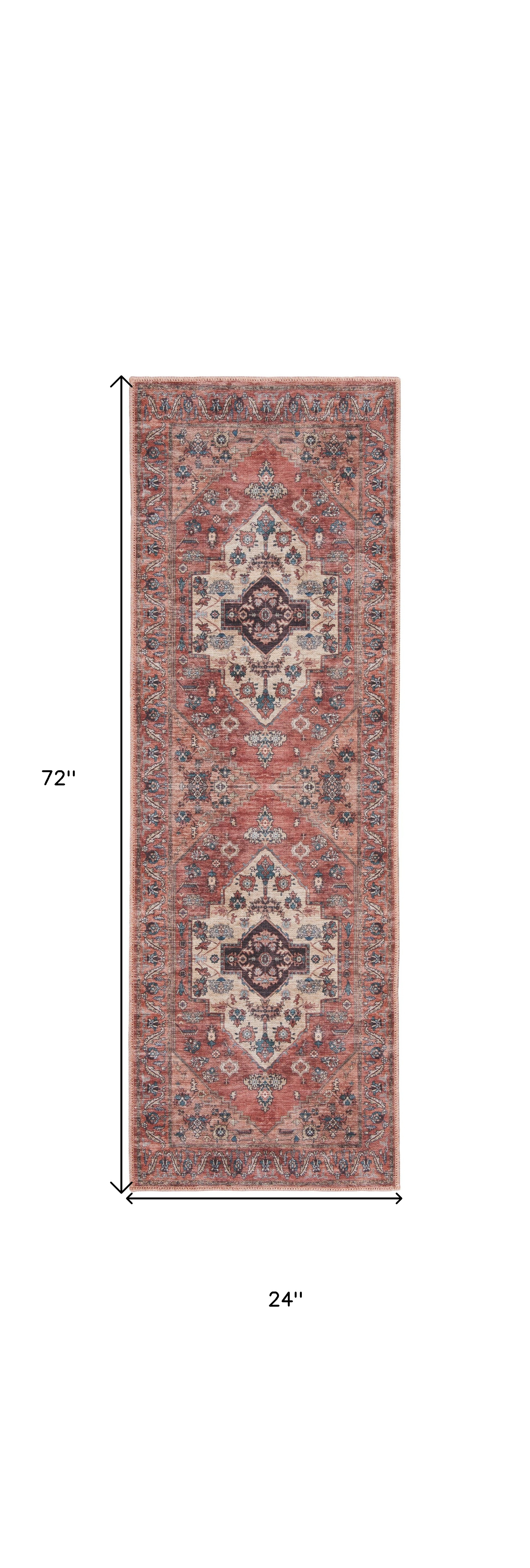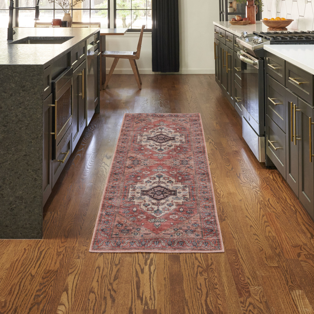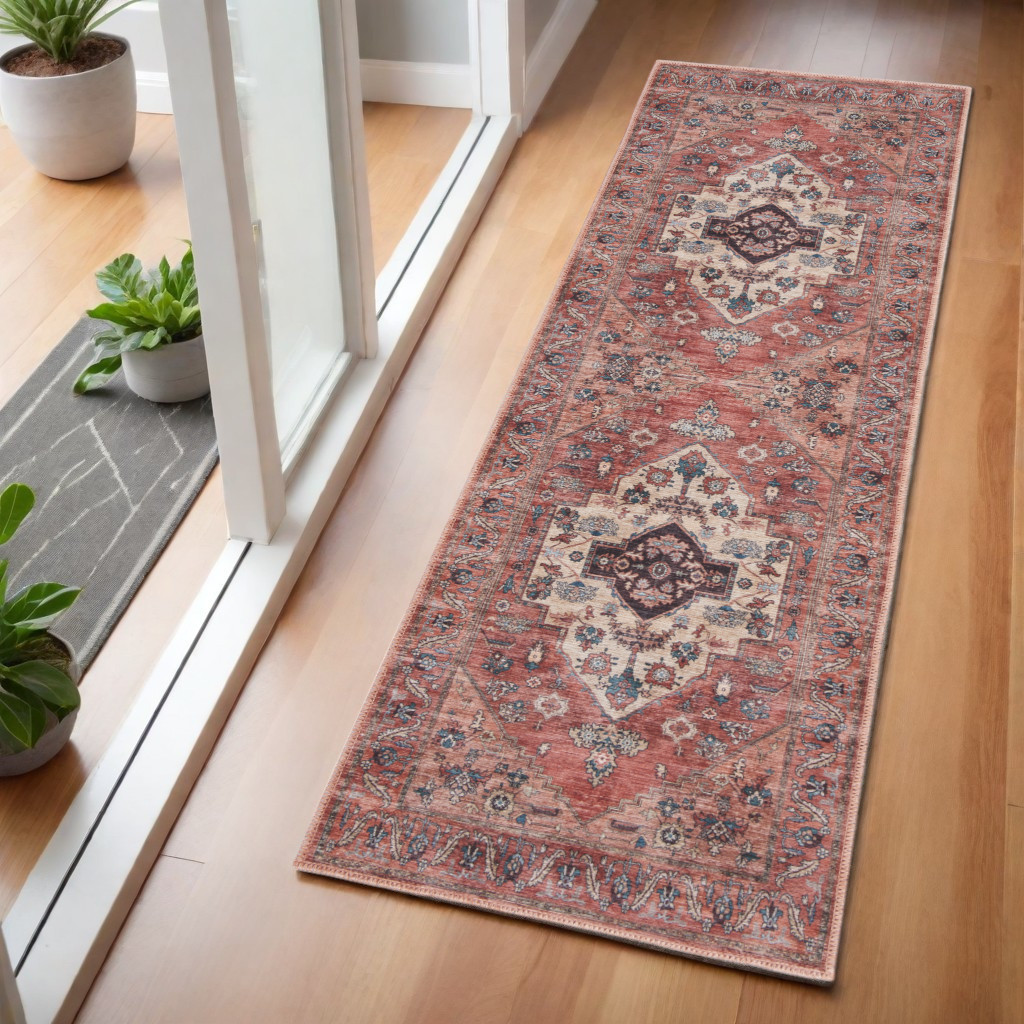 Add some artistry to your room with this 6-foot red and ivory oriental distressed washable runner rug. Built to last, this rug crafted from polyester fibers is known for its durability and long lasting appeal. Rugs are a great way to showcase your style, hide imperfections, warm your home and reduce noise. This rectangular shaped rug features a abstract design that will add a functional and decorative accent to your space. This traditional style runner makes a great accent for the hallway, in front of cabinets, in the laundry room, or any other space you need a narrow and long rug. 24-inch h x 72-inch w x 0.25-inch d.