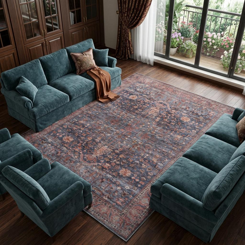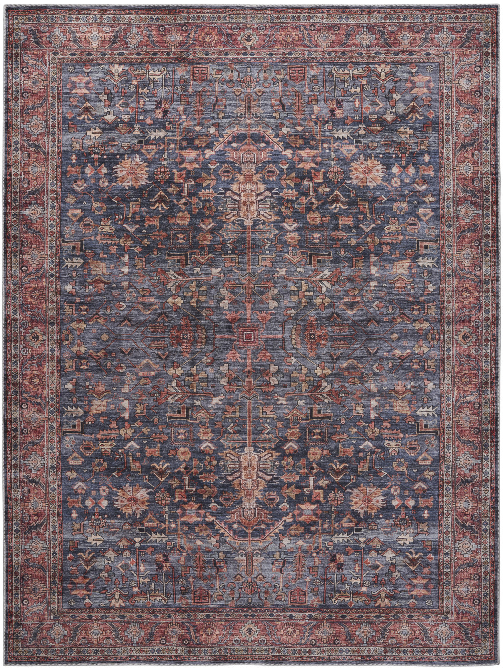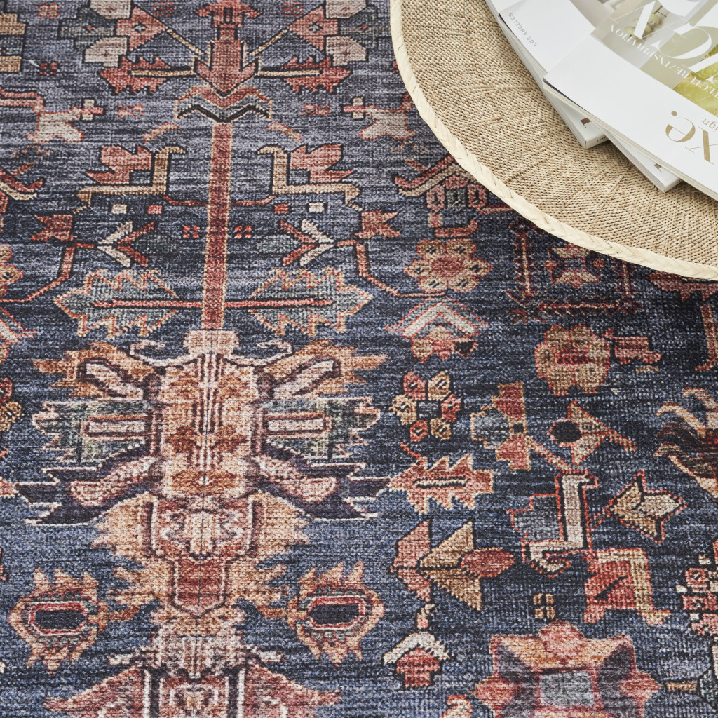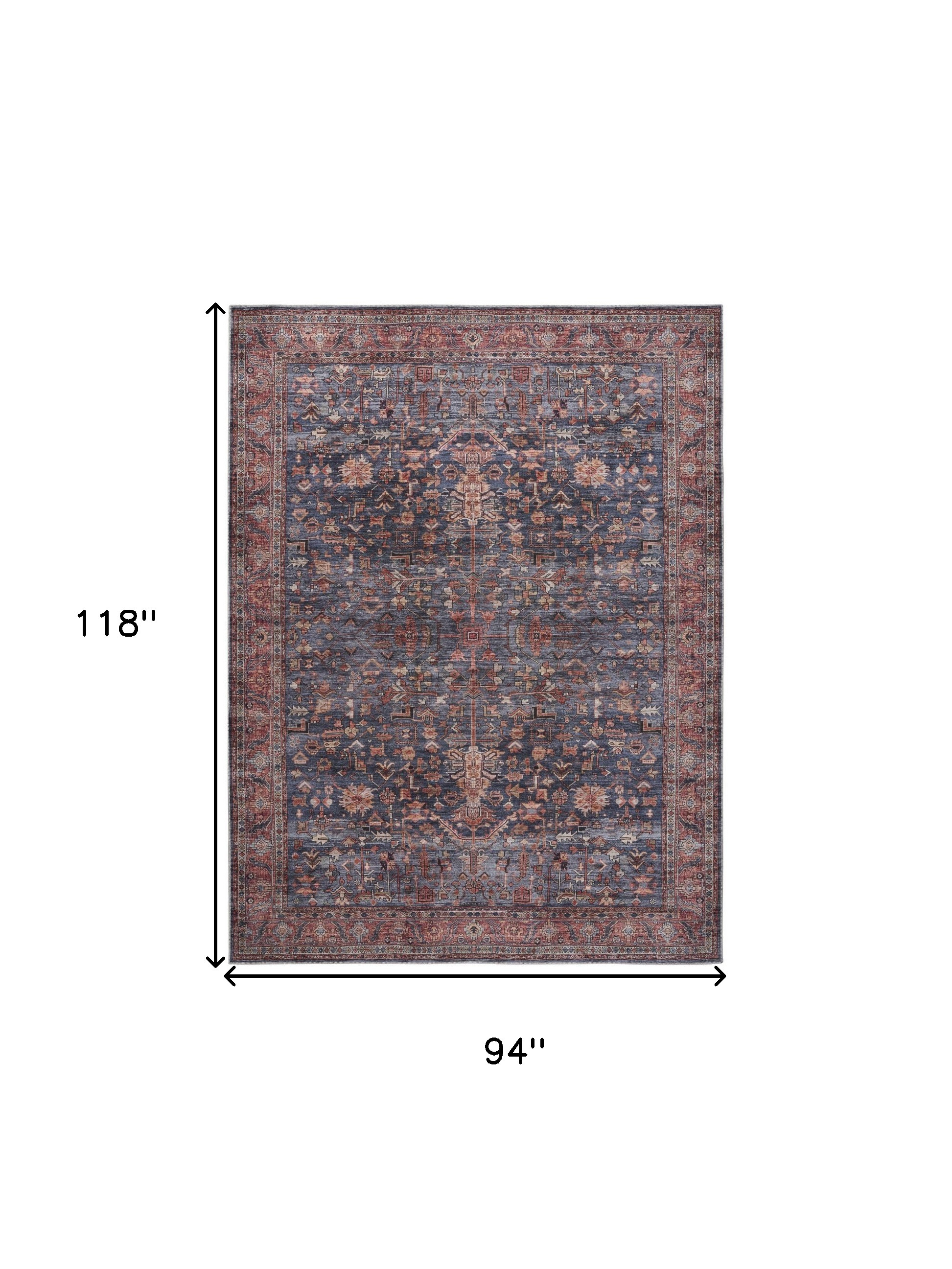 This 8-foot x 10-foot blue and red oriental power loom distressed washable non skid area rug, is a great way to add warmth to a room. This rectangle shaped rug features a oriental design in blue and red to give it visual interest. A classic shape marries with good looking design for your space Place this area rug against a hardwood or tile floor and it will enliven your living space with style and sophistication. .25-inch H x 94.00-inch W x 118.00-inch D
