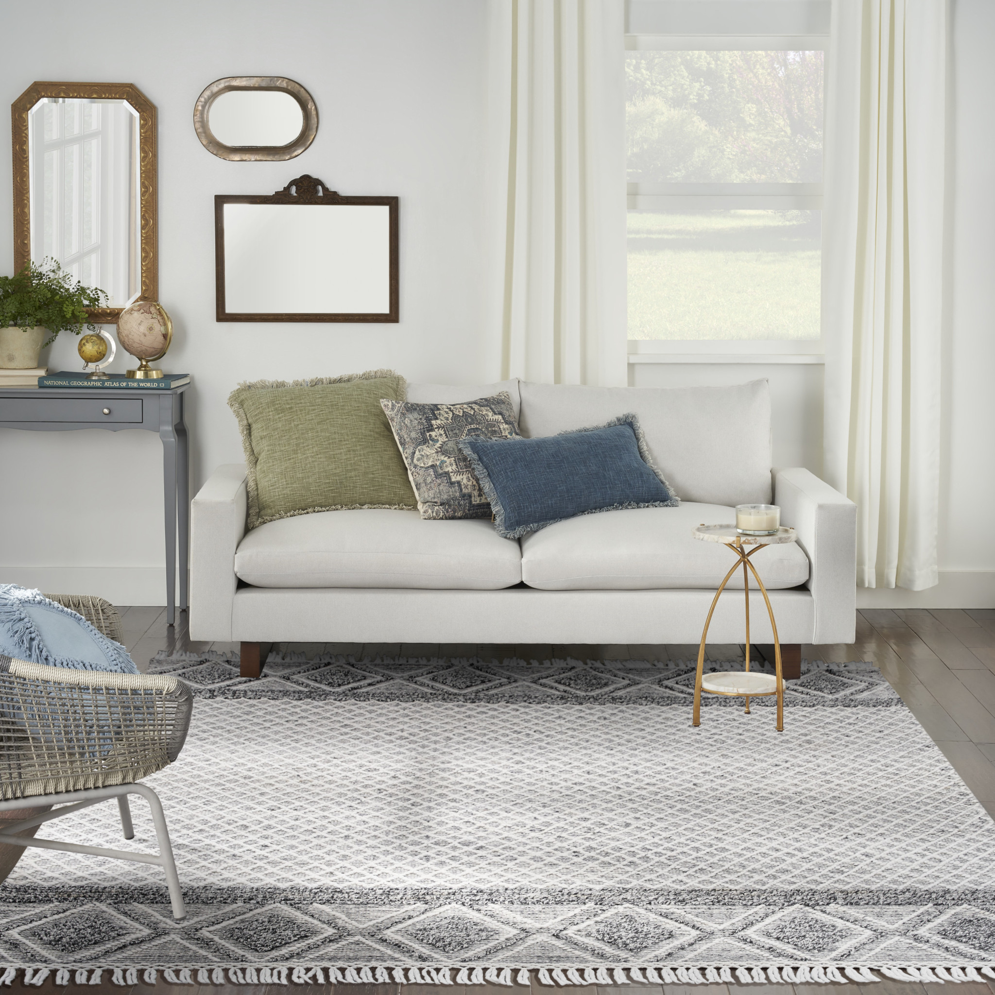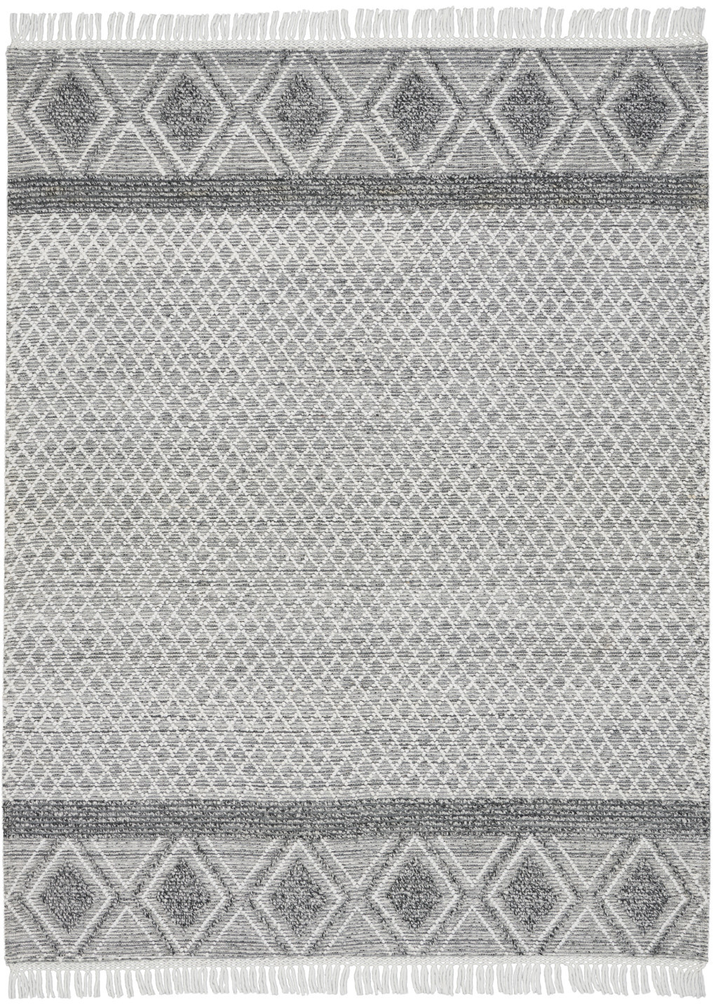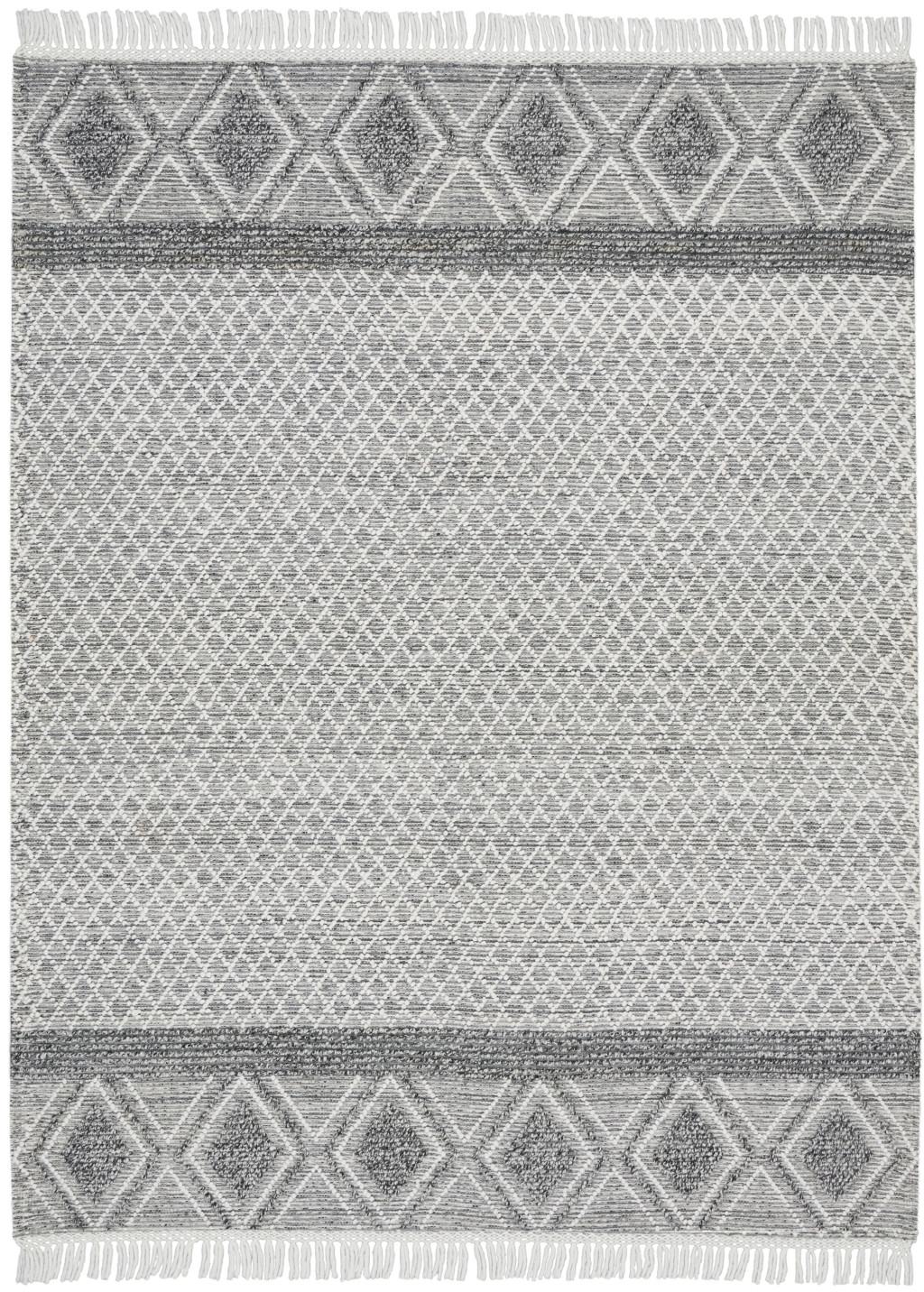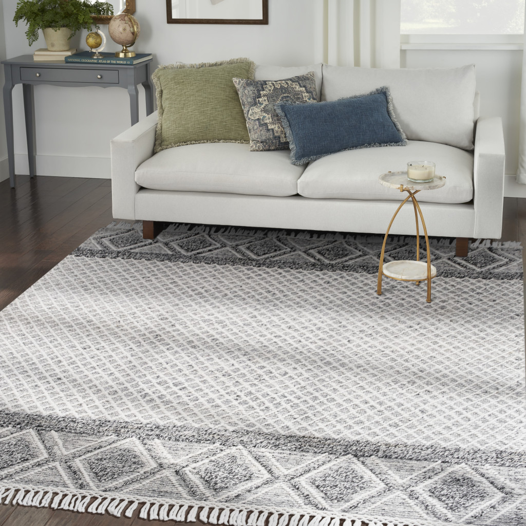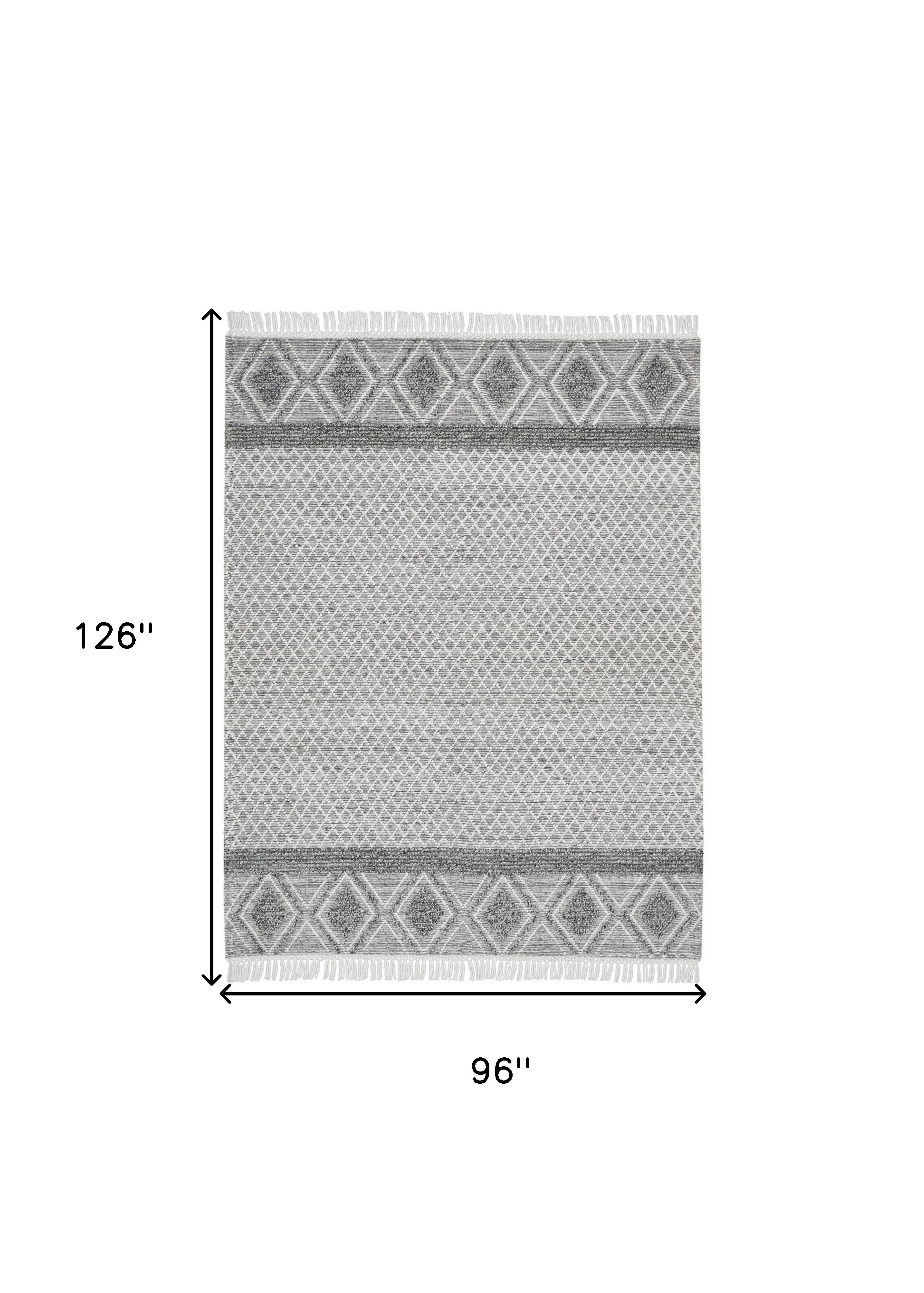 Add some artistry to your room with this 8-foot x 11-foot gray and ivory geometric hand woven area rug with fringe. This rectangle shaped rug features a geometric design in gray and ivory to give it visual interest. A classic shape marries with good looking design for your space Tassel ends bring a timeless and fashionable look to your interior. Crafted by skilled artisans, this hand woven rug is genuine and unique. No two will be exactly alike. Place this area rug against a hardwood or tile floor and it will enliven your living space with style and sophistication. .50-inch H x 96.00-inch W x 126.00-inch D