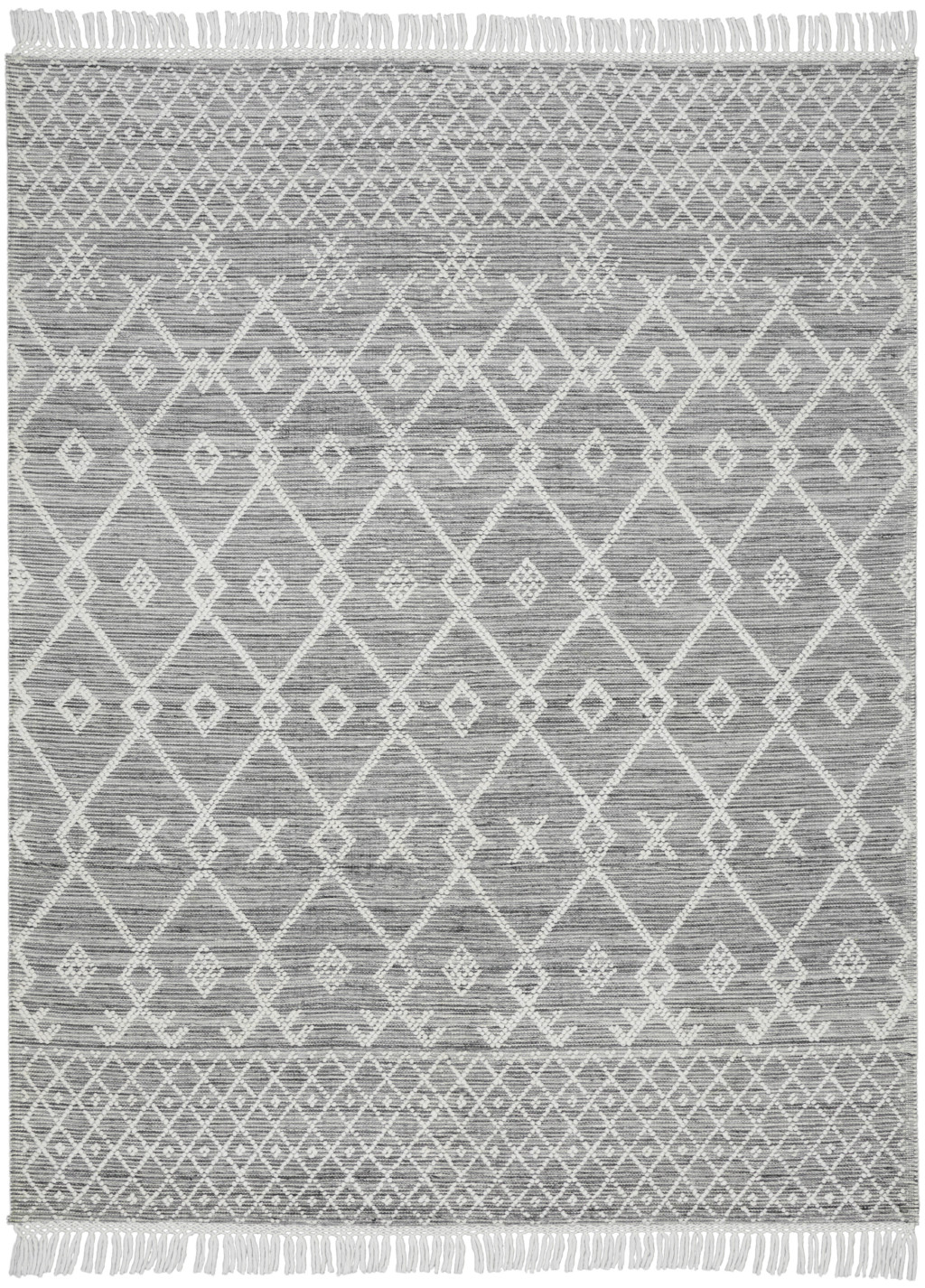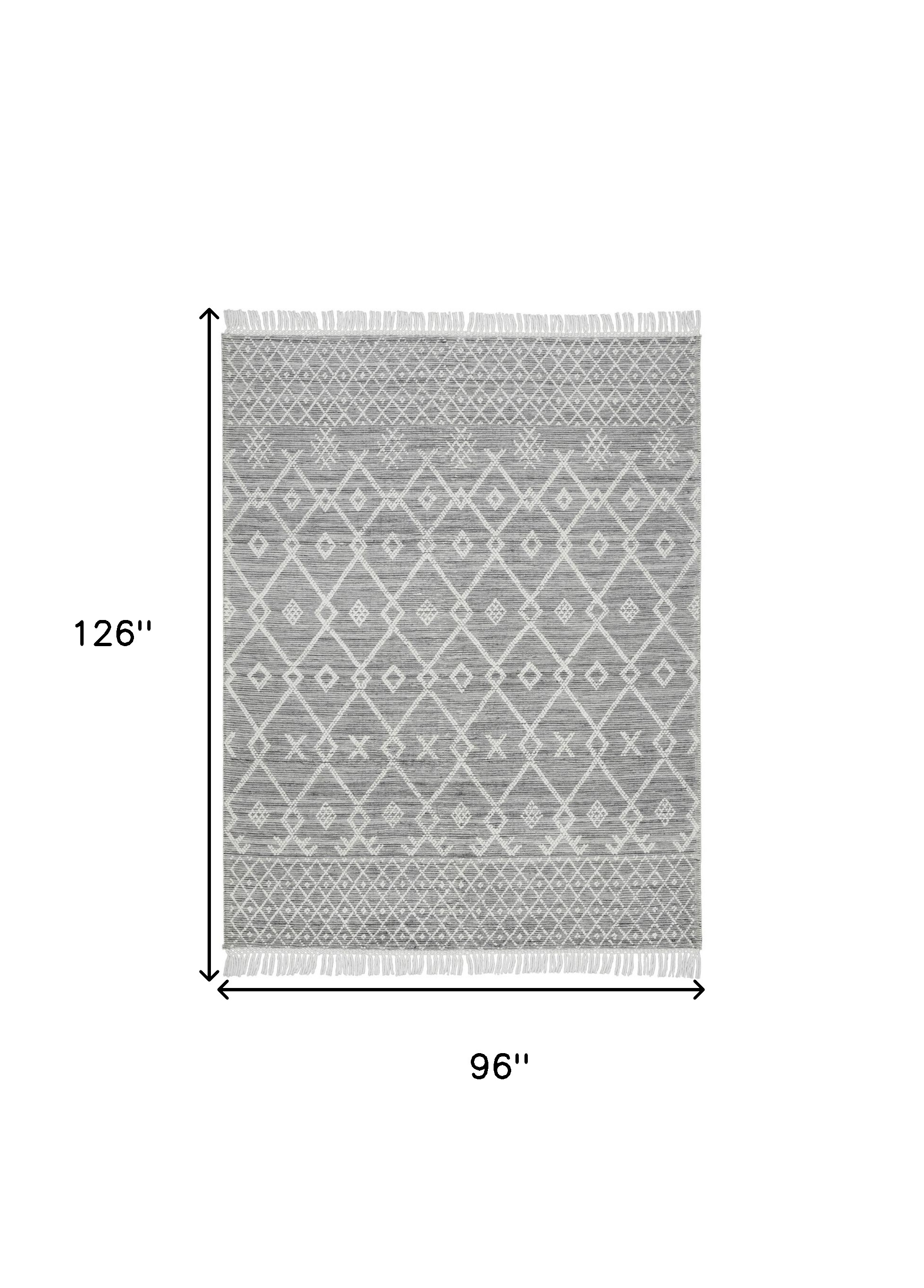This 8-foot x 11-foot gray and ivory geometric hand woven area rug with fringe, is a great way to add warmth to a room. This rectangle shaped rug features a geometric design in gray and ivory to give it visual interest. A classic shape marries with good looking design for your space Tassel ends bring a timeless and fashionable look to your interior. Crafted by skilled artisans, this hand woven rug is genuine and unique. No two will be exactly alike. Place this area rug against a hardwood or tile floor and it will enliven your living space with style and sophistication. .50-inch H x 96.00-inch W x 126.00-inch D