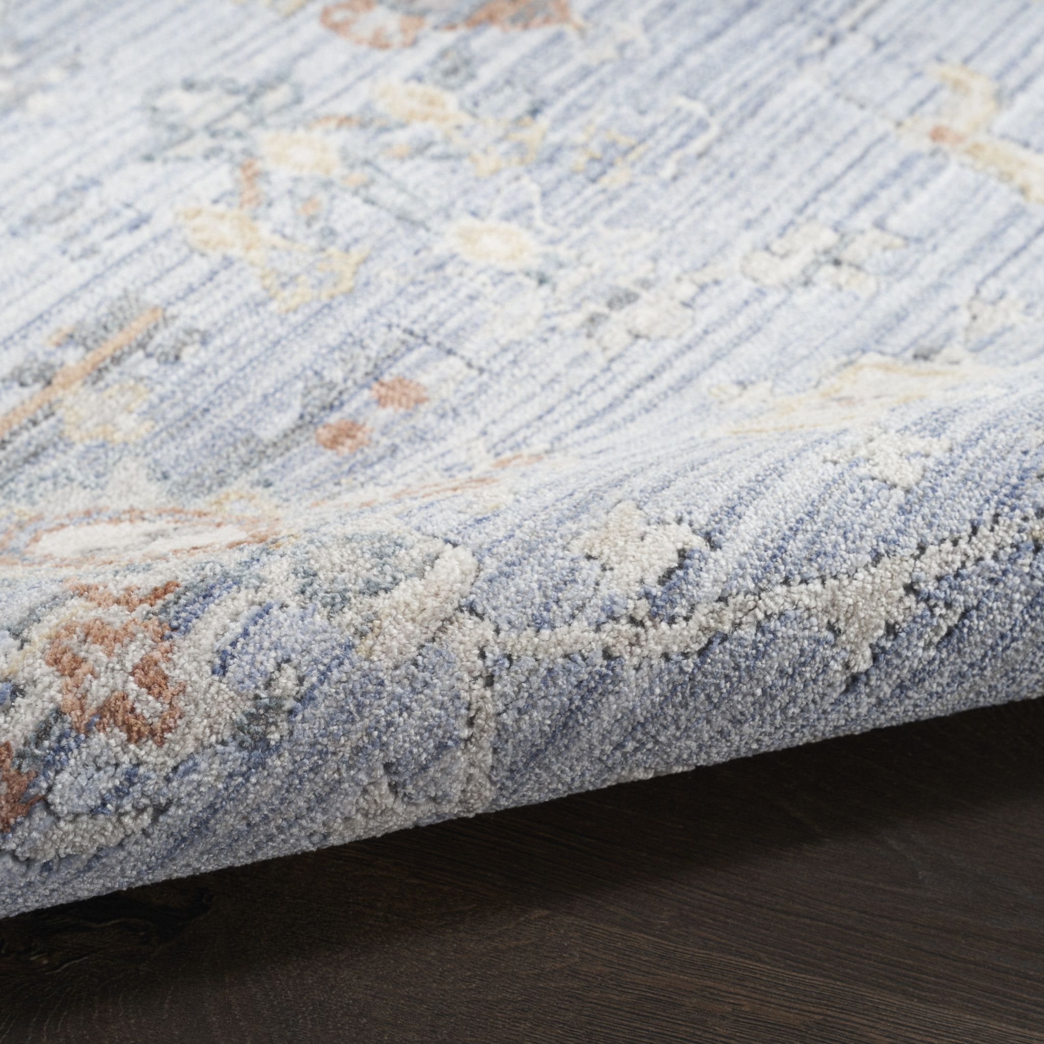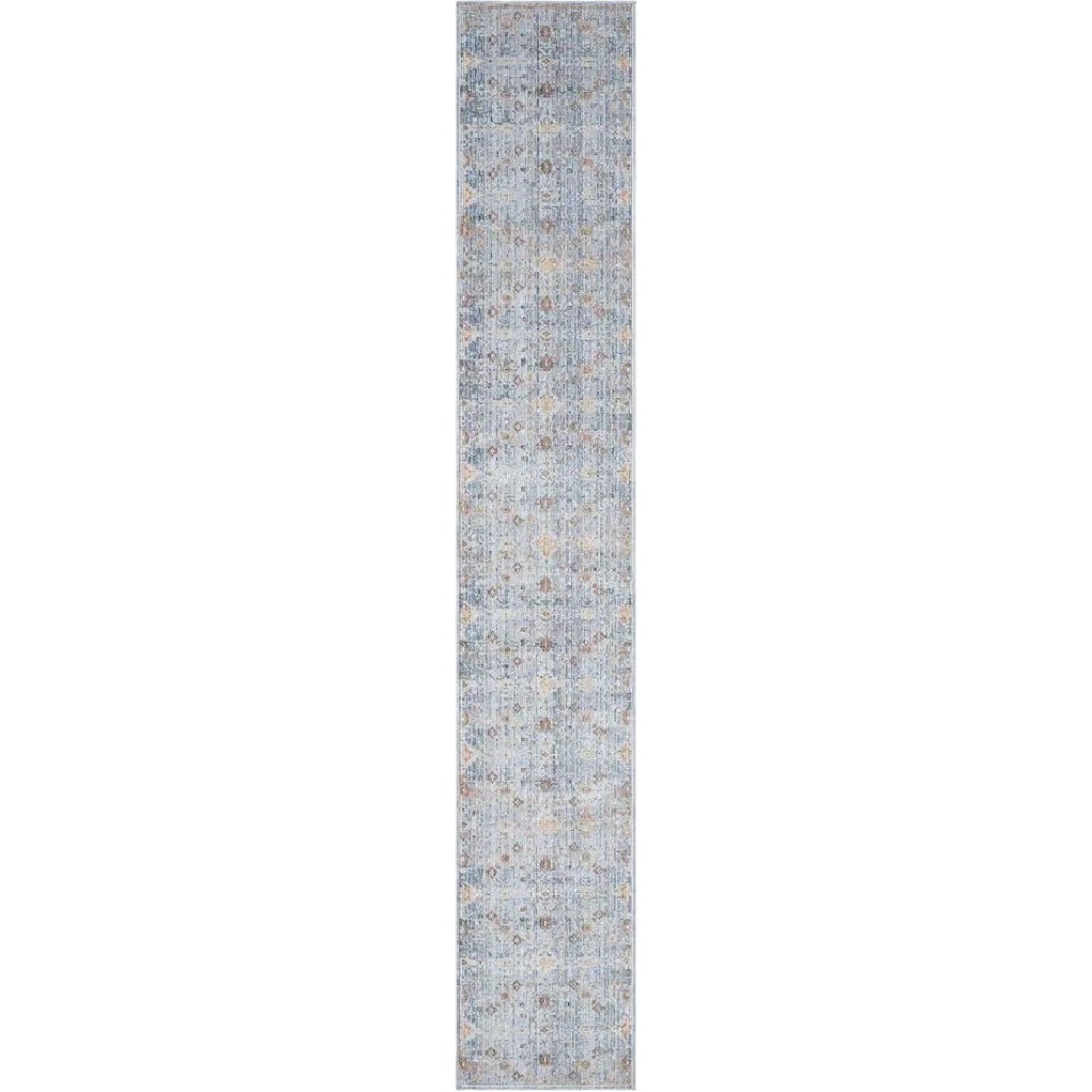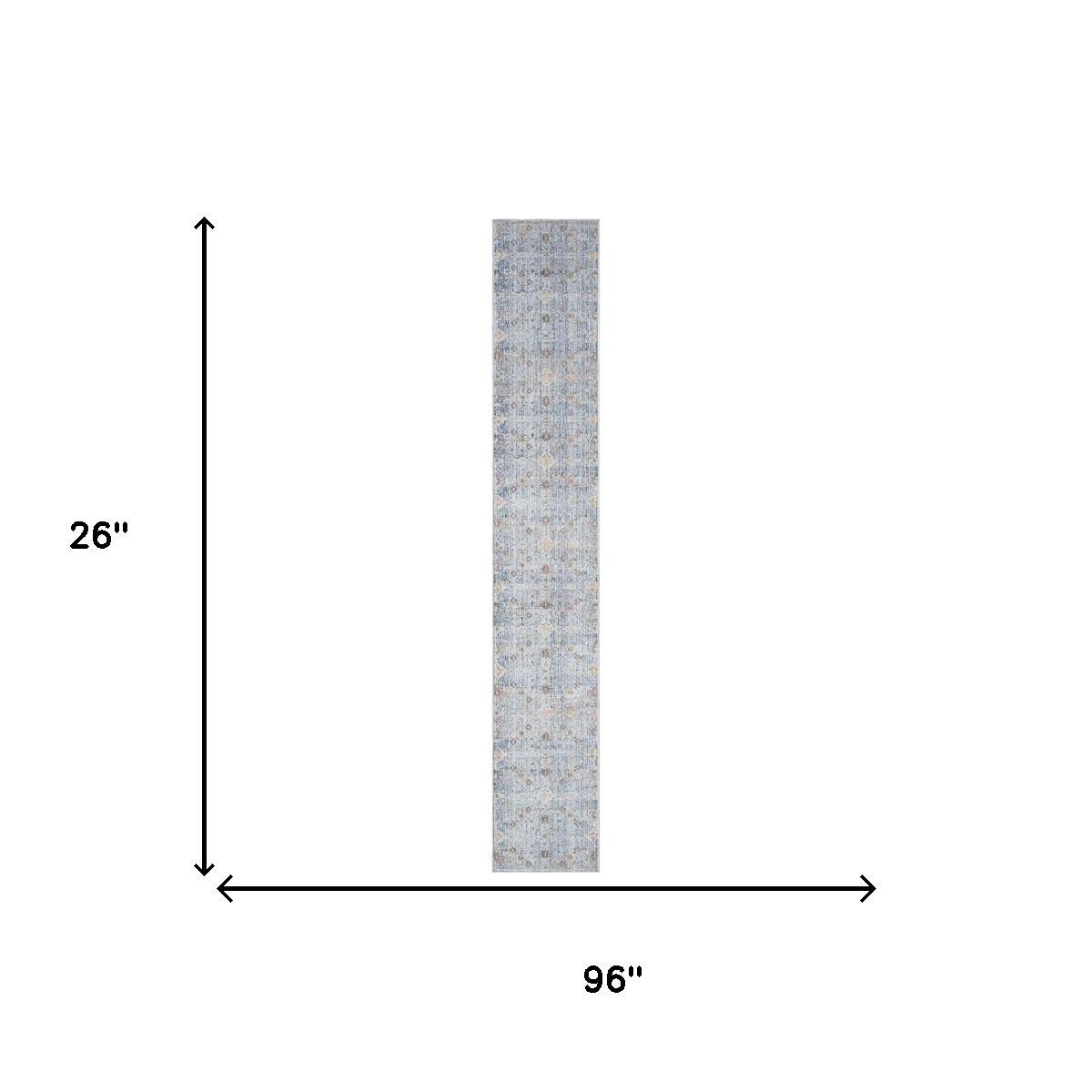 Set an inviting tone in your space with this 8-foot blue and ivory oriental power loom distressed runner rug with fringe. This runner shaped rug features a oriental design in blue and ivory to give it visual interest. A classic shape marries with good looking design for your space Tassel ends bring a timeless and fashionable look to your interior. Area Rugs help to give warmth and sense of home to your space. .25-inch H x 26.00-inch W x 96.00-inch D