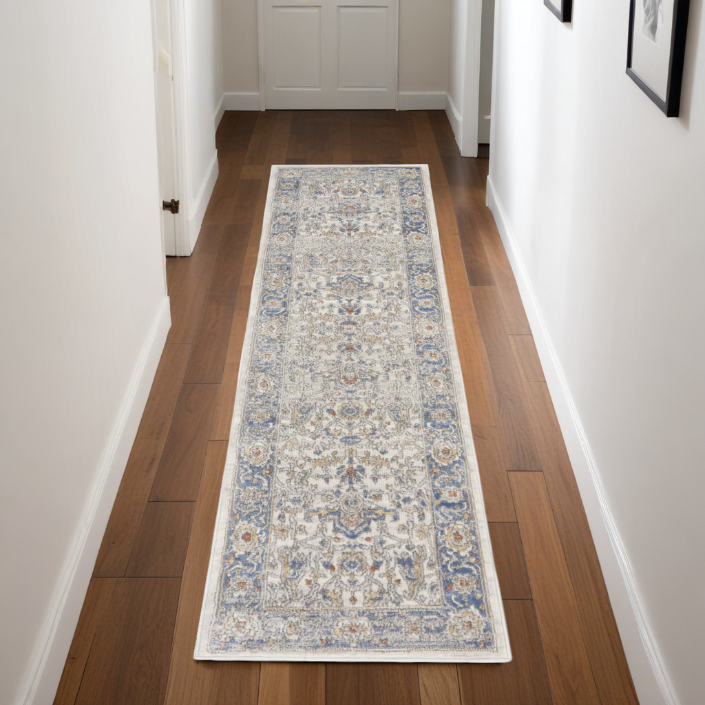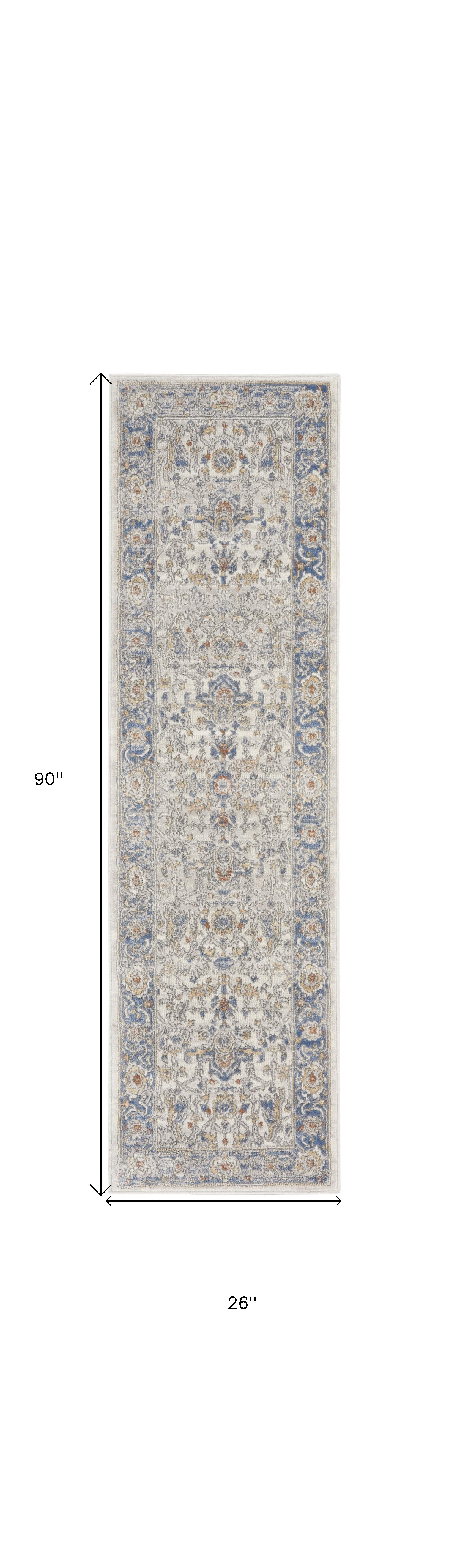 Add some artistry to your room with this 8-foot blue and ivory oriental runner rug. Built to last, this rug crafted from polypropylene and polyester fibers is known for its durability and long lasting appeal. Rugs are a great way to showcase your style, hide imperfections, warm your home and reduce noise. This rectangular shaped rug features a abstract design that will add a functional and decorative accent to your space. This persian style runner makes a great accent for the hallway, in front of cabinets, in the laundry room, or any other space you need a narrow and long rug. 26-inch h x 90-inch w x 0.5-inch d.