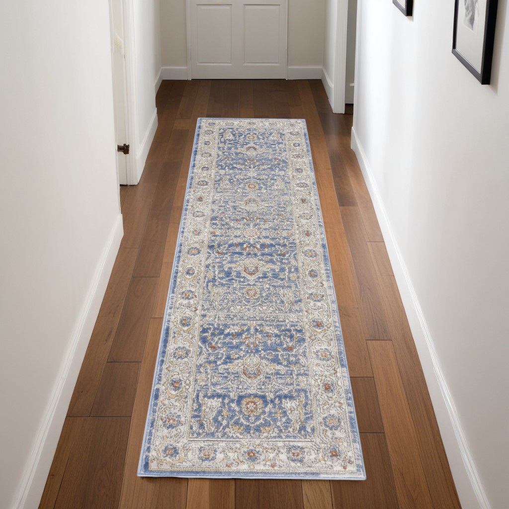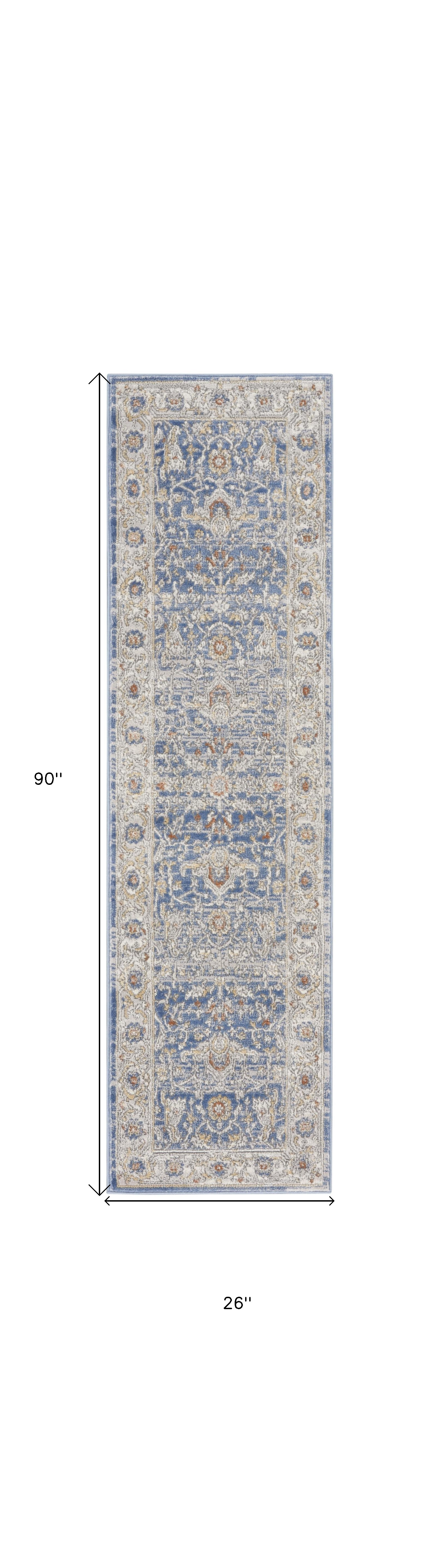 Add some artistry to your room with this 8-foot blue and gray oriental runner rug. Built to last, this rug crafted from polypropylene and polyester fibers is known for its durability and long lasting appeal. Rugs are a great way to showcase your style, hide imperfections, warm your home and reduce noise. This rectangular shaped rug features a abstract design that will add a functional and decorative accent to your space. This persian style runner makes a great accent for the hallway, in front of cabinets, in the laundry room, or any other space you need a narrow and long rug. 26-inch h x 90-inch w x 0.5-inch d.