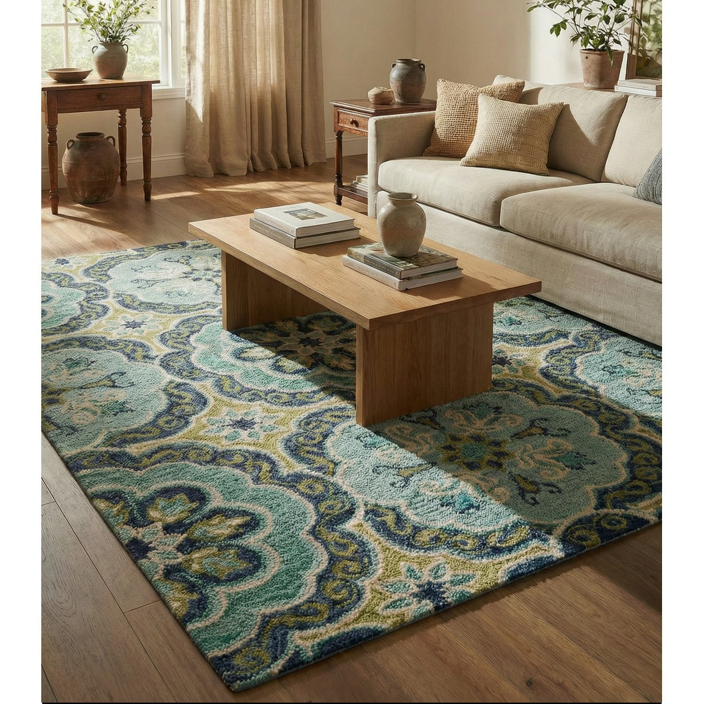 This 5-foot x 7-foot green wool floral hand tufted area rug, is a great way to add warmth to a room. This rectangle shaped rug features a floral design in green to give it visual interest. A classic shape marries with good looking design for your space Area Rugs help to give warmth and sense of home to your space. 0.5-inch H x 93-inch W x 60-inch D